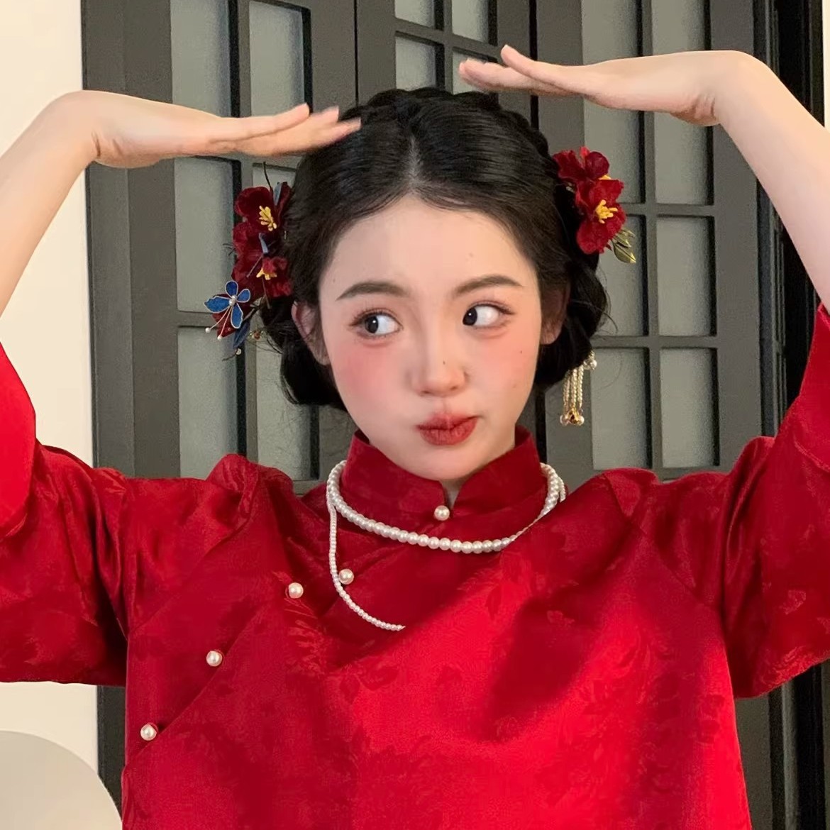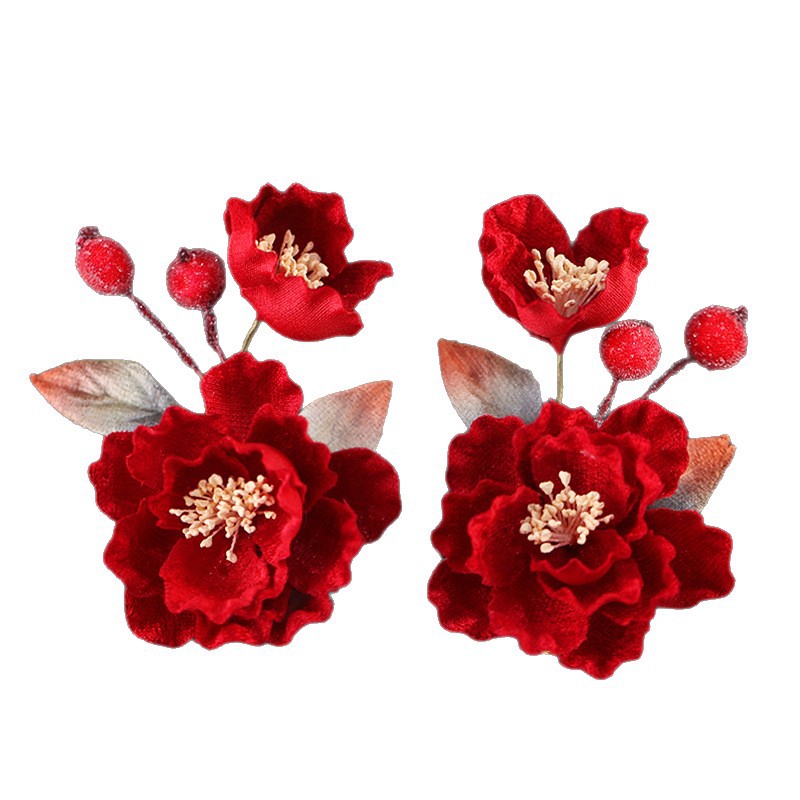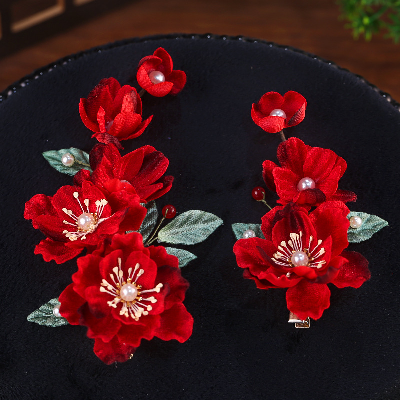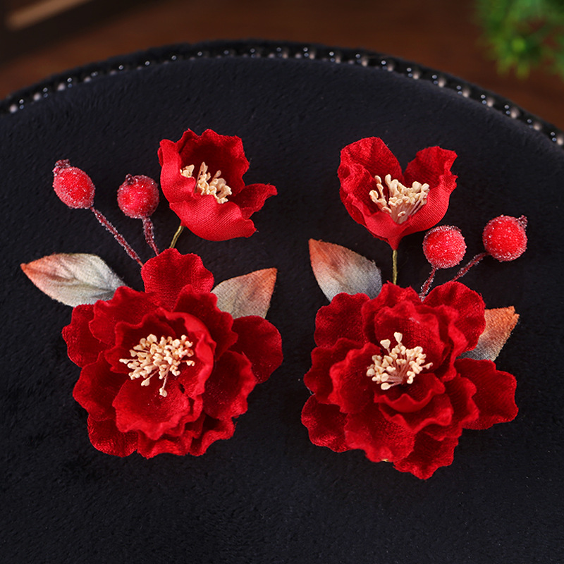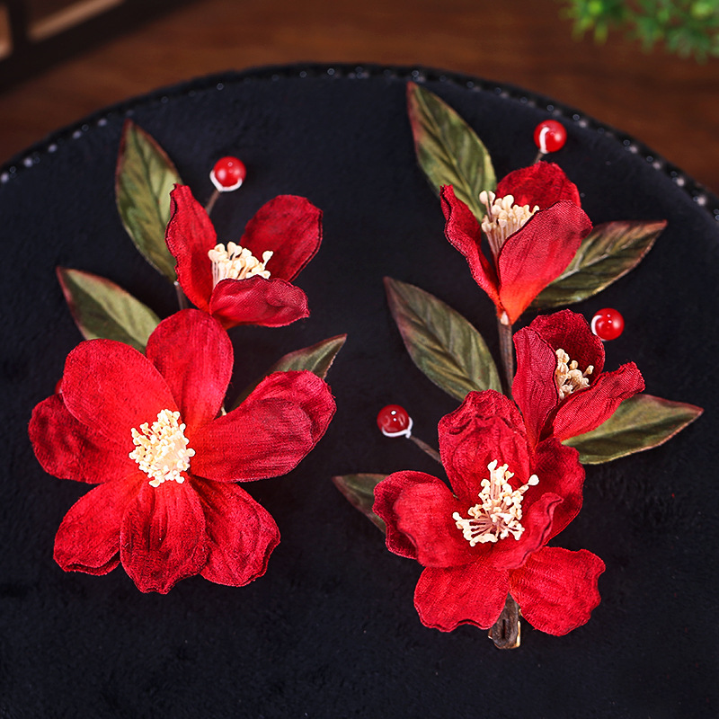 新娘红色山茶花发夹新中式旗袍敬酒服头饰马面裙低丸子头配饰发饰