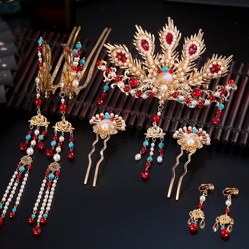 汉服头饰发簪发钗凤凰头冠年新款明制古风景泰蓝配饰烧蓝流苏发饰