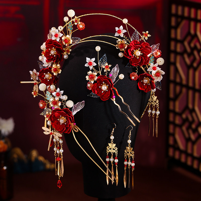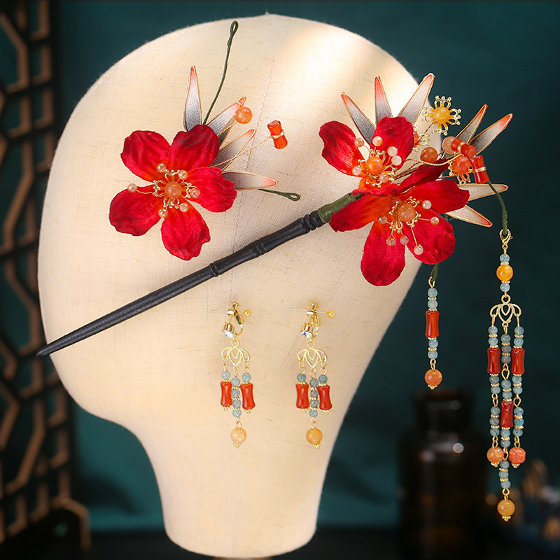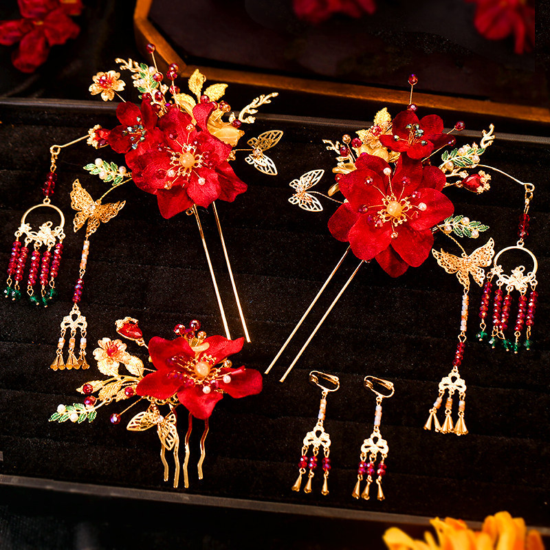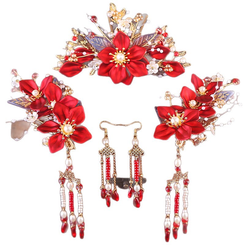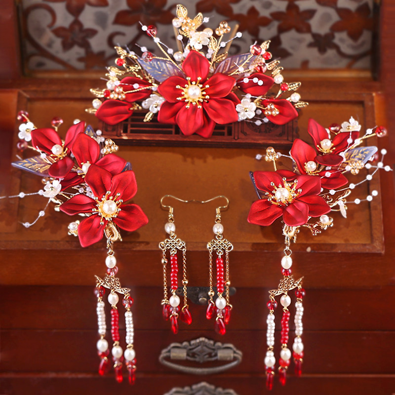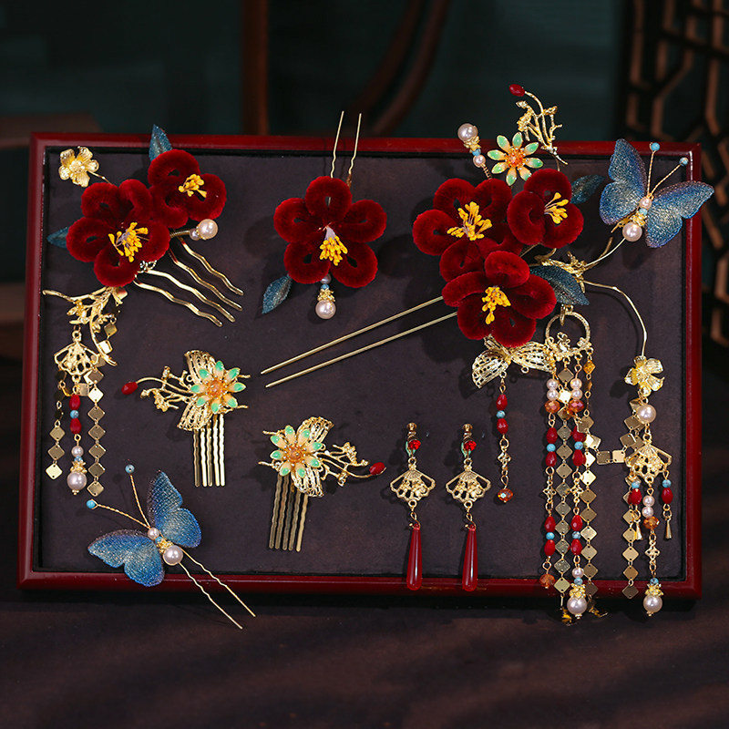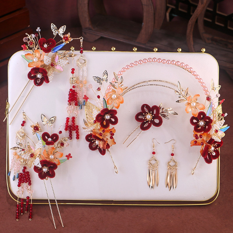 新娘头饰古典汉服古装饰品秀禾结婚中式红色绒花流苏发簪手工发饰