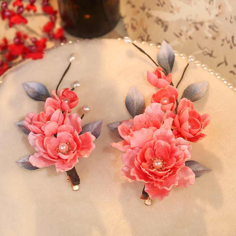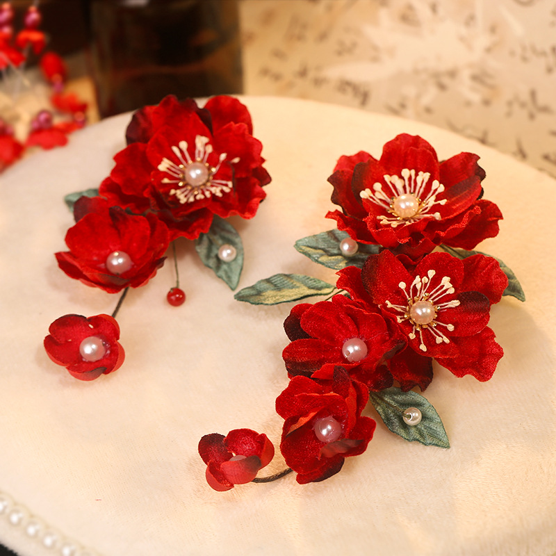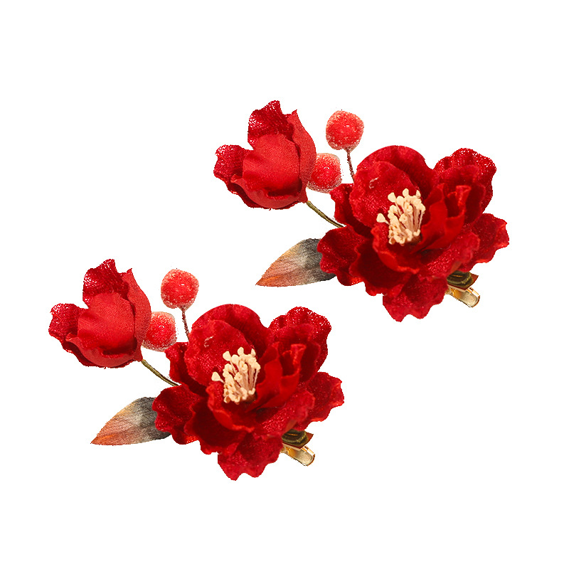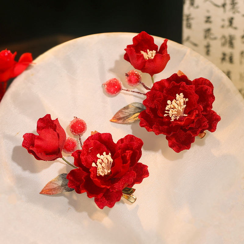 厂家批发红色新娘秀禾服头饰婚嫁结婚花朵订婚发夹女唐风汉服配饰