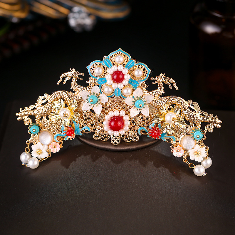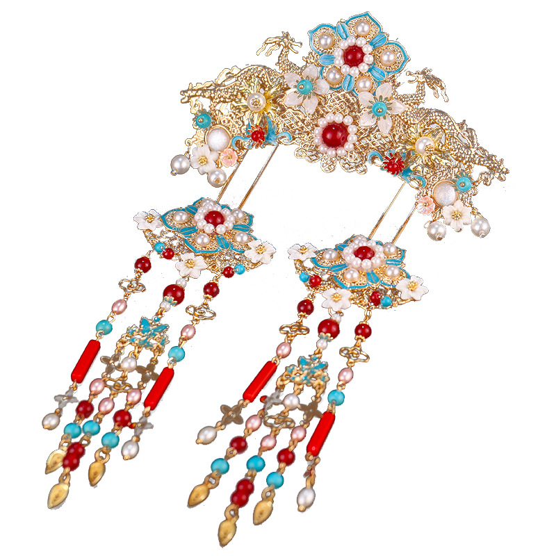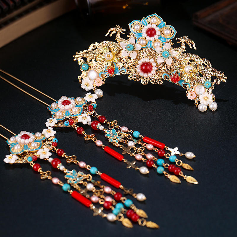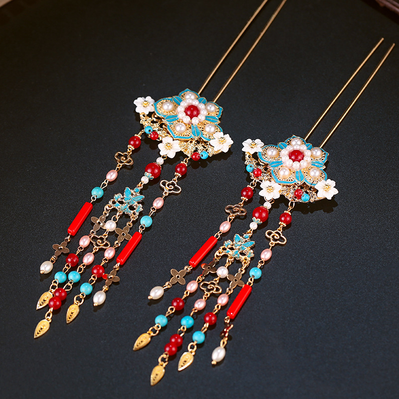 古风明制烧蓝汉服头饰配饰景泰蓝流苏全套发簪头花发饰发钗头冠