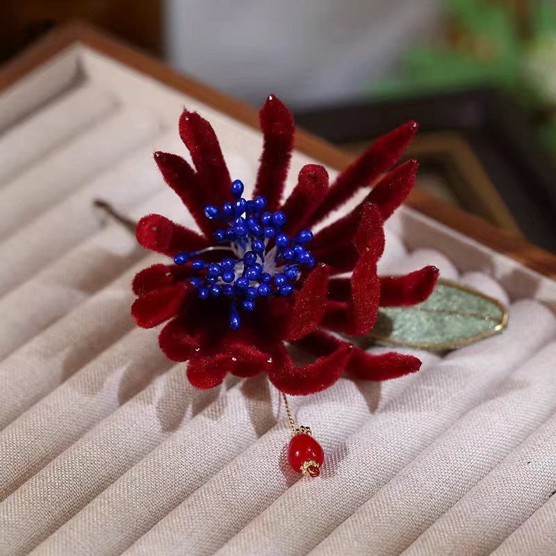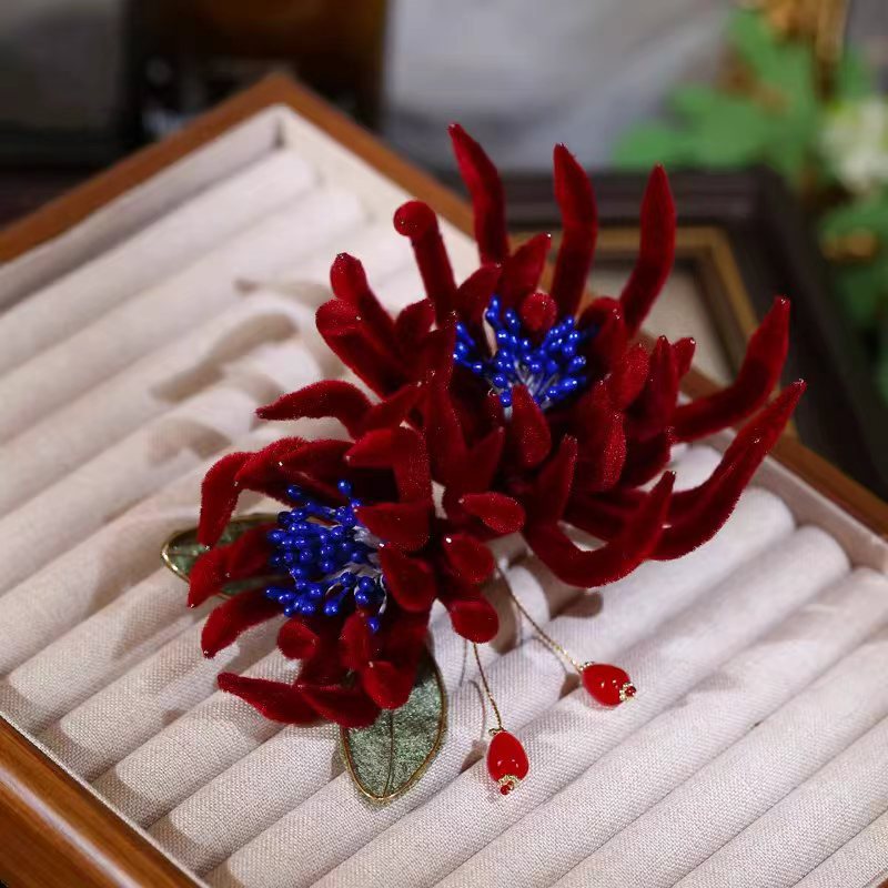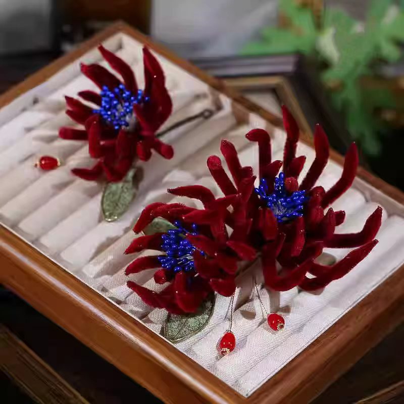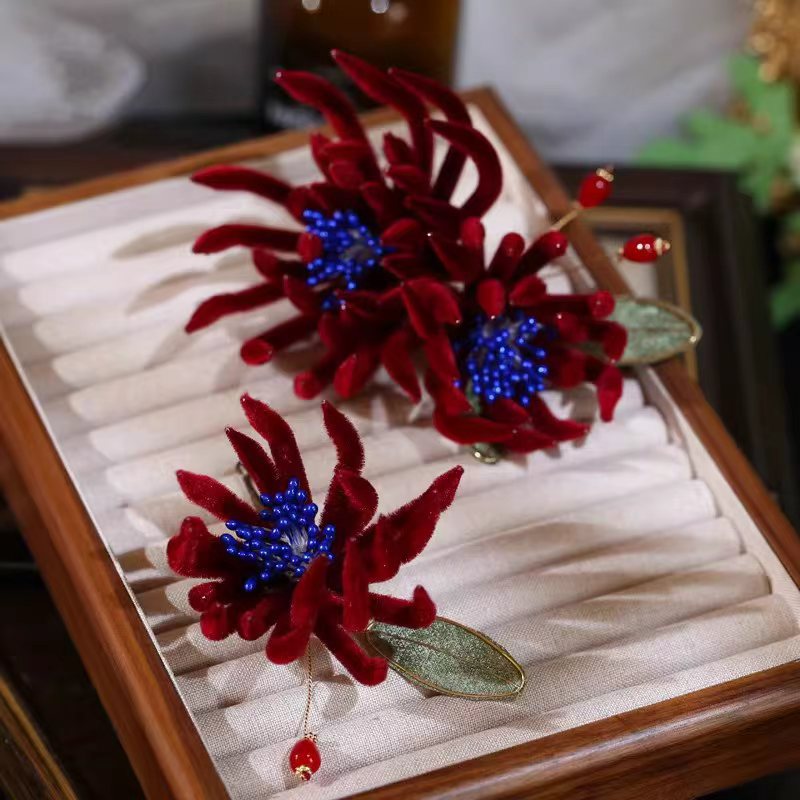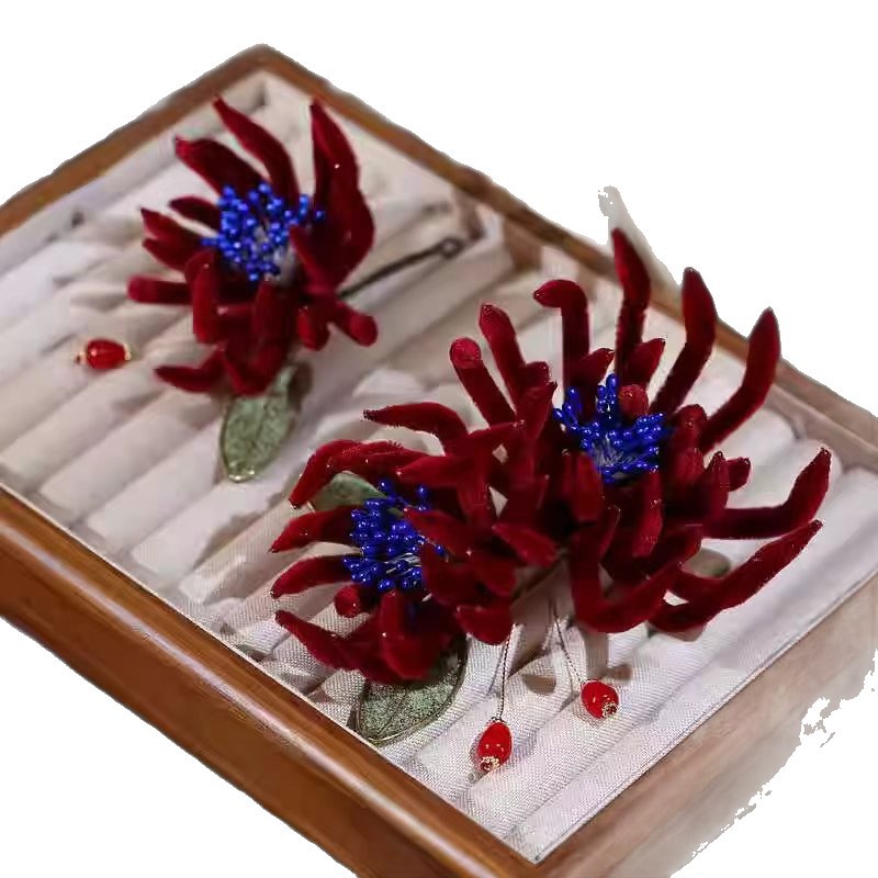 新中式红色绒花发饰新娘旗袍汉服头饰晨袍敬酒服古装造型配饰发夹