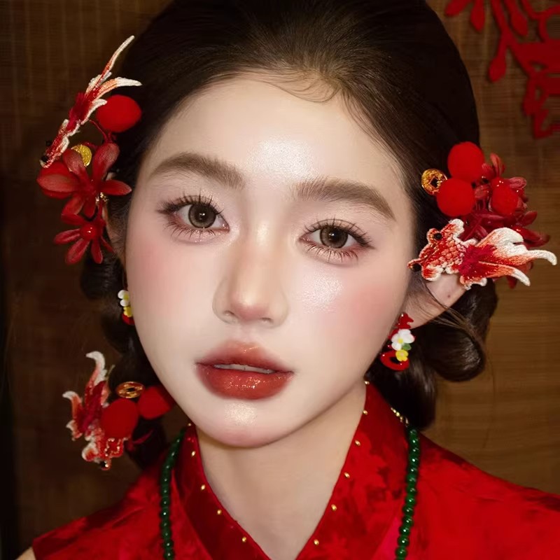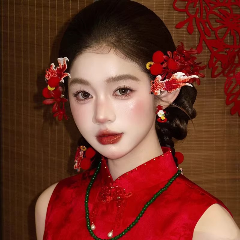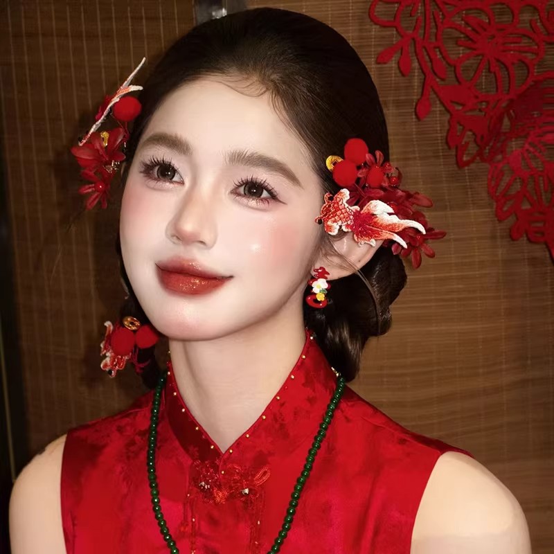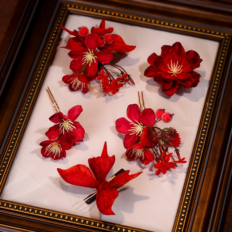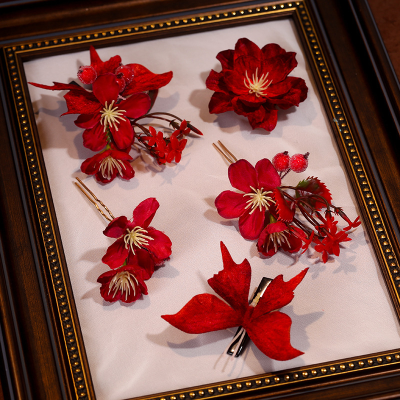 批发新中式新娘头饰红色花朵侧边夹旗袍敬酒服跟妆盘发饰品套装