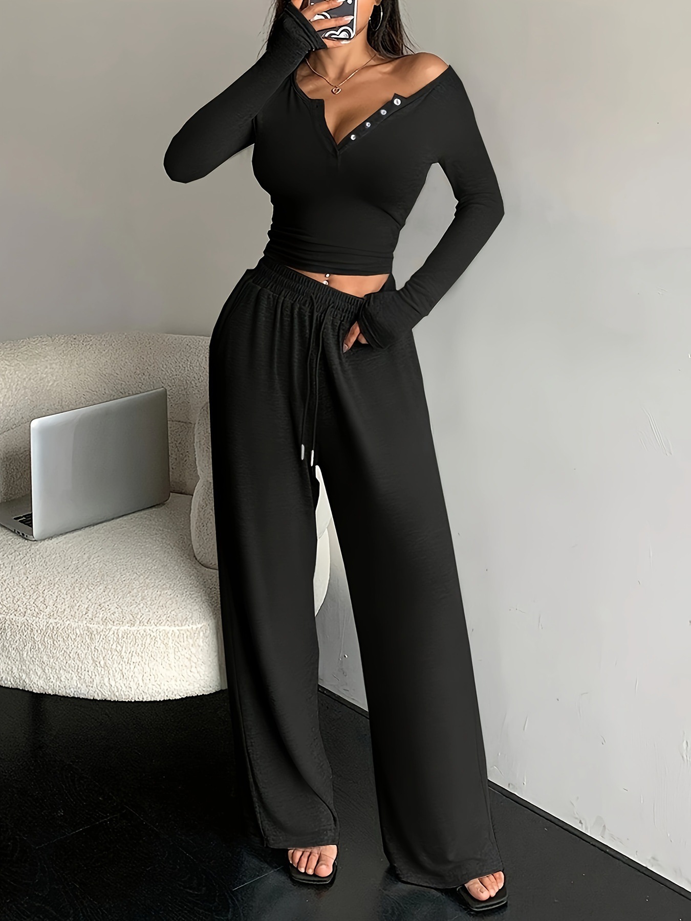 2025新款春秋季短款修身v领排扣长袖T恤打底衫阔腿裤长裤套装欧美