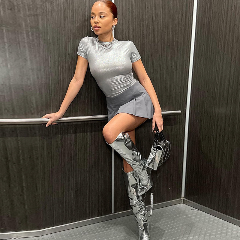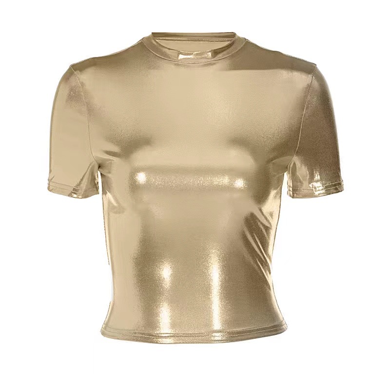 欧美风外贸女装2025春季新款时尚金属色圆领短袖紧身T恤上衣女装