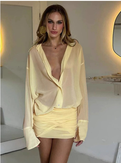 欧美2025春季新款女装性感翻领修身包臀绑带衬衫气质连衣裙短裙女