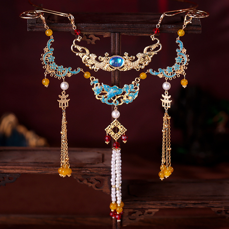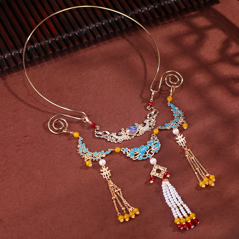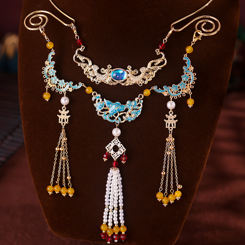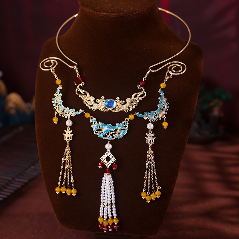 汉服项圈璎珞长背云明制儿童流苏配饰景泰蓝国风珍珠配马面裙项链
