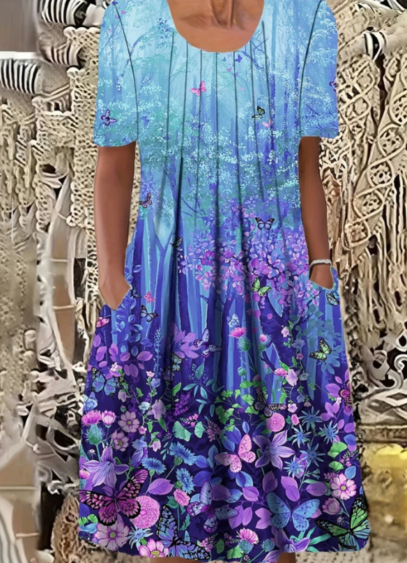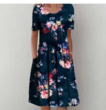 2026亚马逊TEMU欧美大码春夏女装高雅大摆裙圆领印花短袖连衣裙