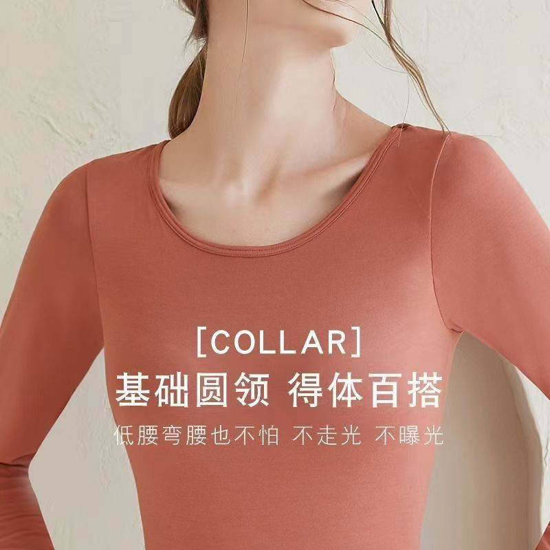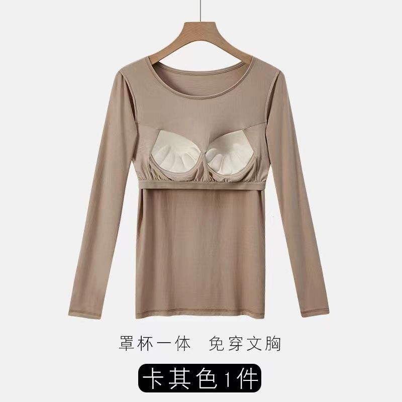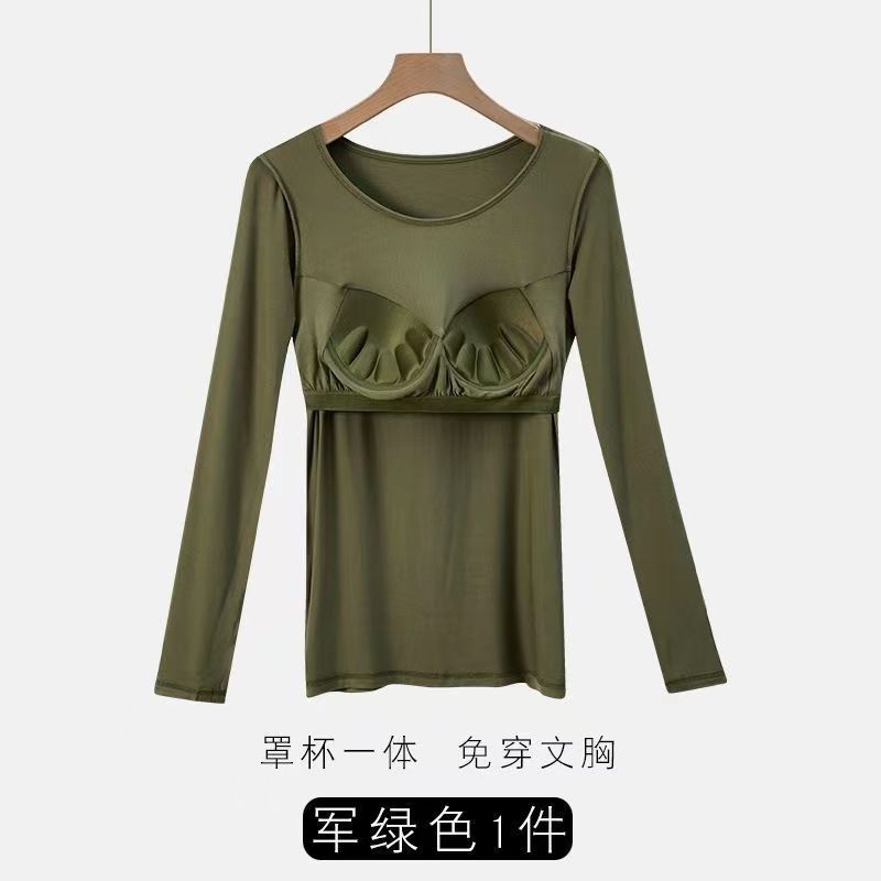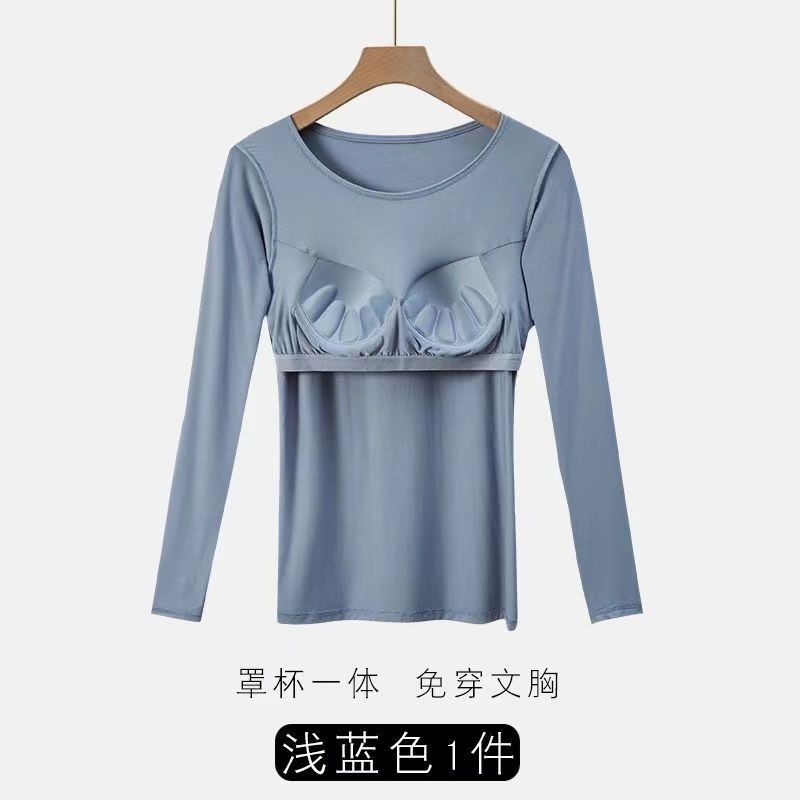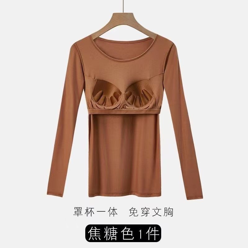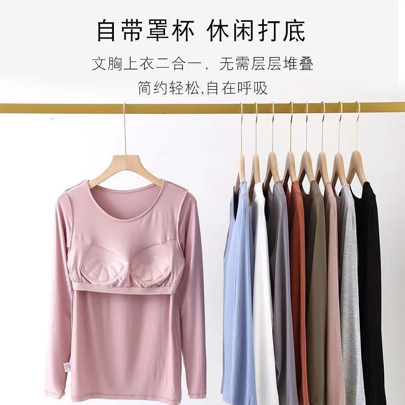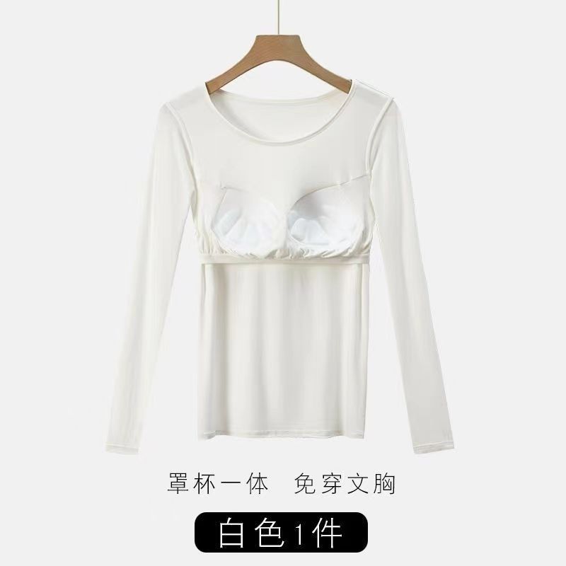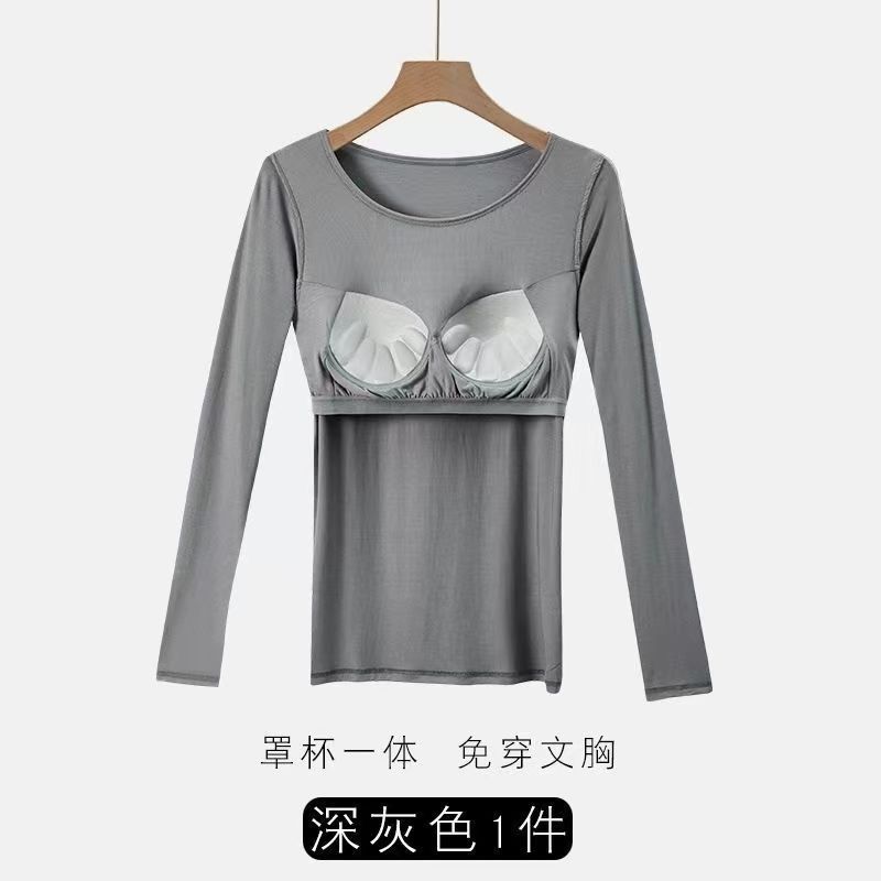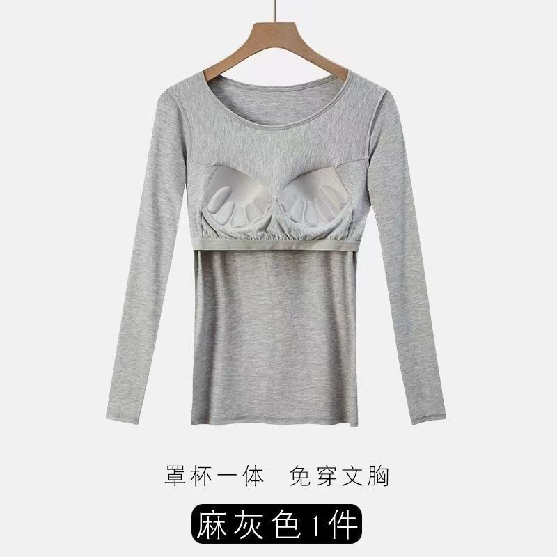 带胸垫圆领长袖打底衫秋冬罩杯一体式带胸垫睡衣内衣可外穿秋衣
