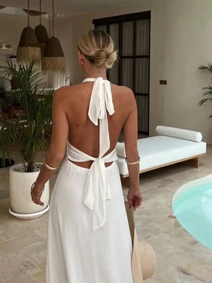 2025春季新款.立站欧美女装气质挂脖v领开衩长款纯色连衣裙