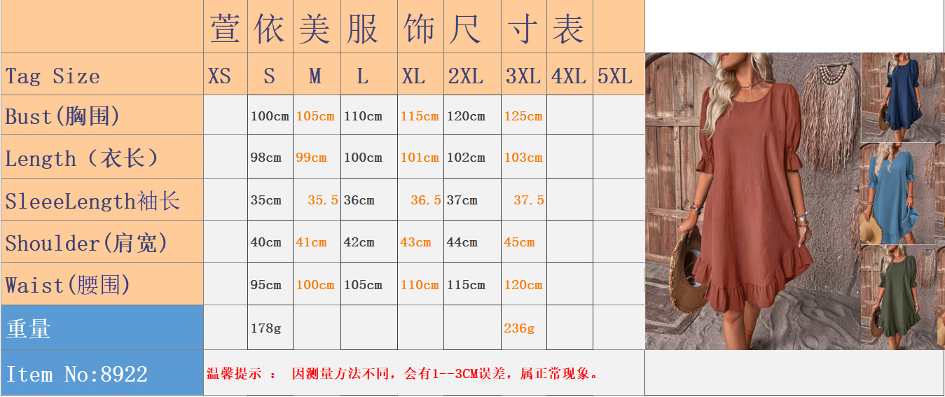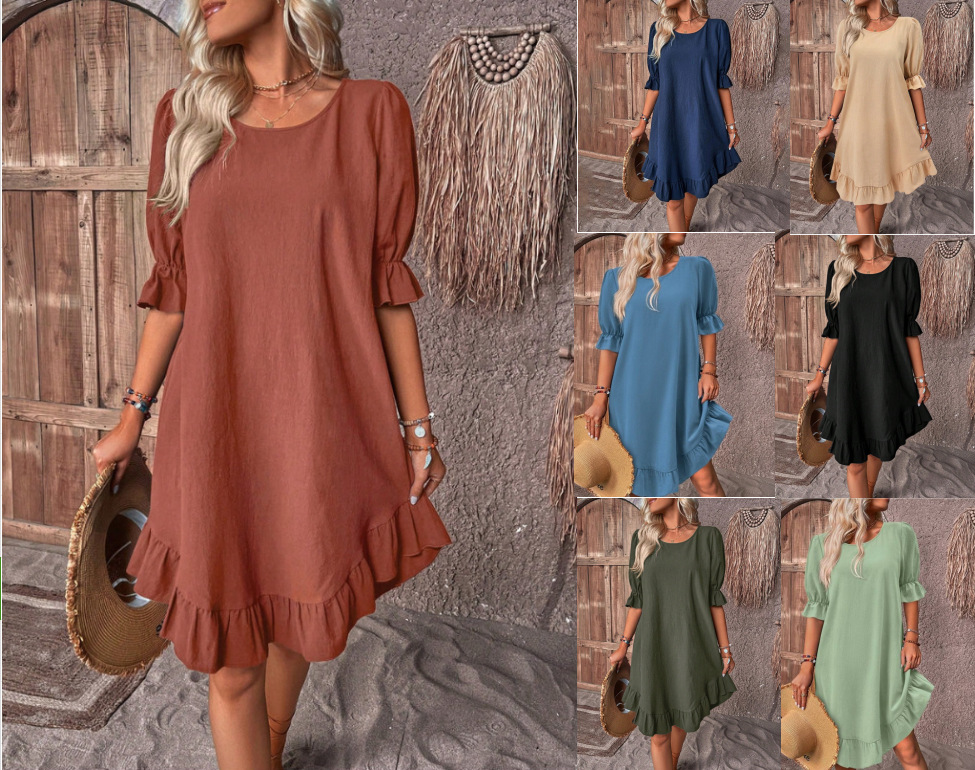 2026春夏欧美跨境TEMU女装复古棉麻中袖圆领纯色宽松大摆连衣裙