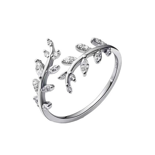 S925镀银戒指女韩版小清新镶钻树叶开口指环文艺橄榄枝戒子不掉色