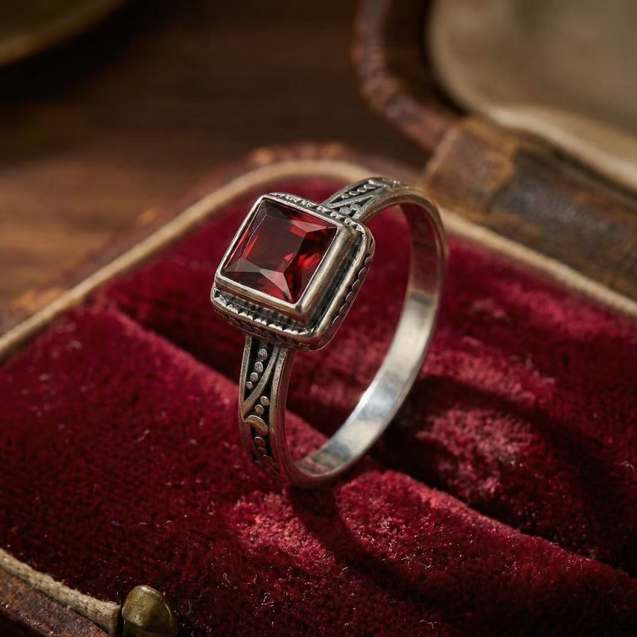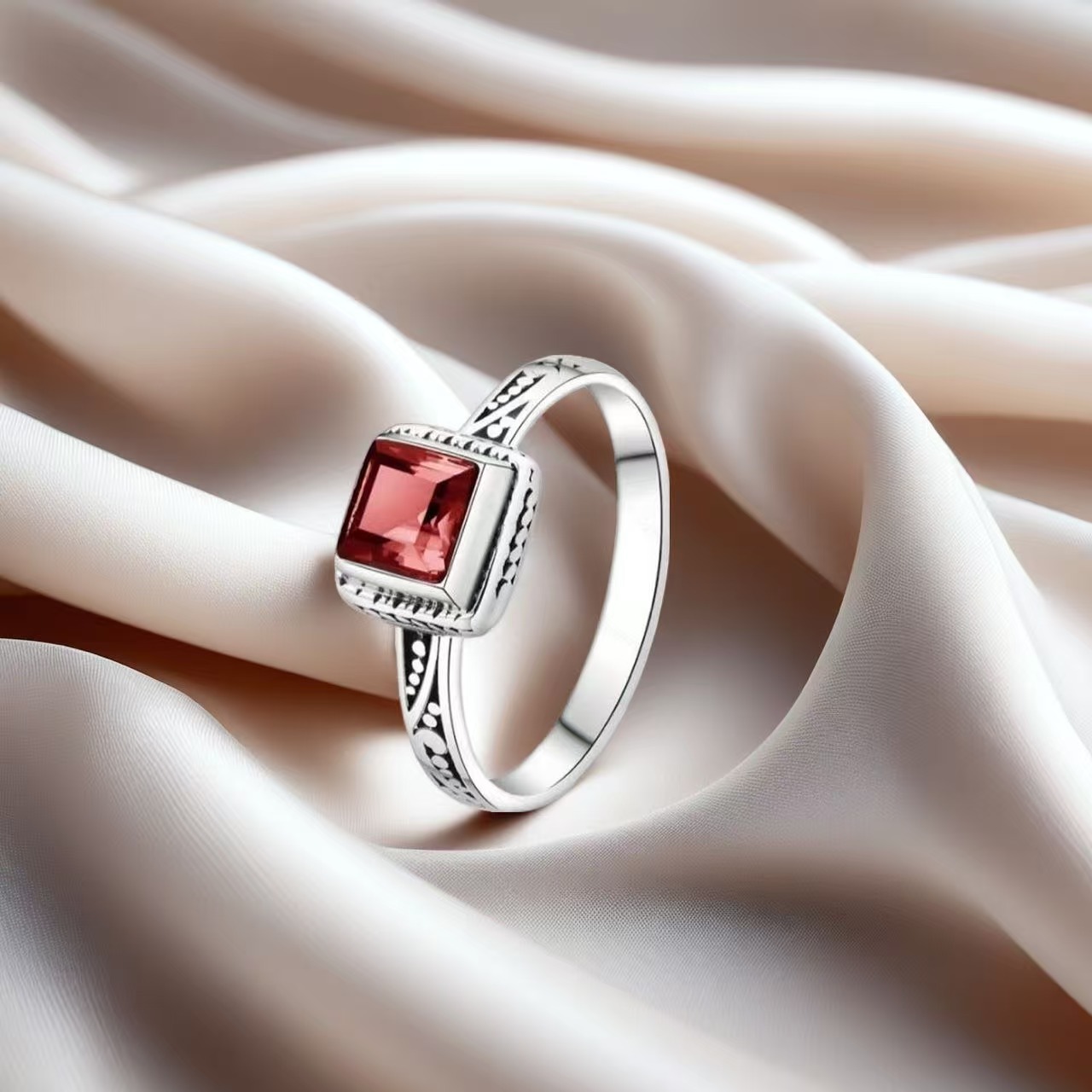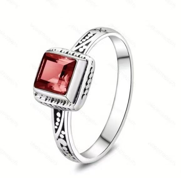 新款欧美石榴石方形戒指女复古简约花纹雕刻小众开口设计食指戒新