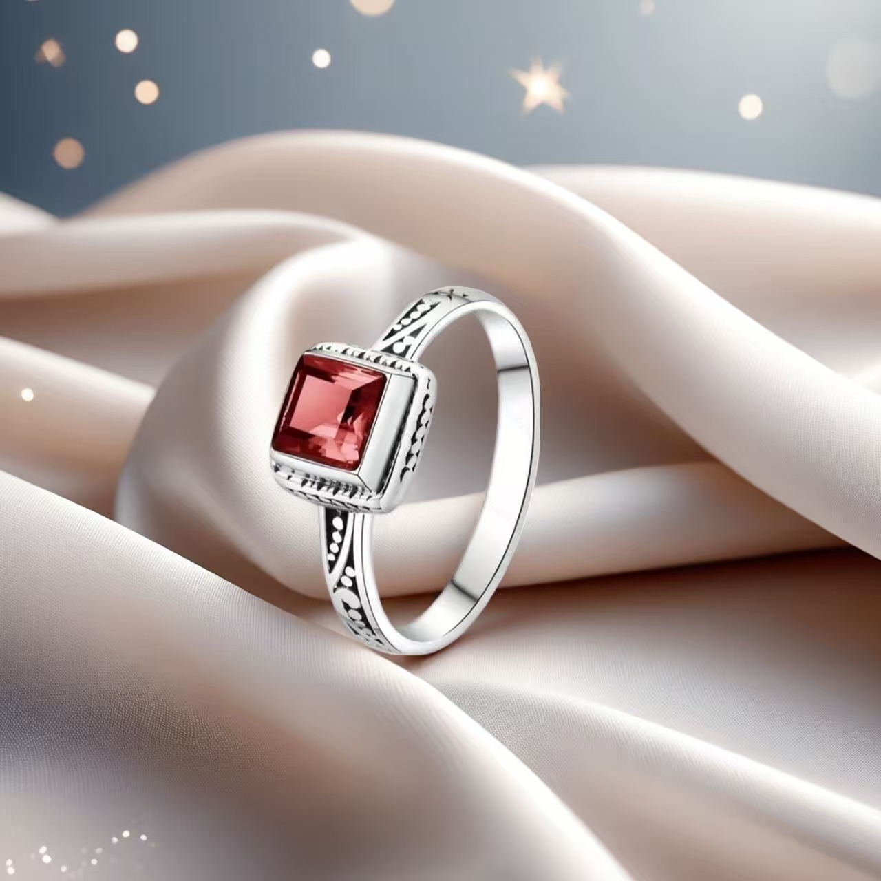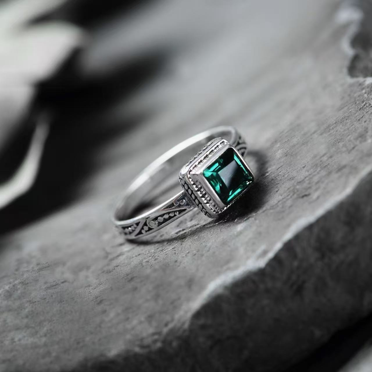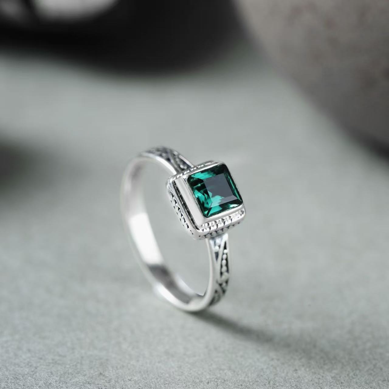 新款欧美石榴石方形戒指女复古简约花纹雕刻小众开口设计食指戒新