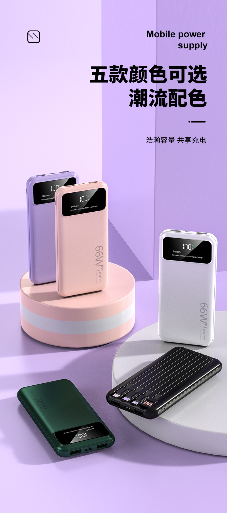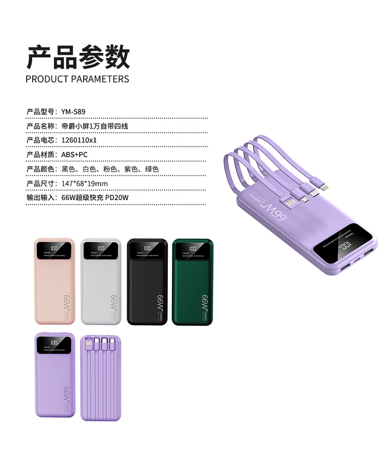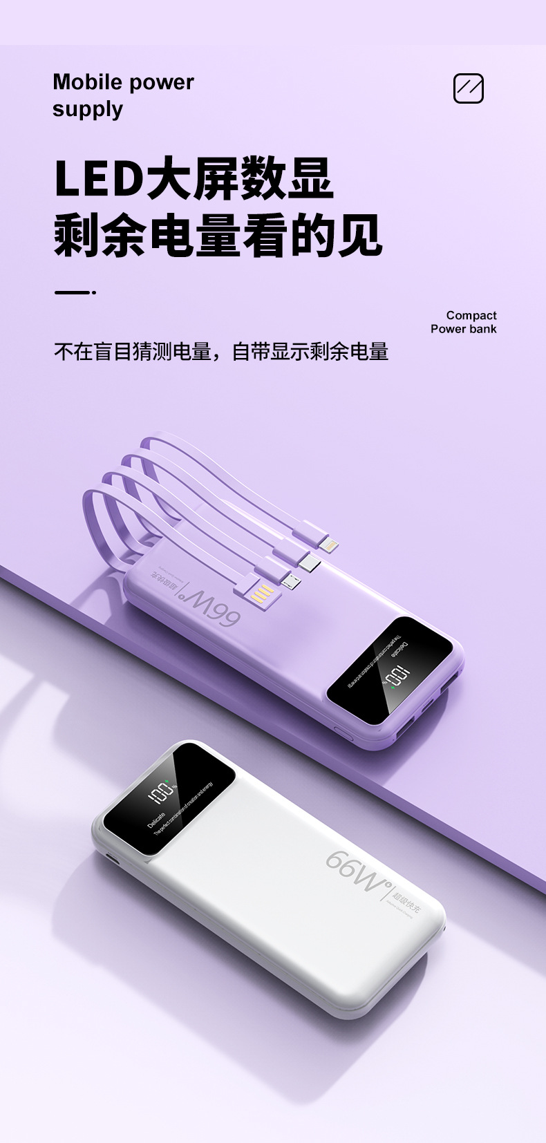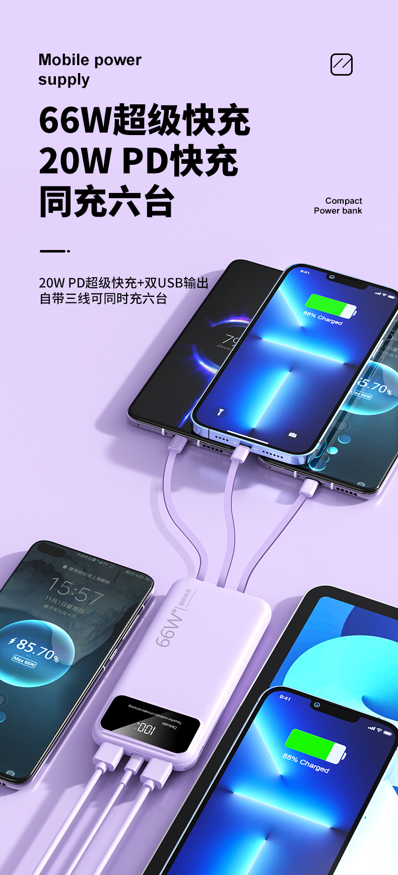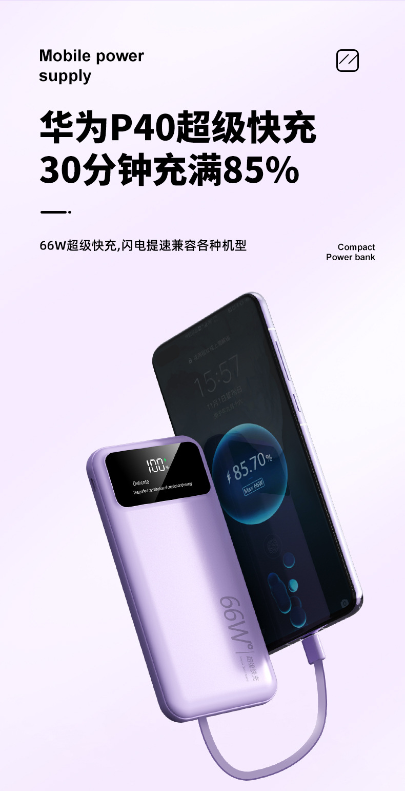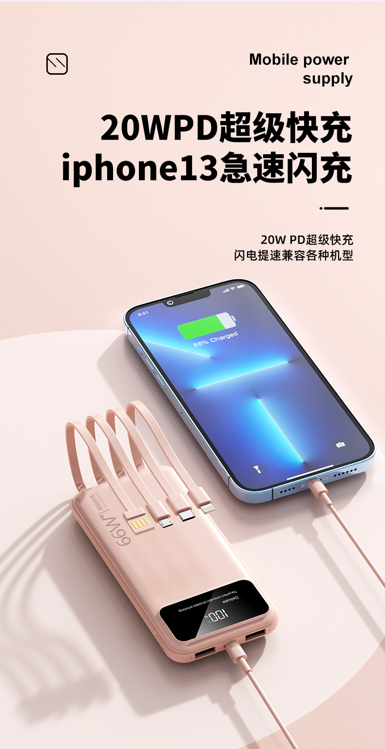 跨境超大容量充电宝30000毫安66W快充共享数显便携自带线移动电源