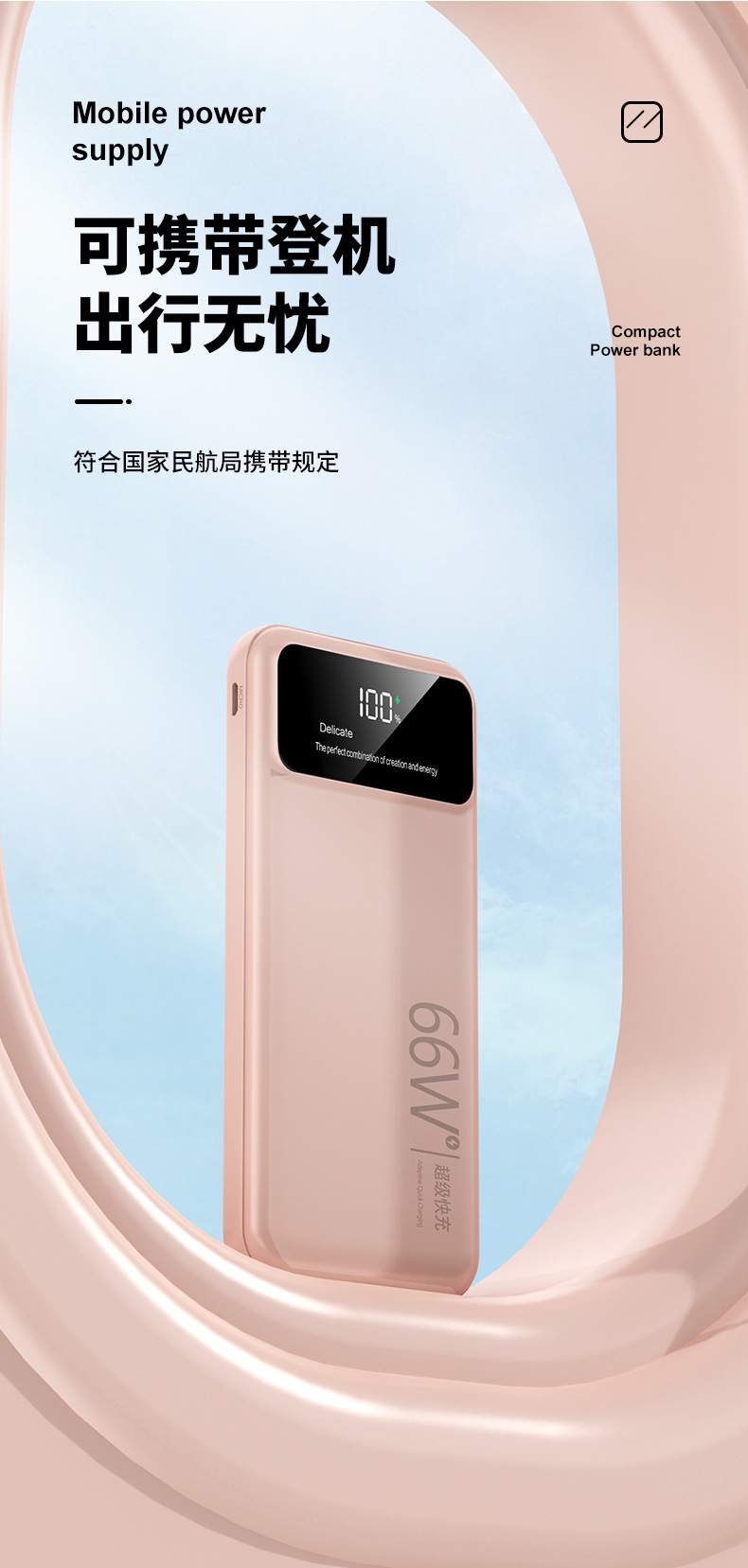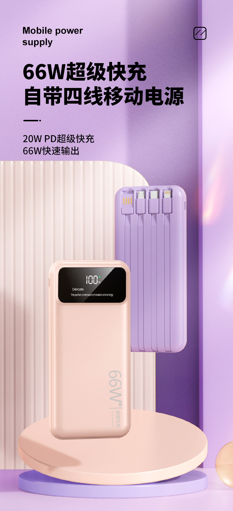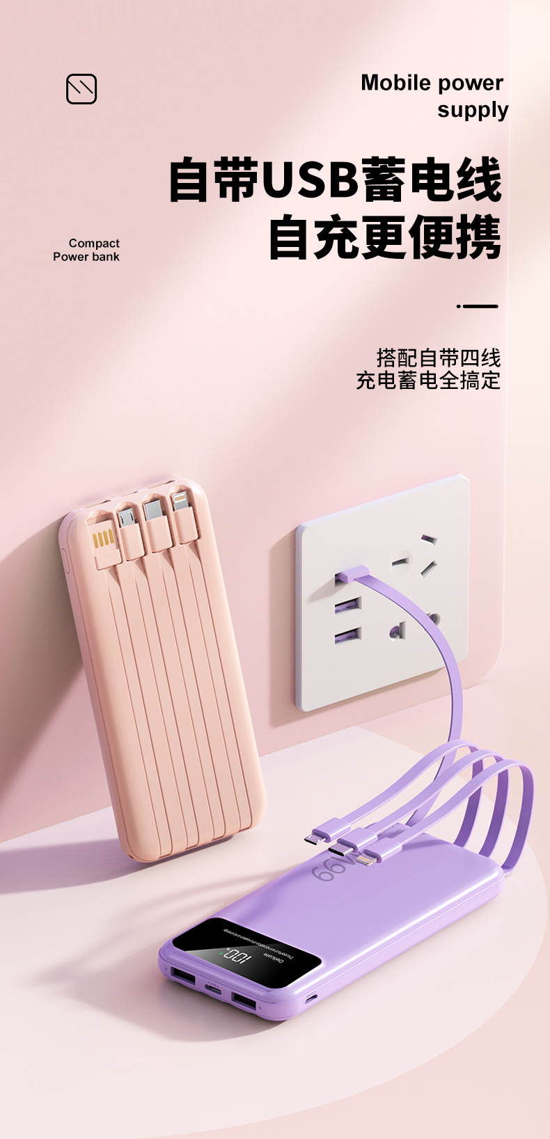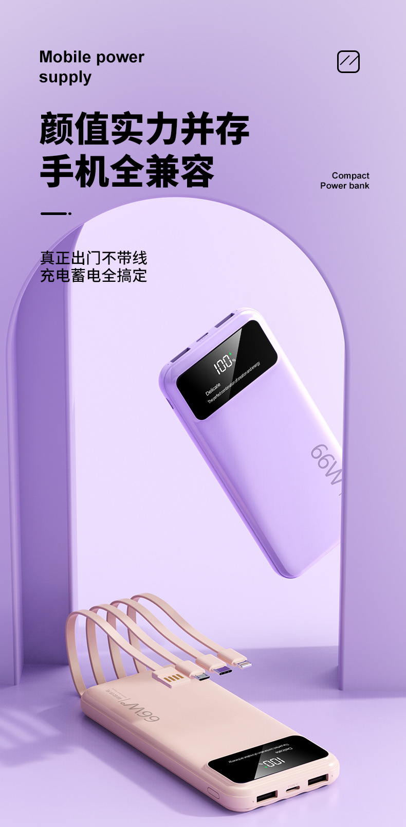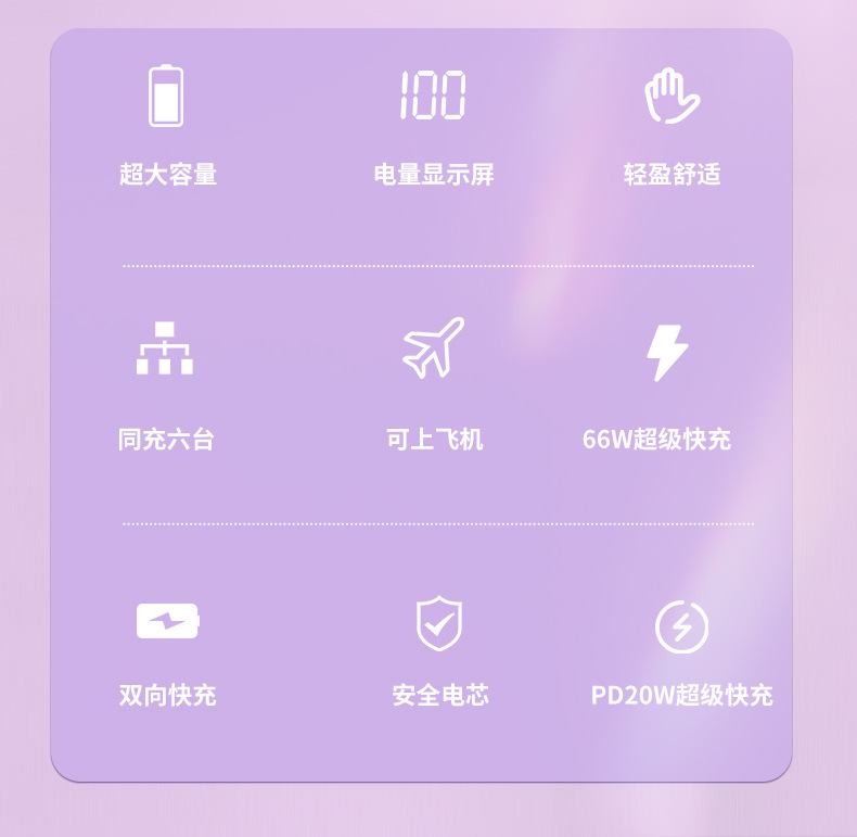 跨境超大容量充电宝30000毫安66W快充共享数显便携自带线移动电源