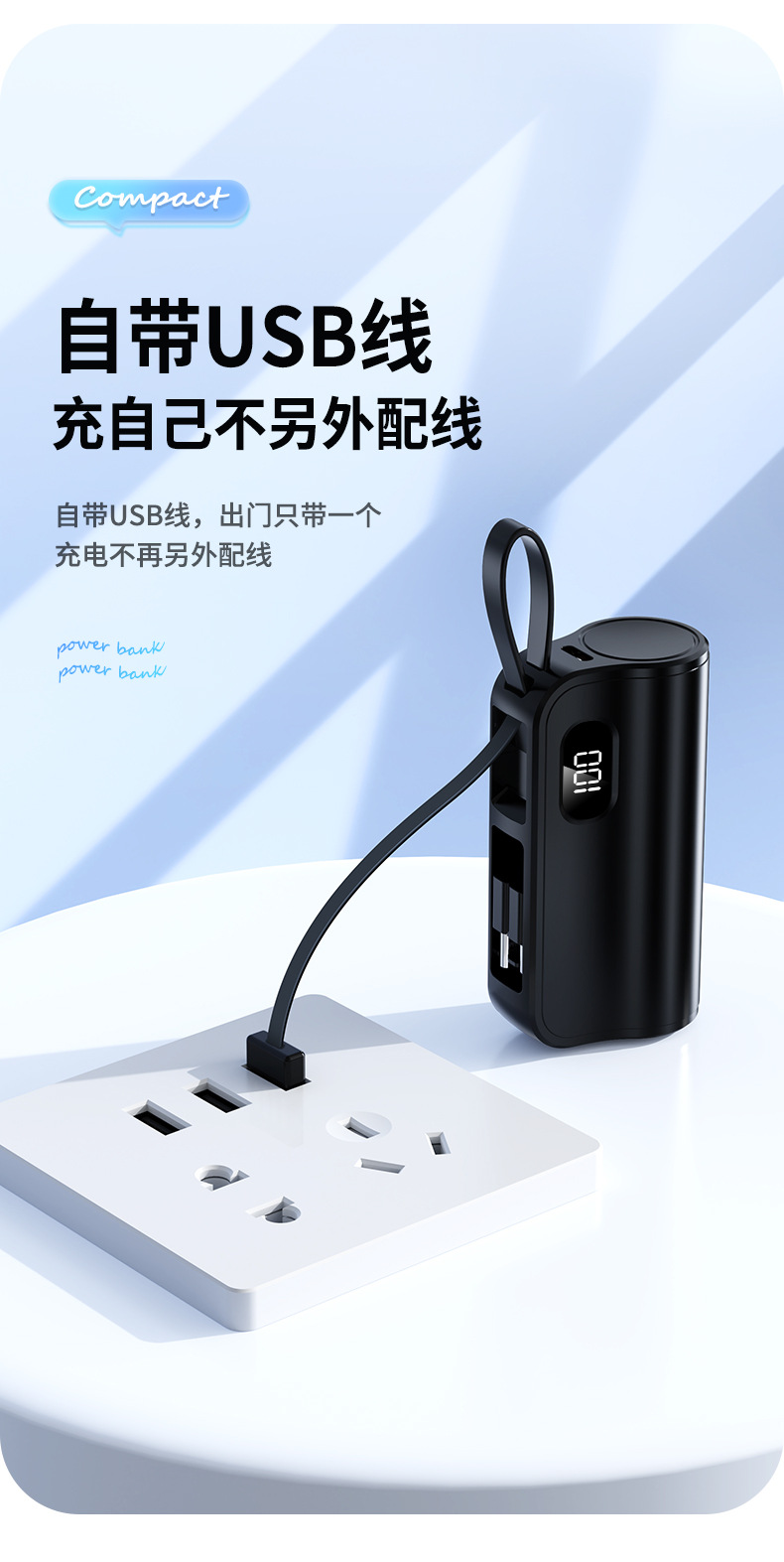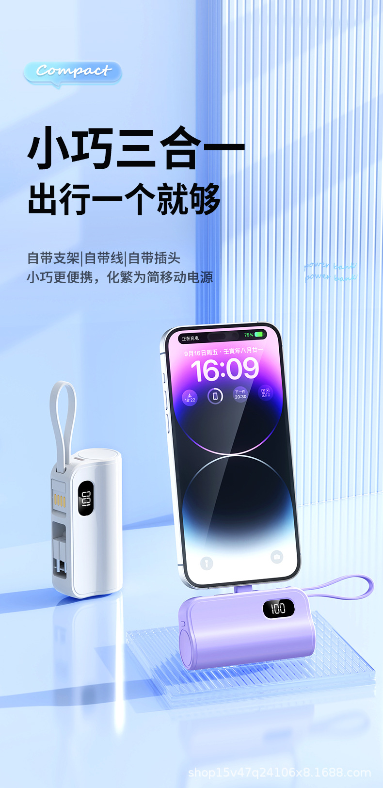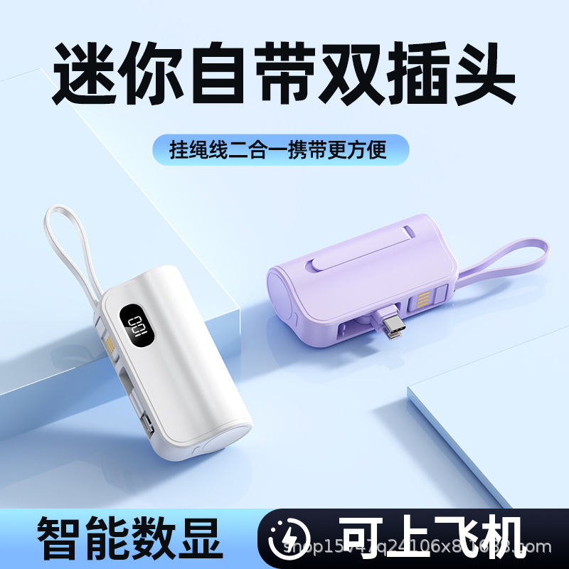 新款双插头22.5W胶囊充电宝数显自带线支架快充移动电源印制logo