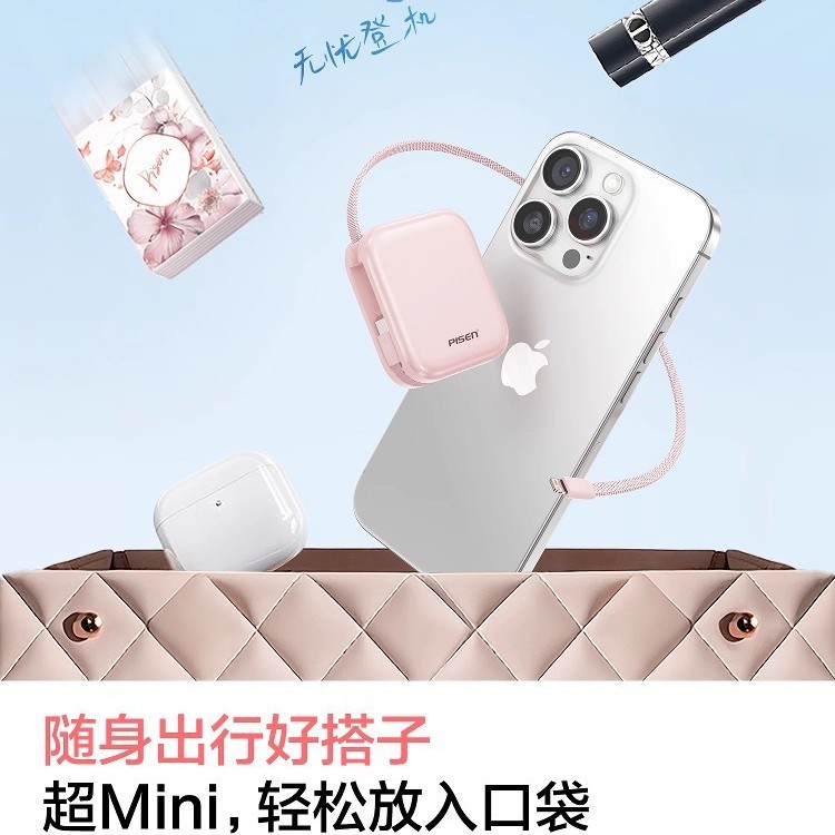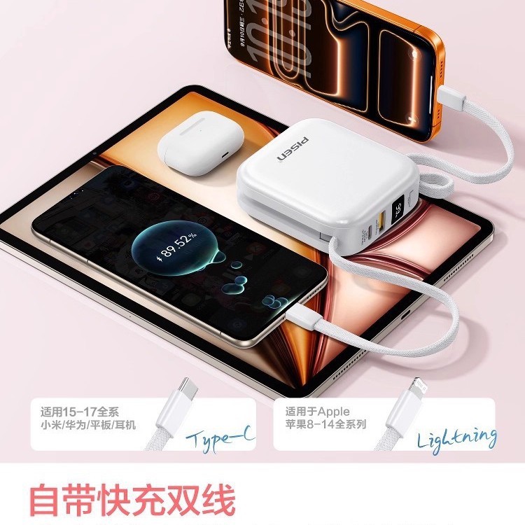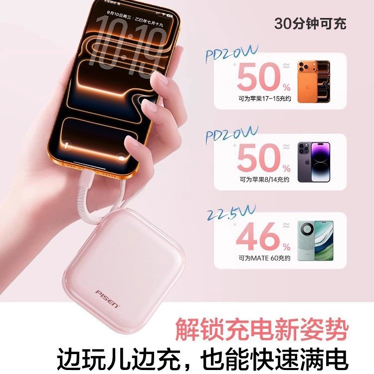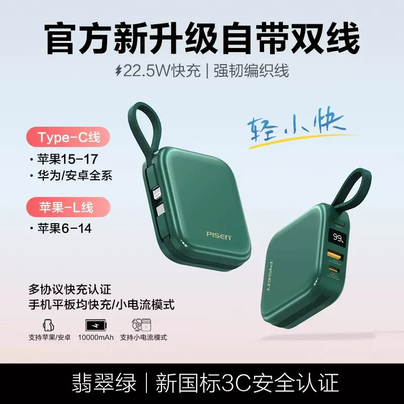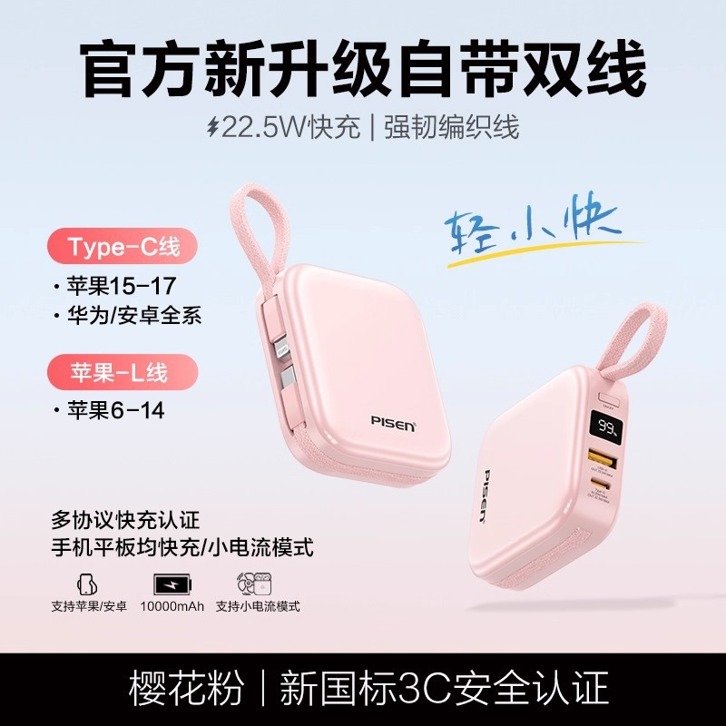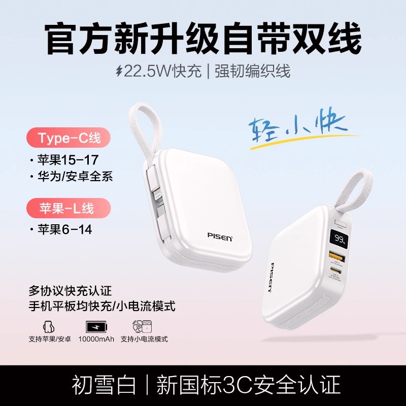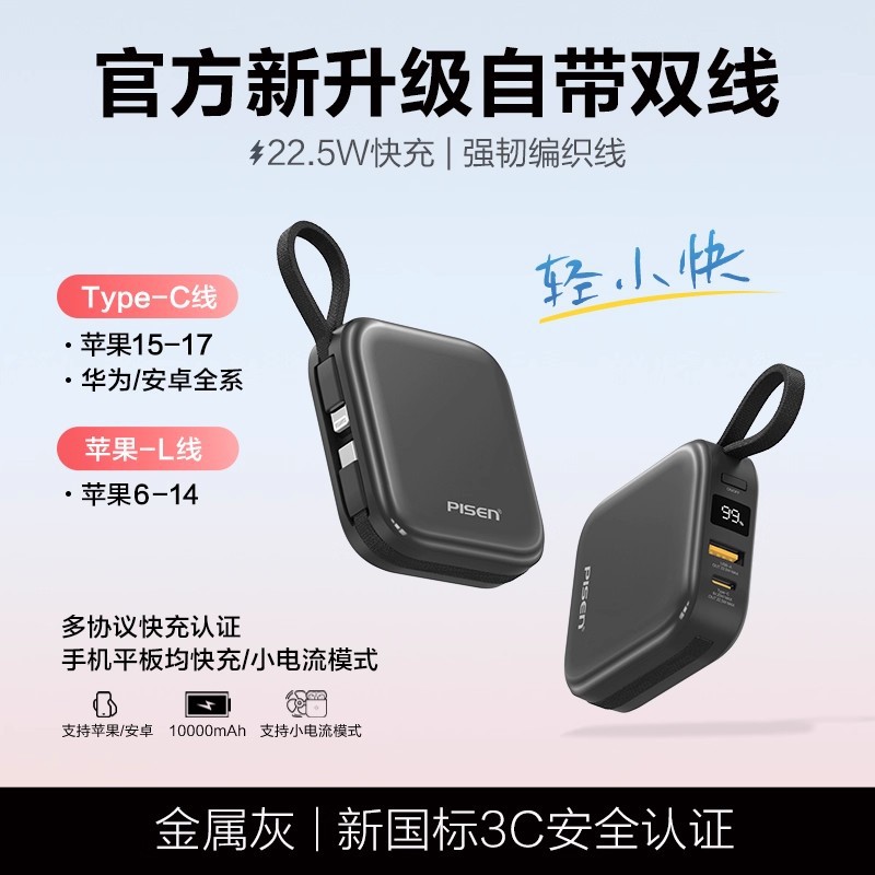品胜充电宝10000毫安22.5W快充便携大容量迷你自带线移动电源定制