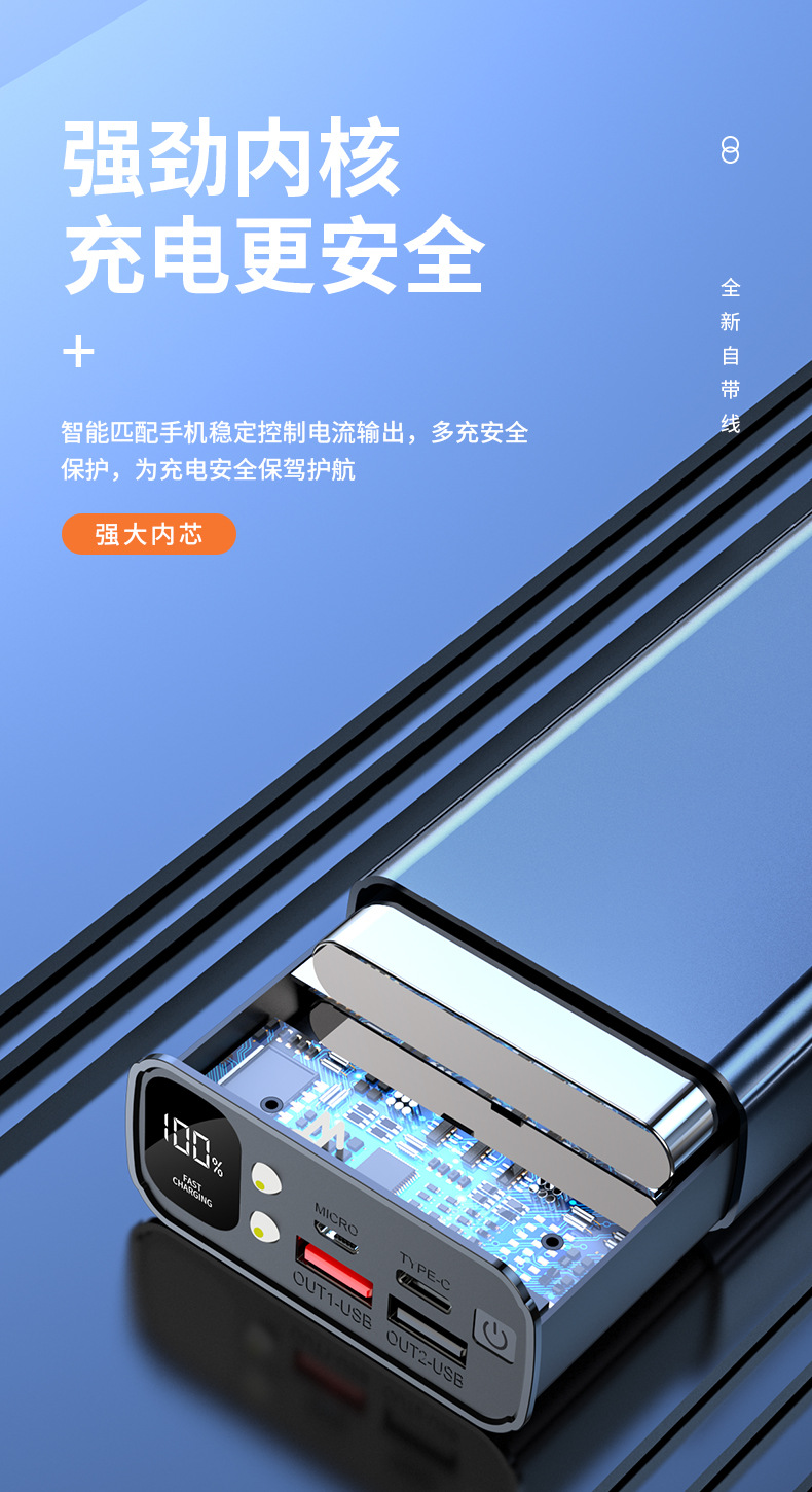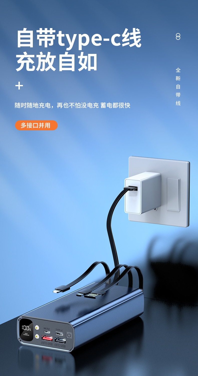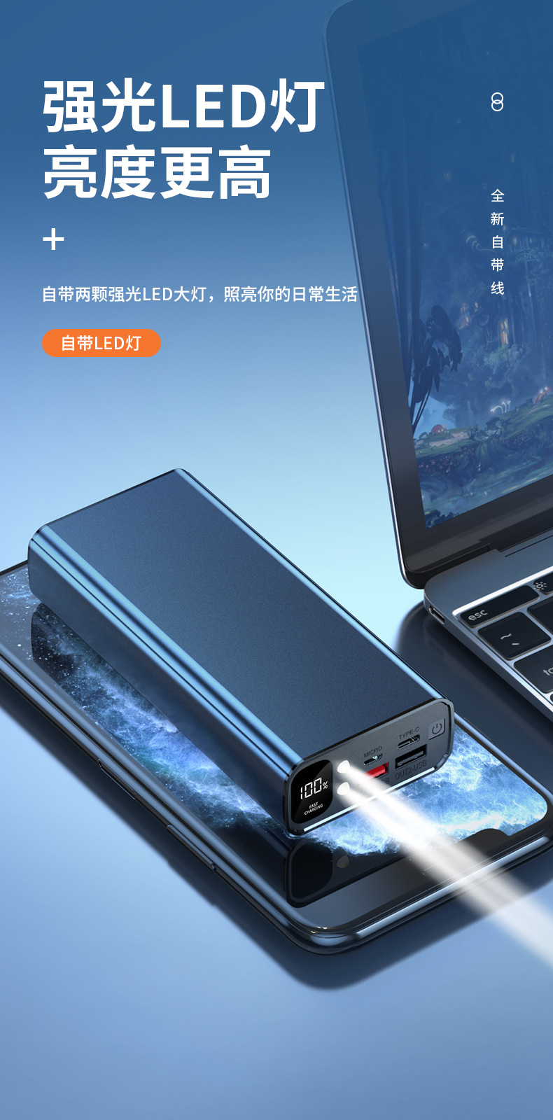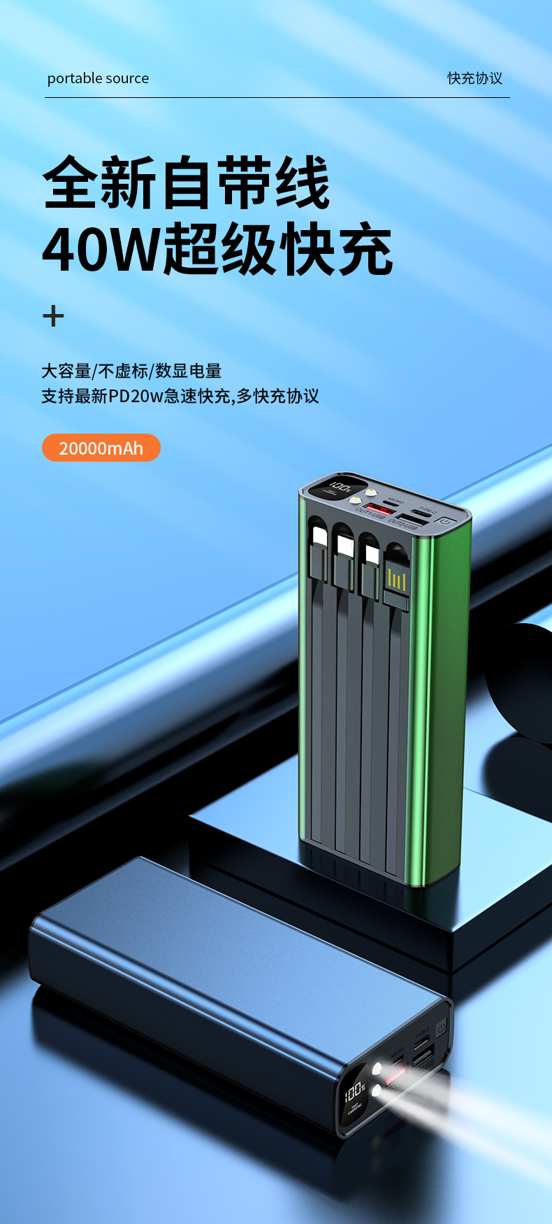 跨境热销铝合金快充PD22.5W充电宝自带线移动电源20000毫安大容量