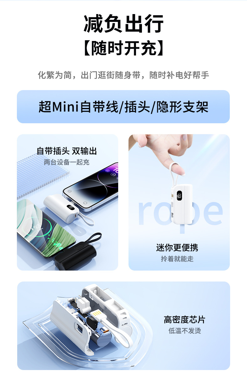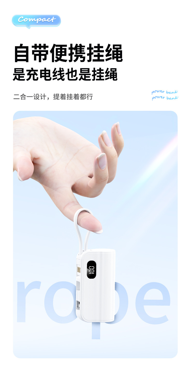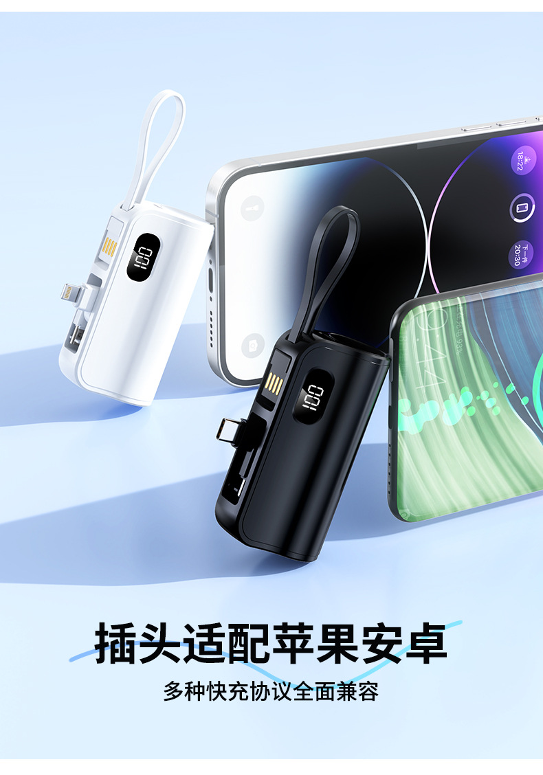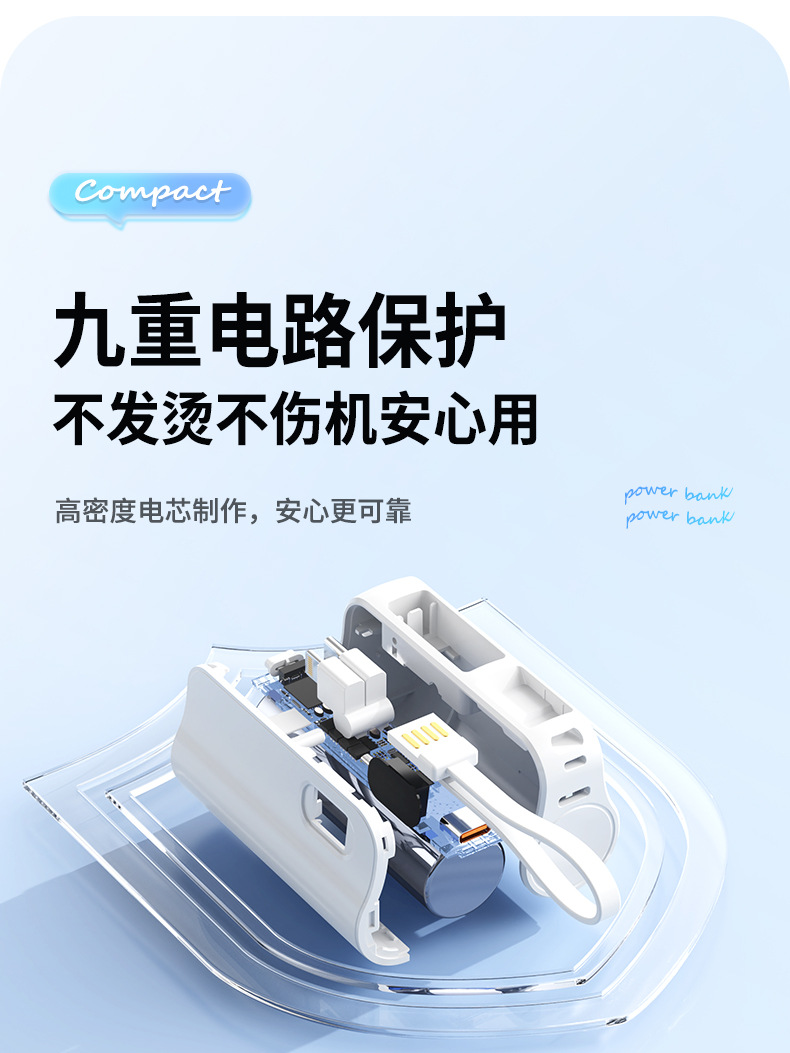 跨境批发KC认证胶囊充电宝LOGO定制移动电源5000毫安自带线便携带