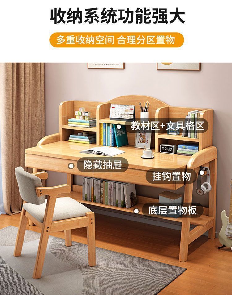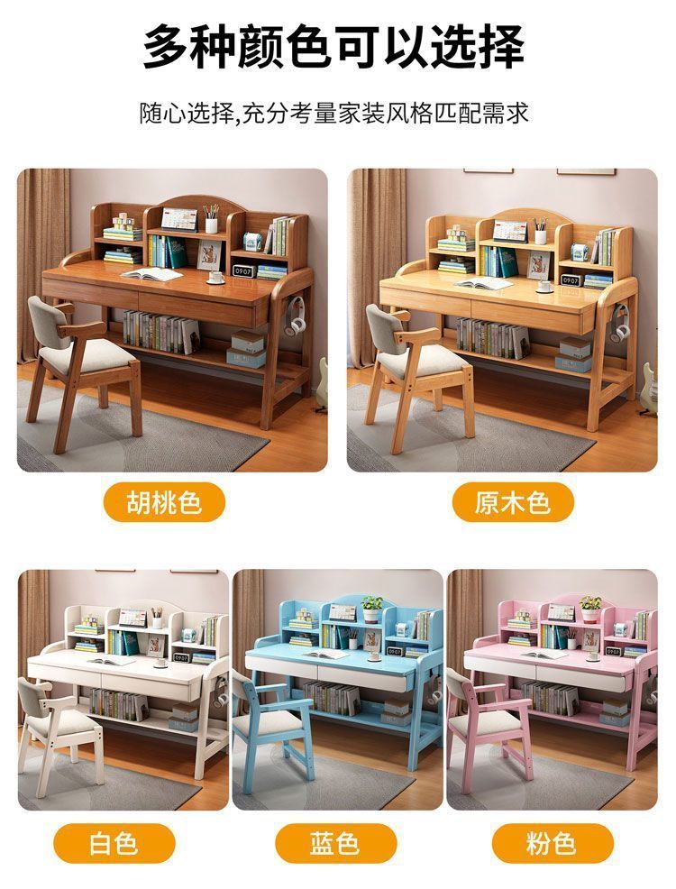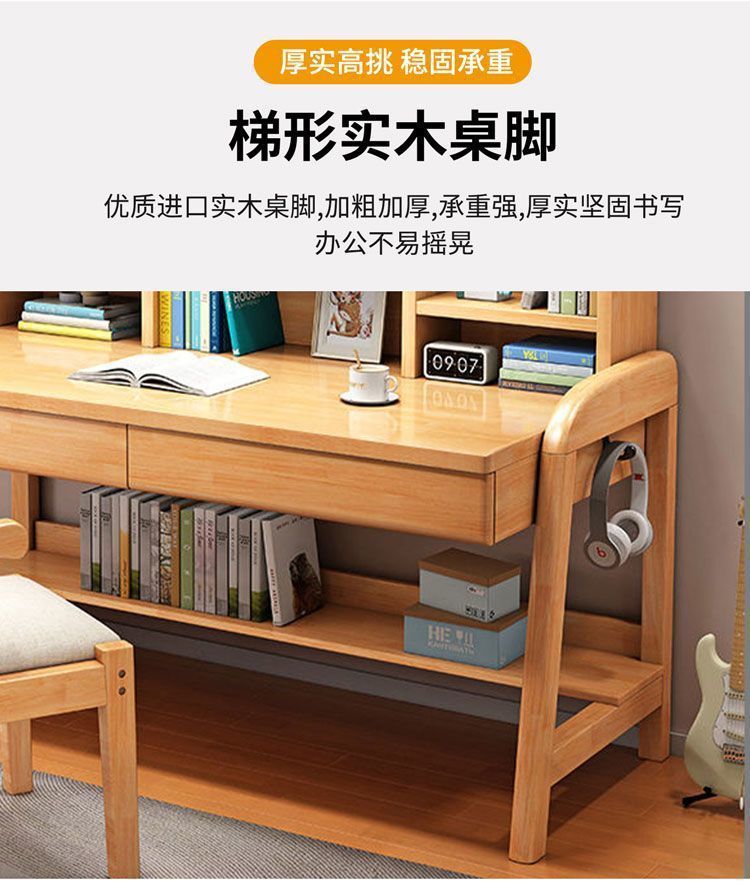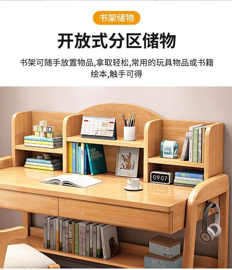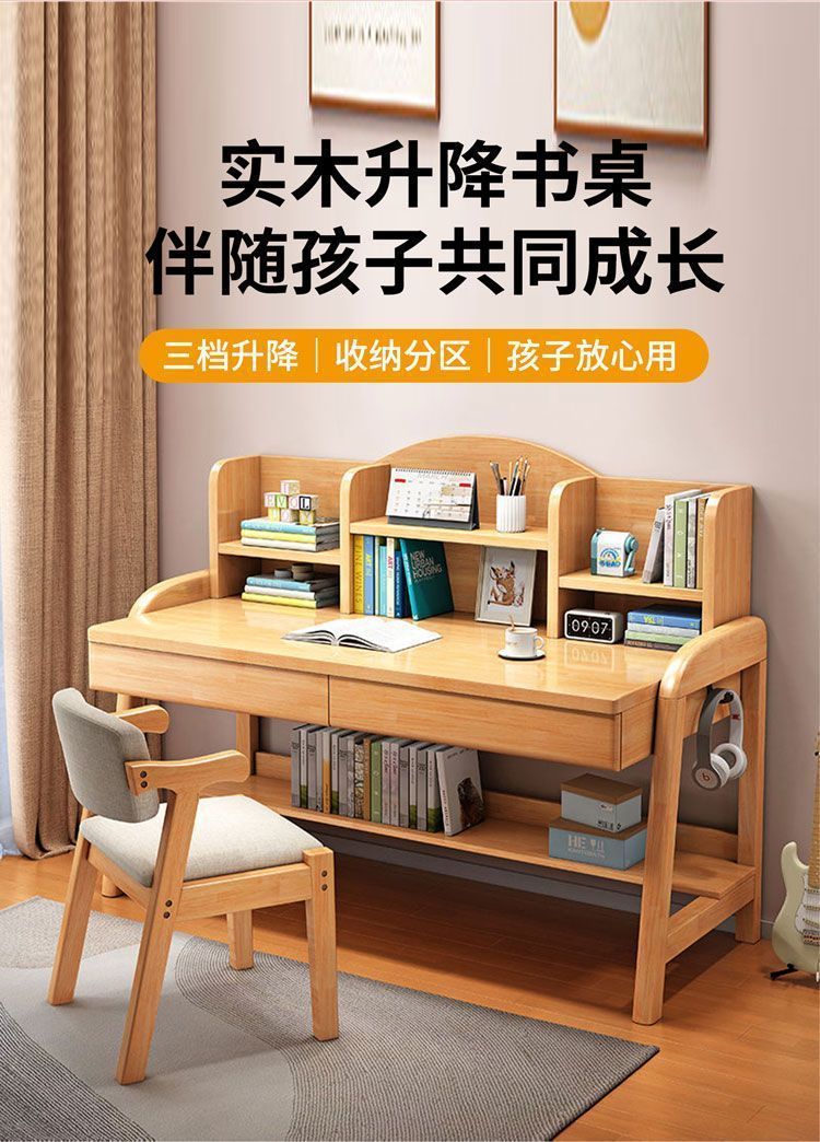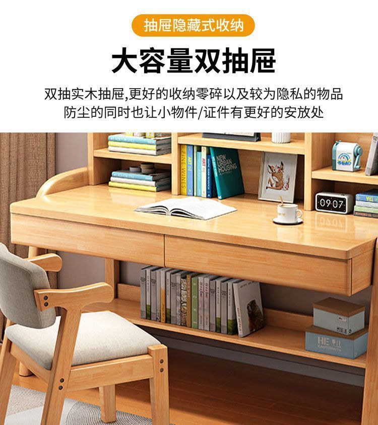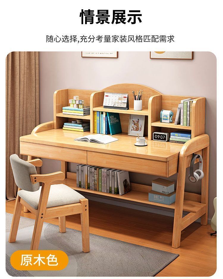 实木儿童学习桌中小学生家用书架一体桌可升降卧室书房办公写字桌