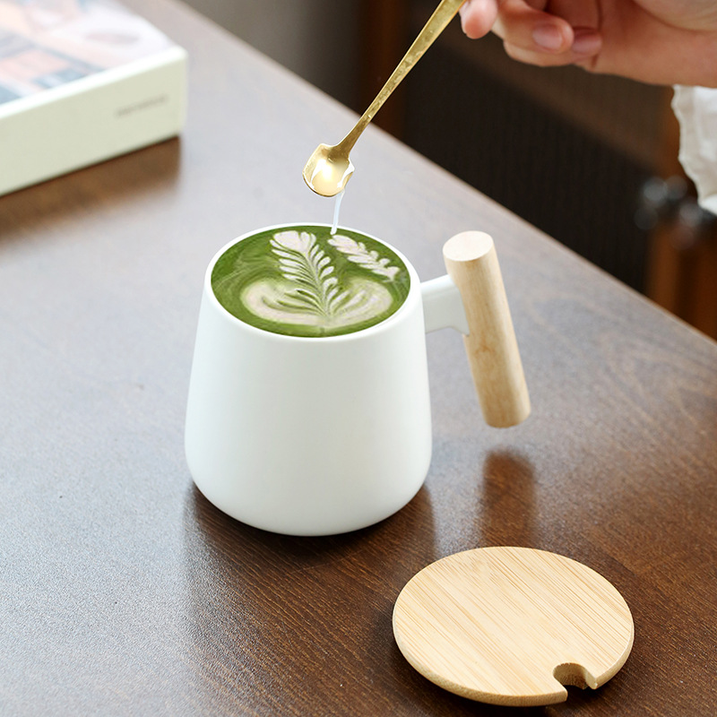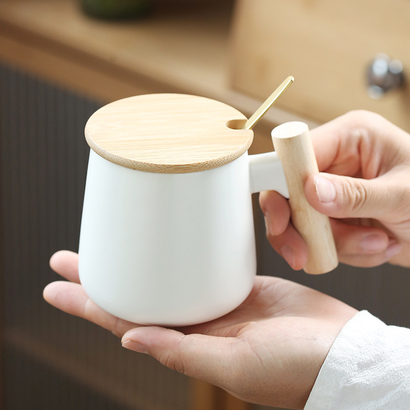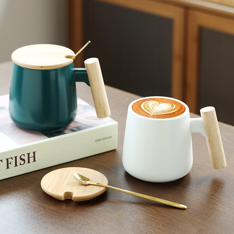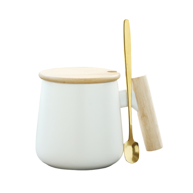 北欧简约木柄陶瓷马克杯带盖勺办公室水杯咖啡杯活动礼品印制logo
