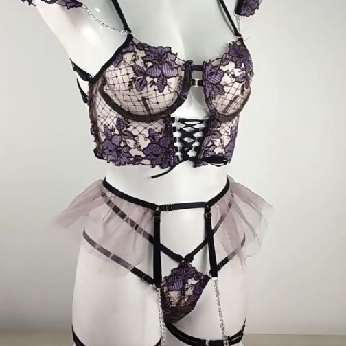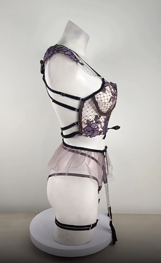 跨境外贸欧美新款情趣内衣性感女网纱刺绣三件套内衣情趣套装批发