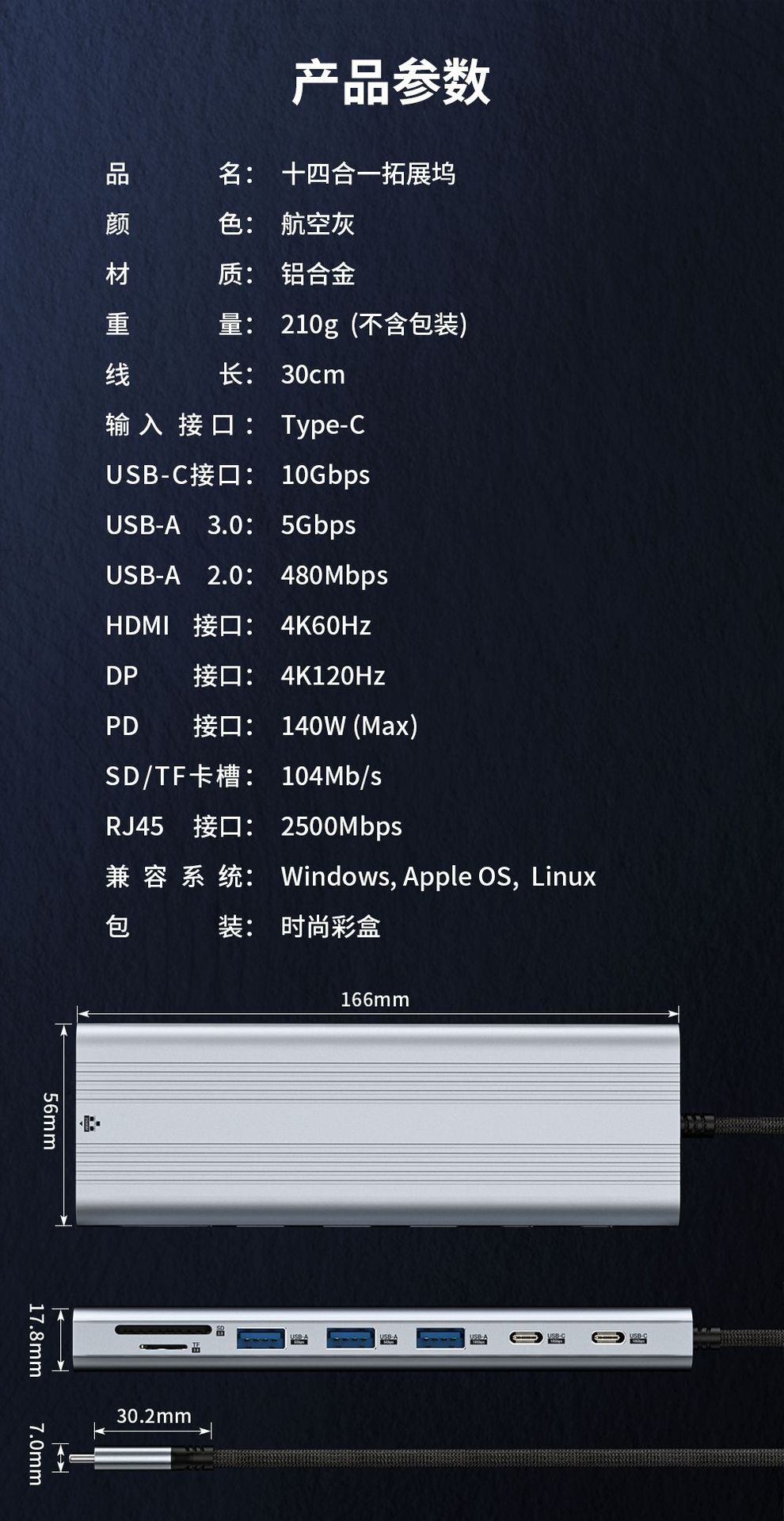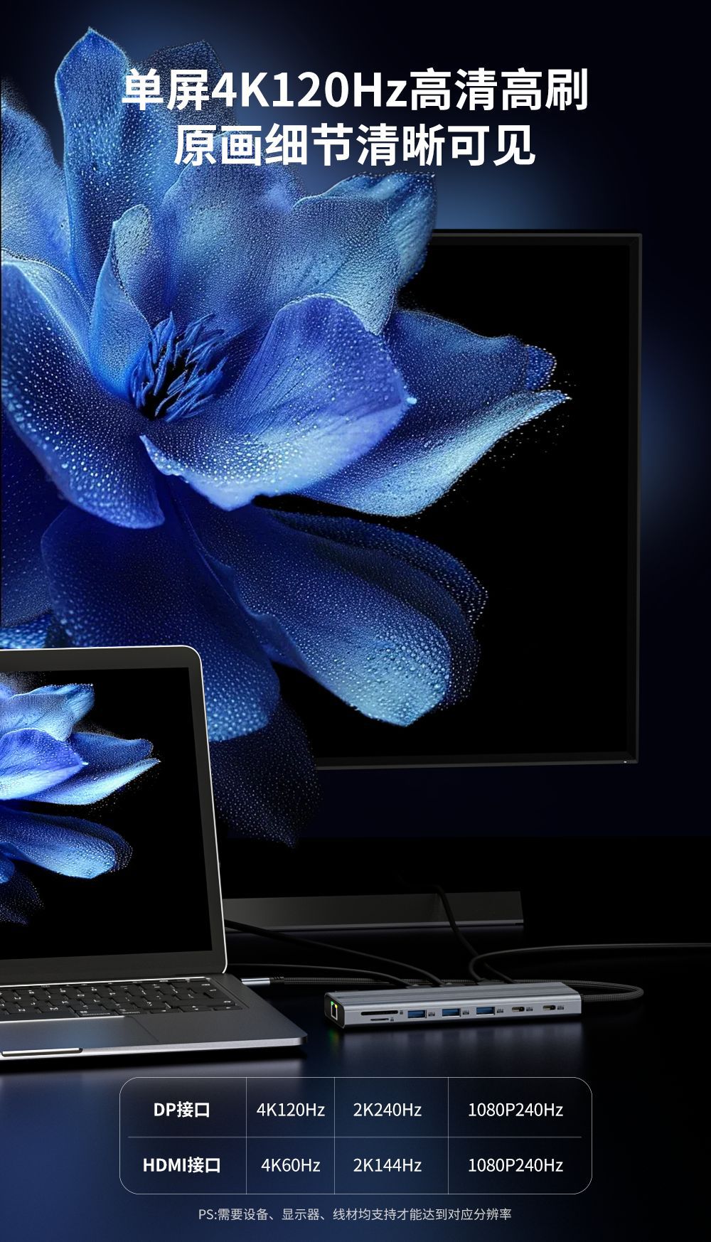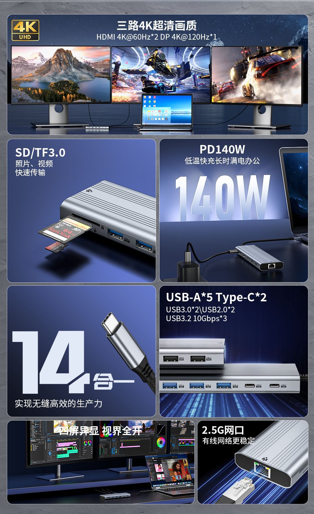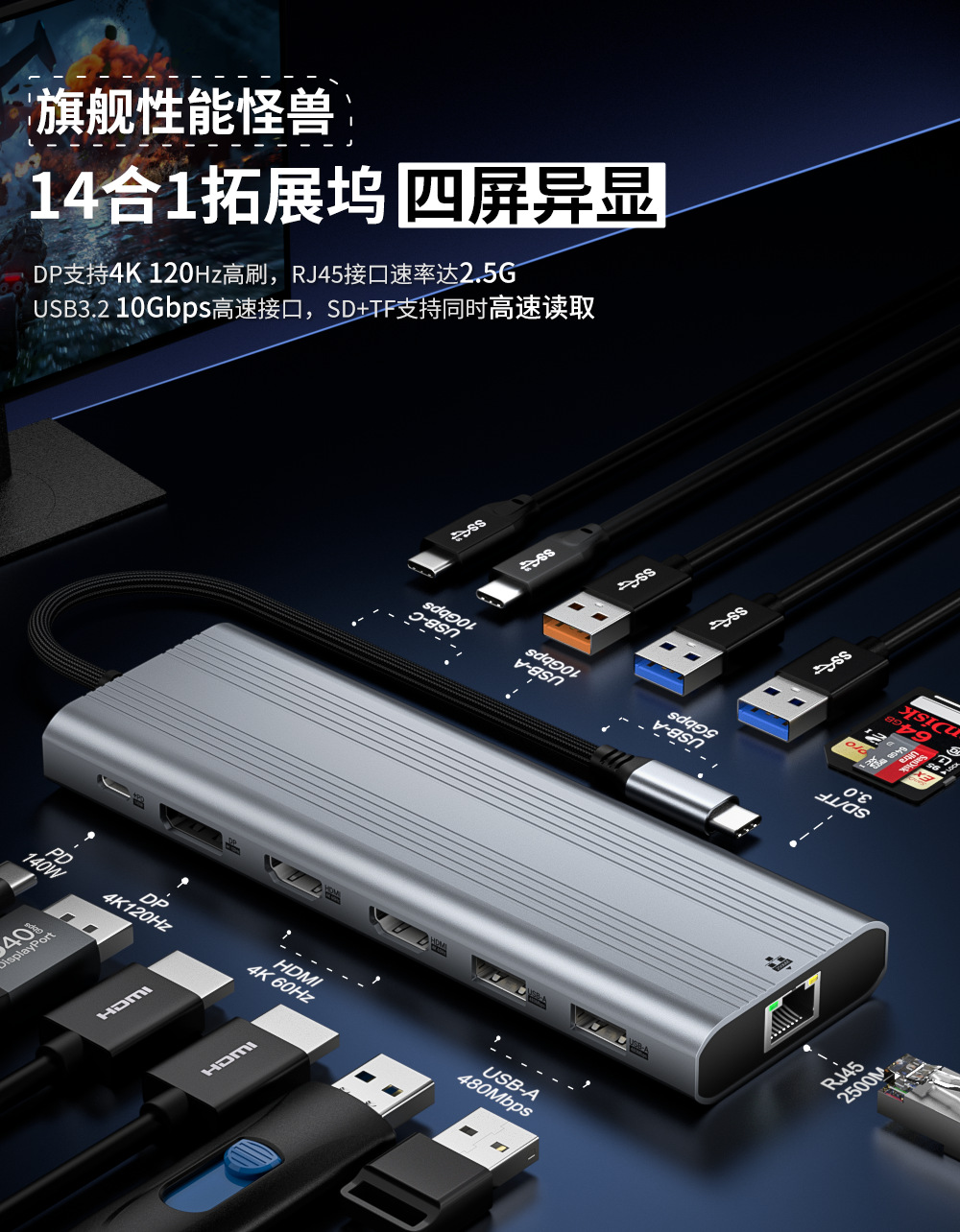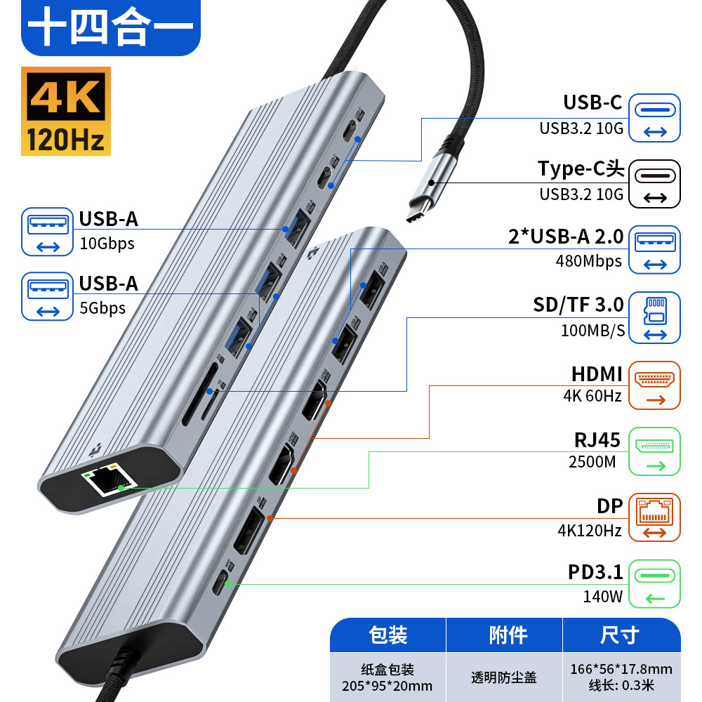 十四合一Type-C扩展坞 HDMI4K120Hz 三屏异显拓展坞usb3.0集线器