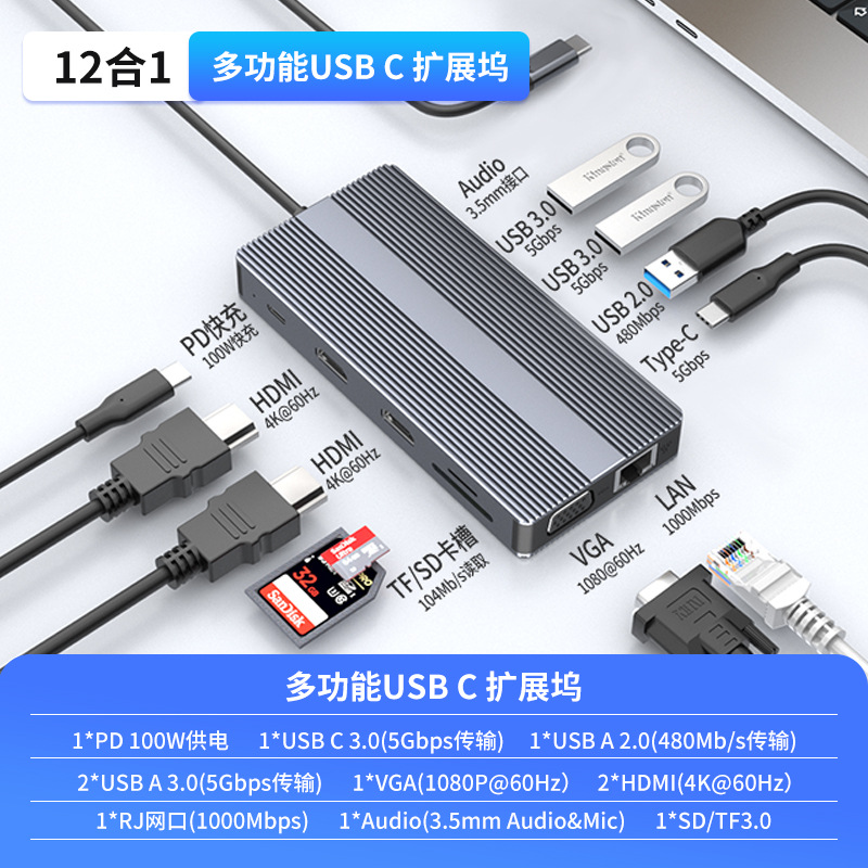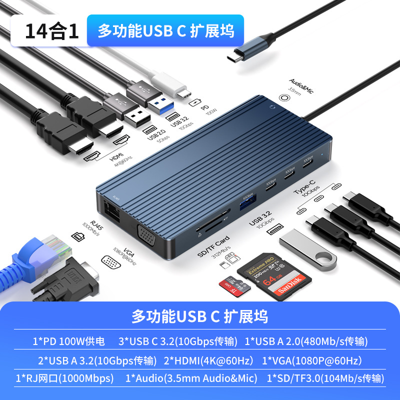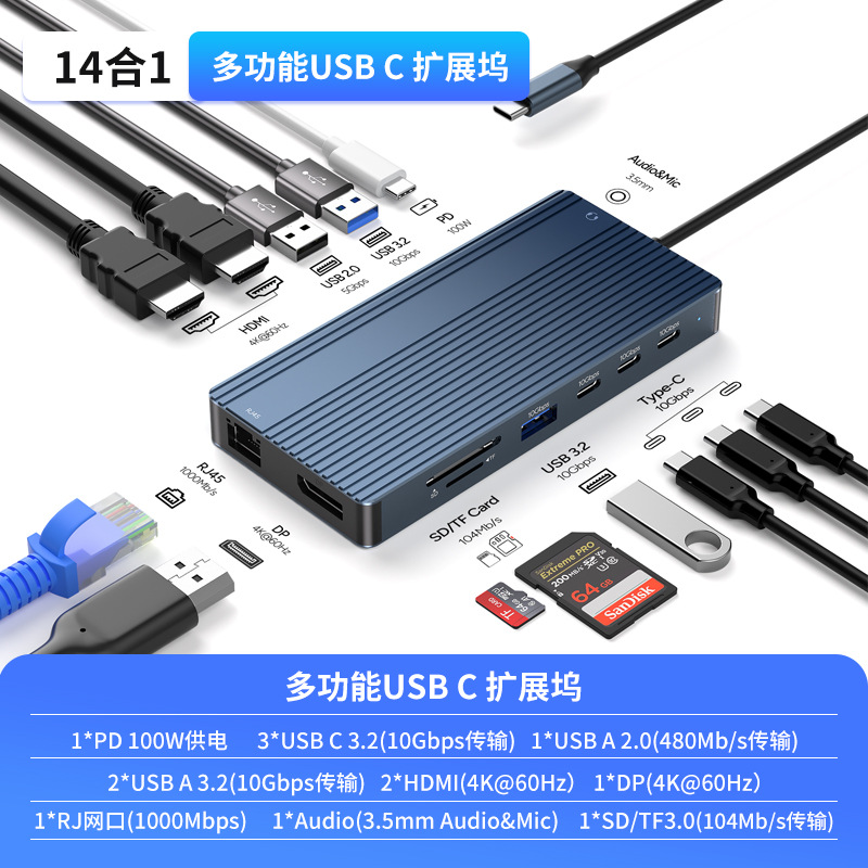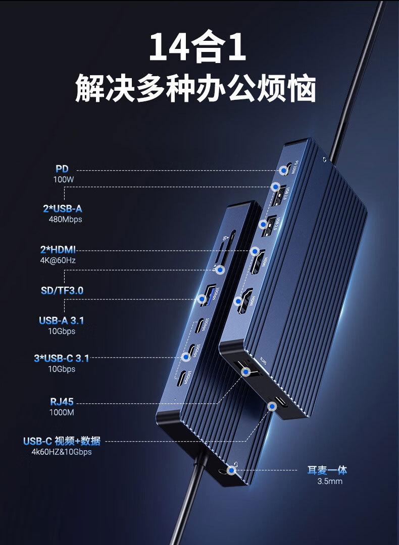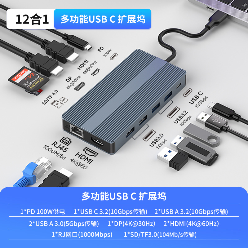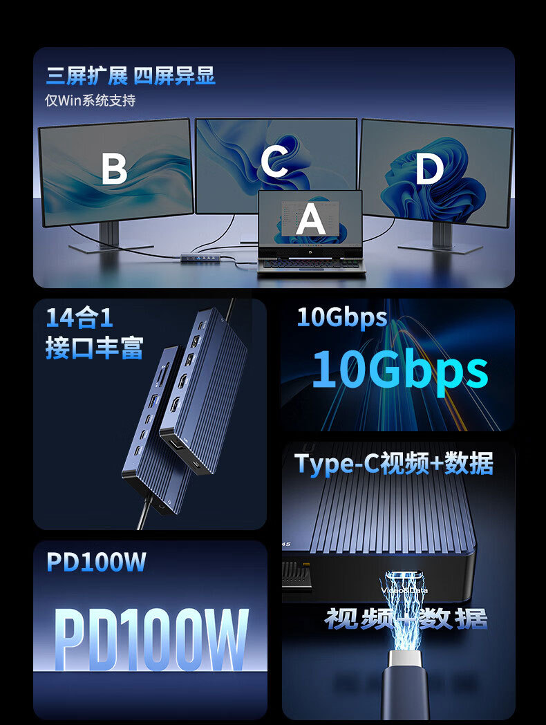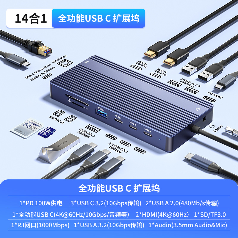 Type-C3.2扩展坞USB-C双HDMI拓展坞四屏异显4K60Hz全功能C视频口