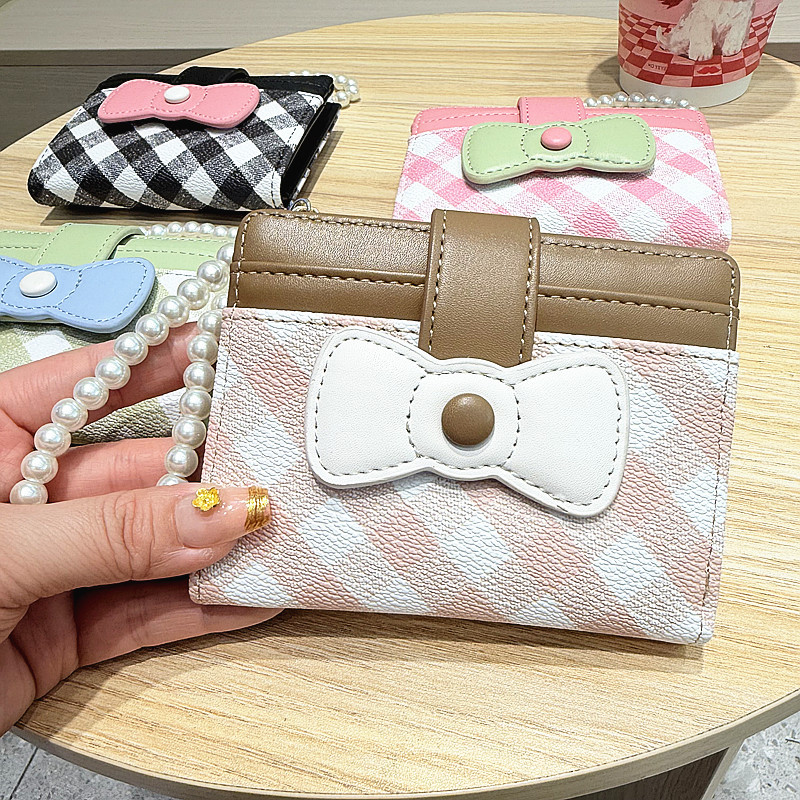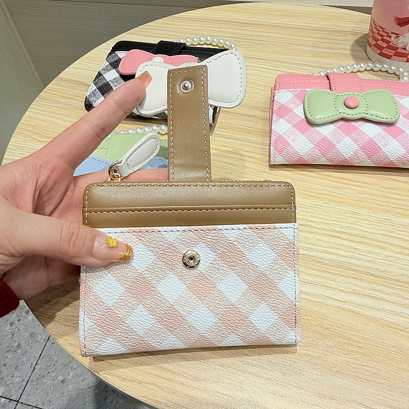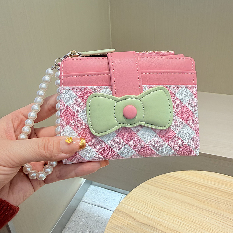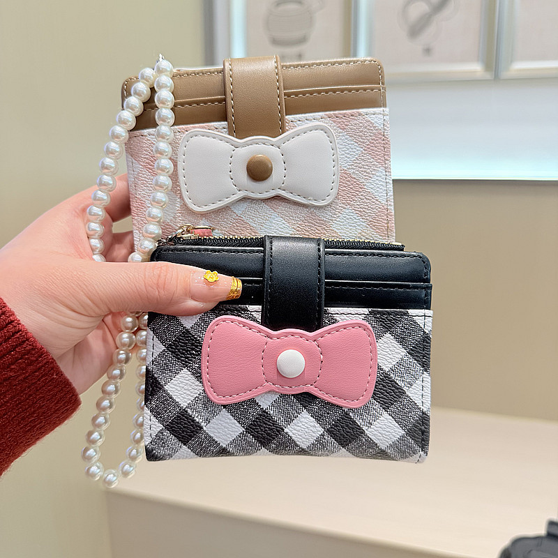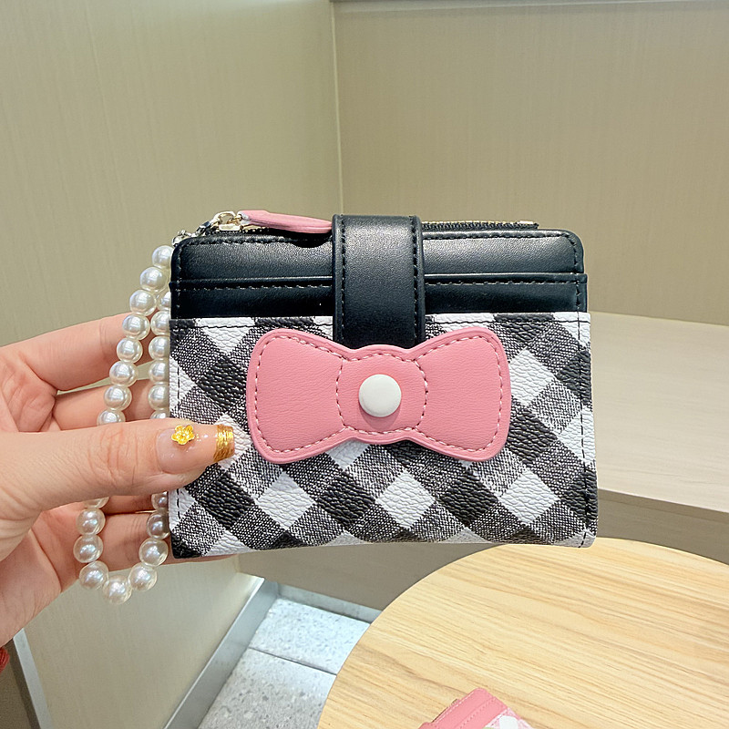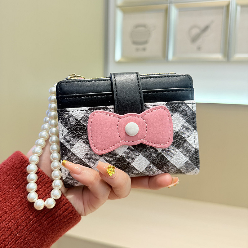 日韩新款可爱少女心蝴蝶结格纹拉链搭扣纹珍珠吊坠短款钱包