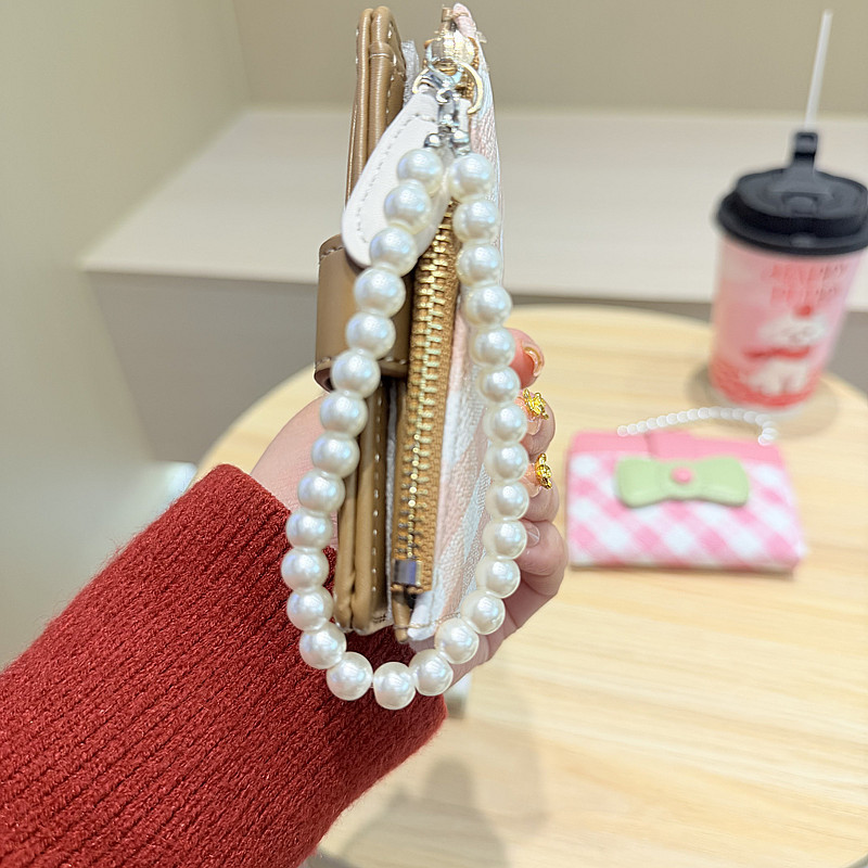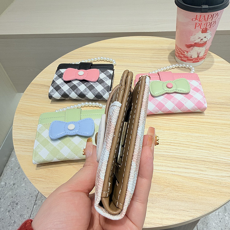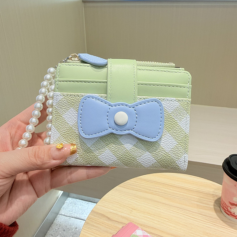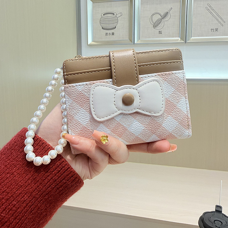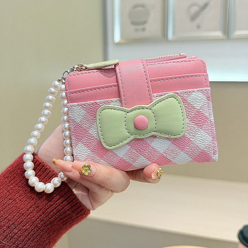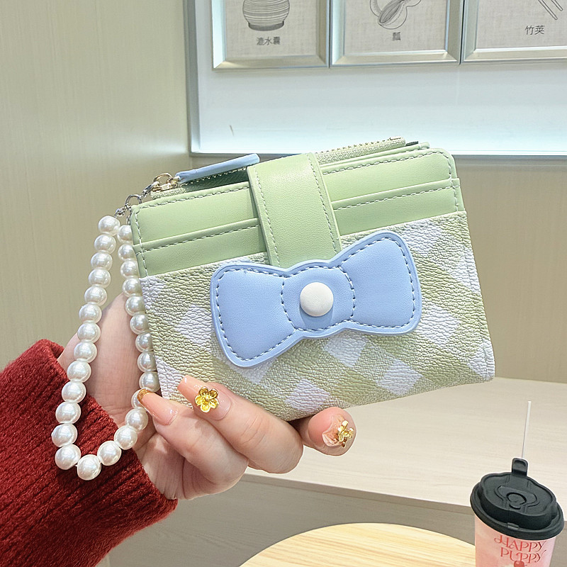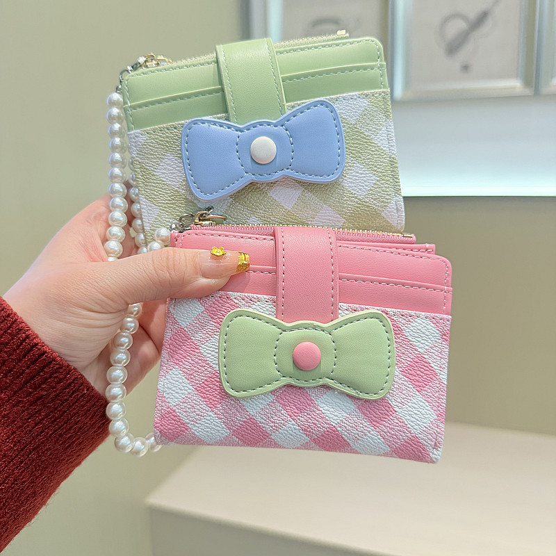 日韩新款可爱少女心蝴蝶结格纹拉链搭扣纹珍珠吊坠短款钱包