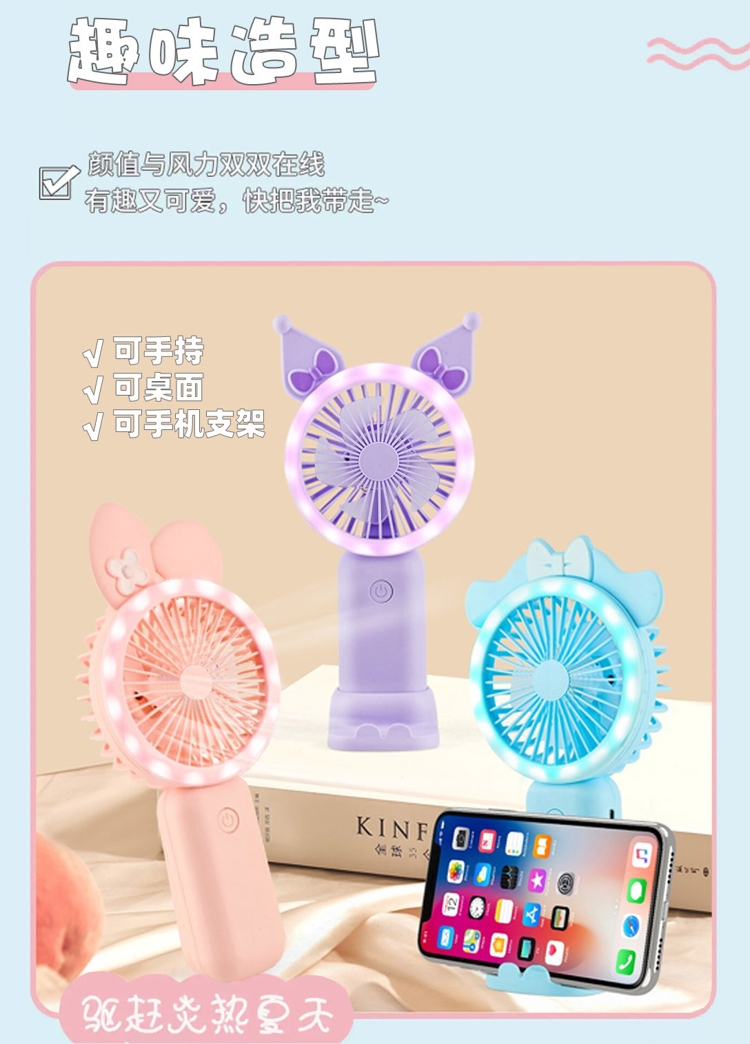 | 灯光+手持+手机支架+3档风速 | USD $1.87 | 49820 piece available |