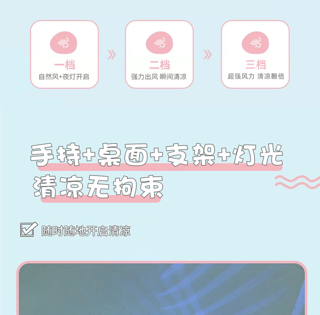 | 灯光+手持+手机支架+3档风速 | USD $1.87 | 49509 piece available |