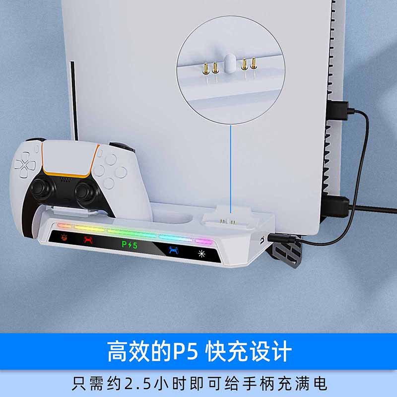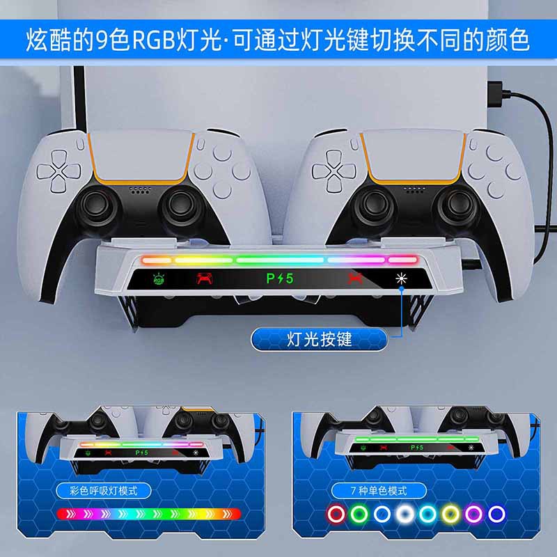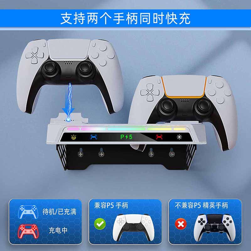 2. 能同时给2个PS5原装手柄充电,充电指示灯实时显示充电状态。