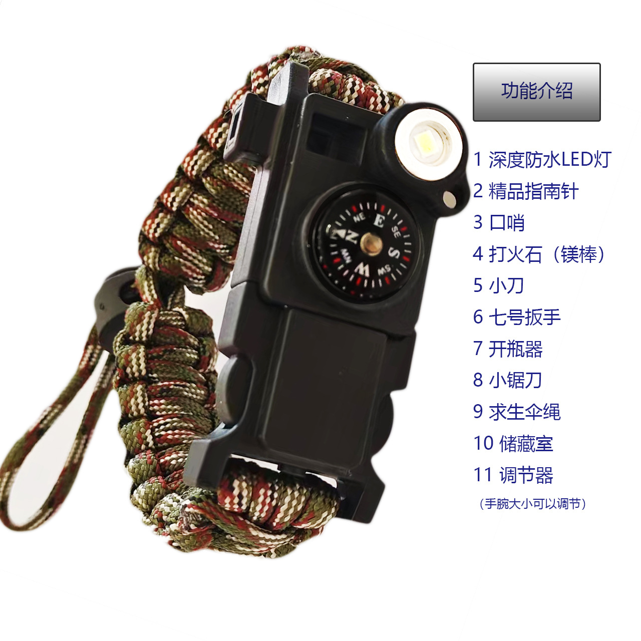 伞绳手链野外救生用品多功能小刀破窗手环LED灯 野外求生 SOS手镯