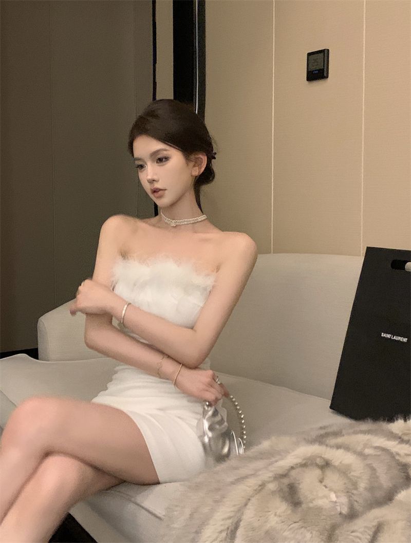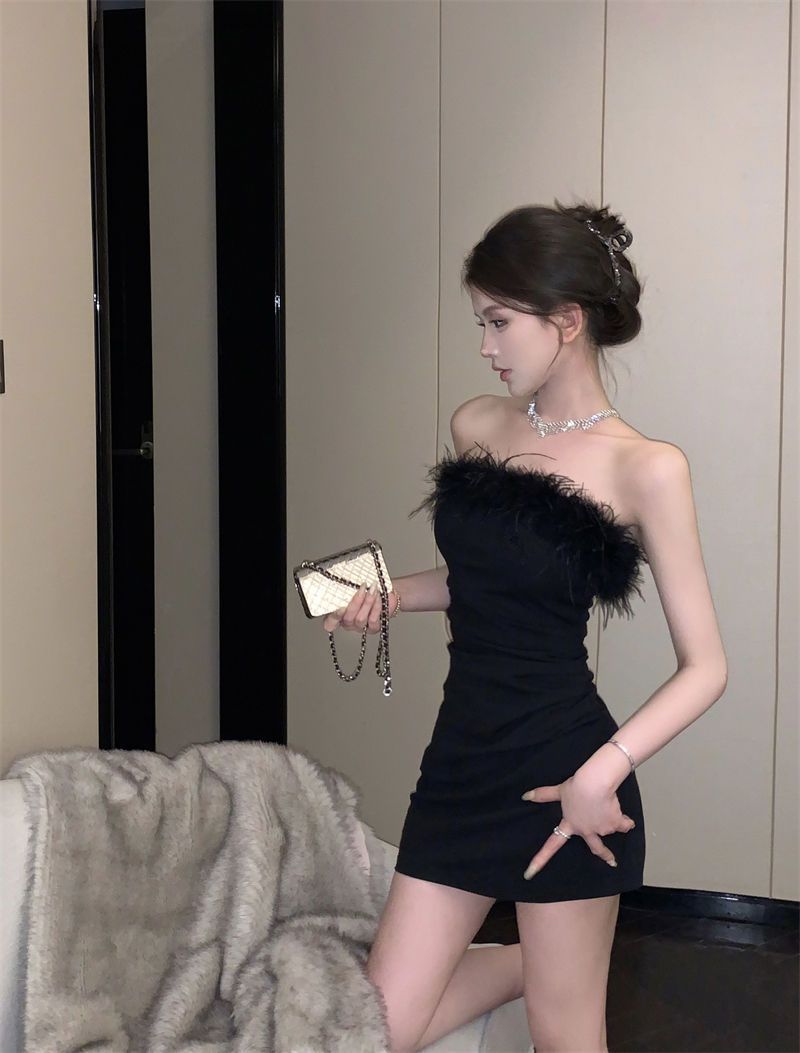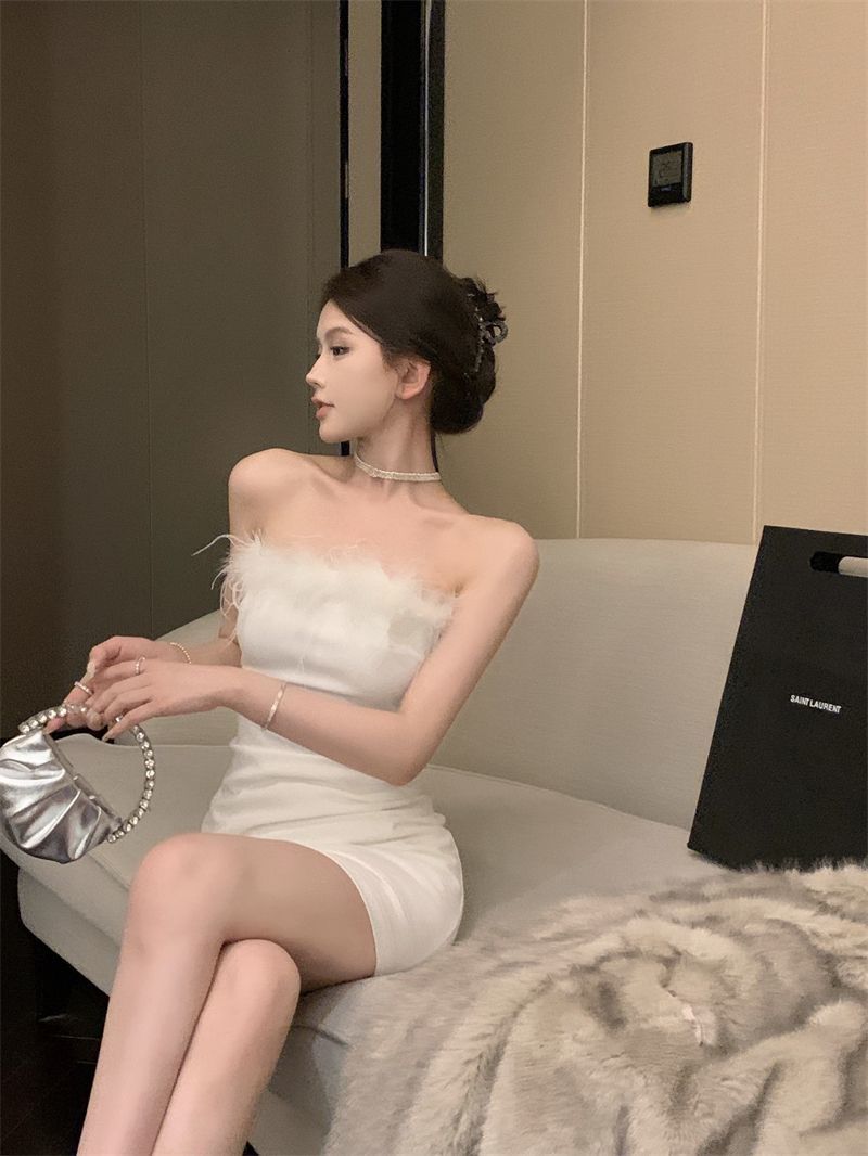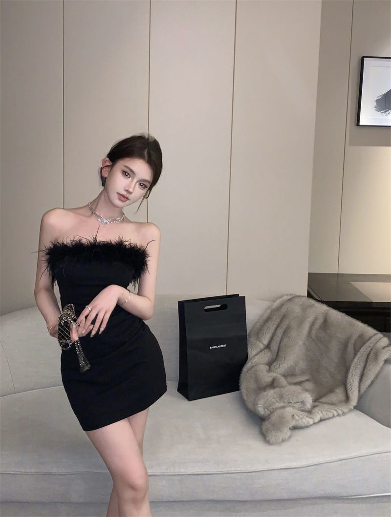 泰式新款名媛包臀裙性感抹胸款毛毛抹胸连衣裙气质显瘦高级短裙女