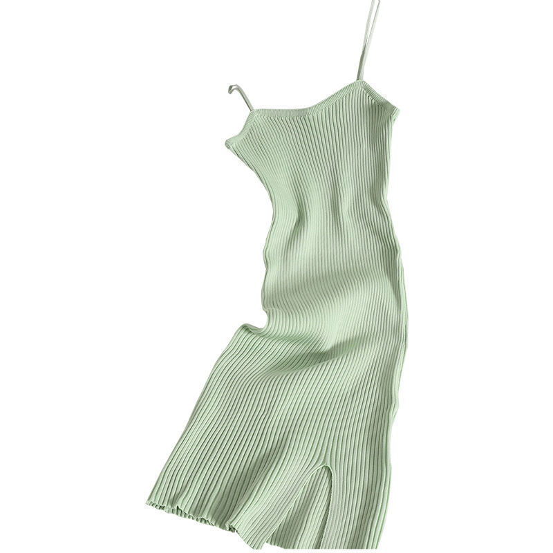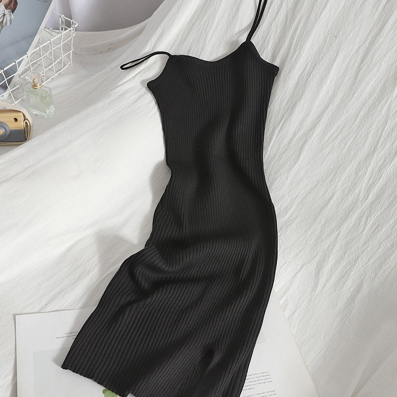 修身弹力针织裙夏装新款色百搭吊带裙开叉包臀短裙打底连衣裙女