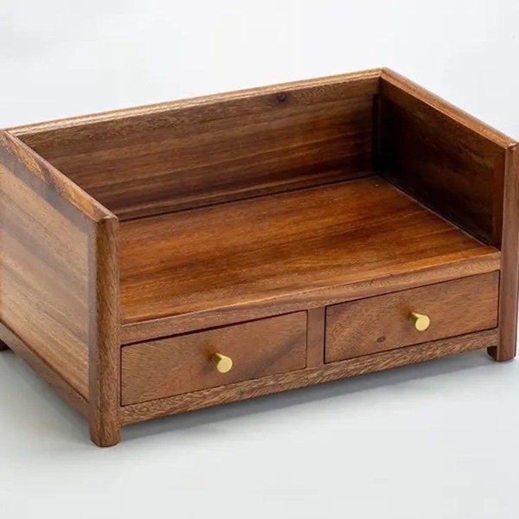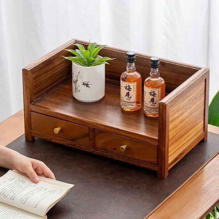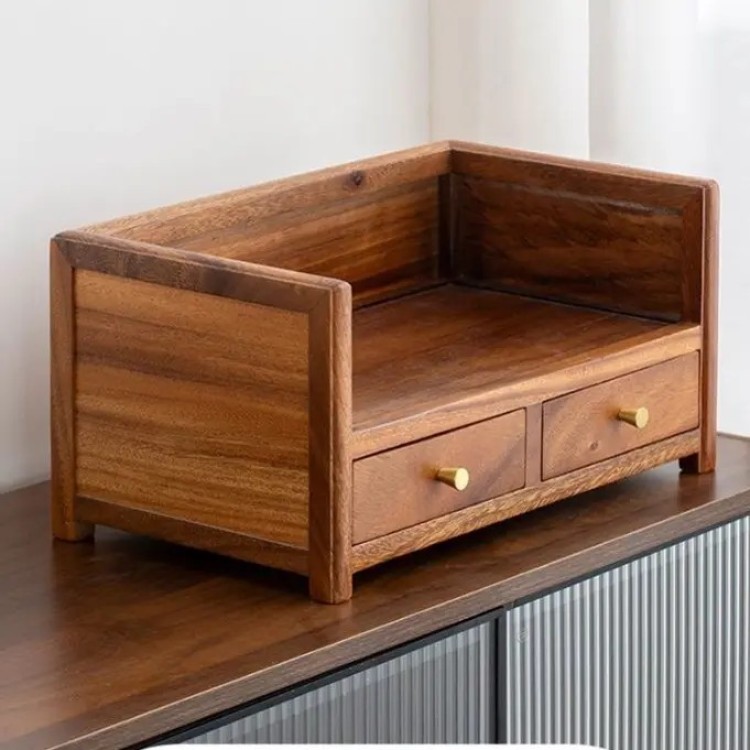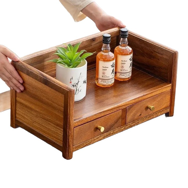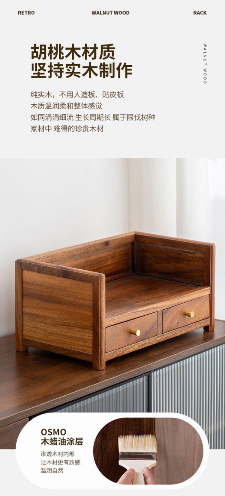 胡桃木双层抽屉式桌面收纳盒实木家用茶饼整理新中式茶几置物盒