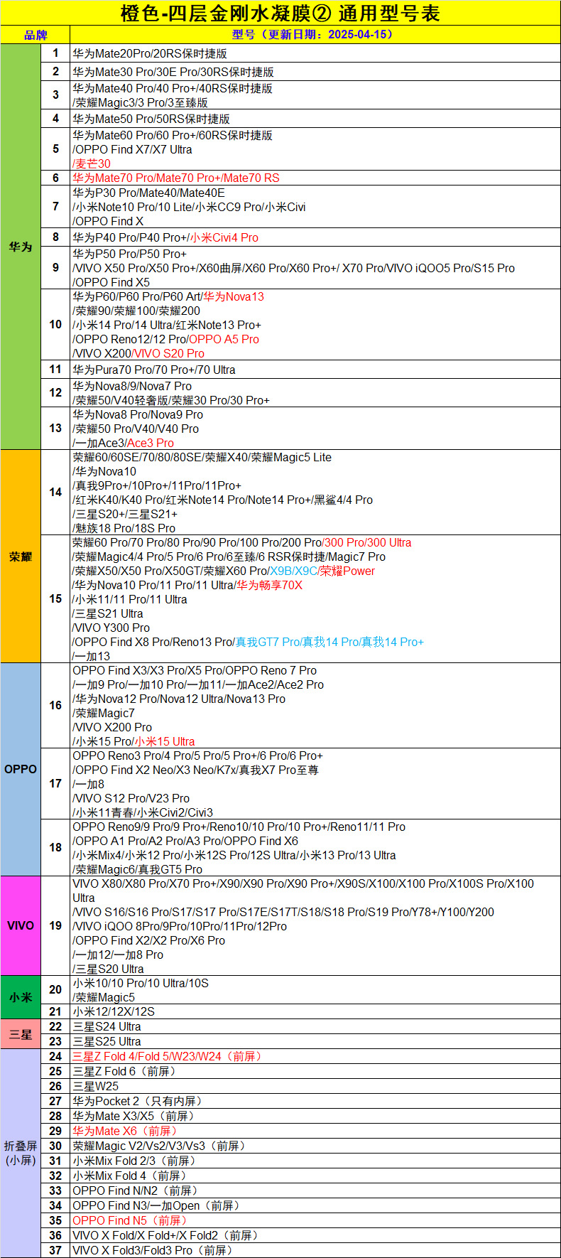 该款高清水凝膜摄像头不开孔,高清材质对于前置摄像头拍照几乎是不影响的,不开孔的设计膜贴上手机会比较美观。开孔的膜在孔的位置容易积灰,不开孔刚好可以避免这个问题。而且不开孔的话通用型号比较多,对于做贴膜的店备库存的压力也没那么大,以下是通用型号表: