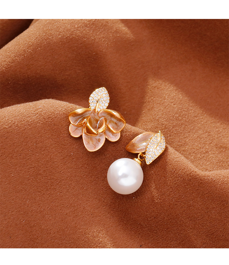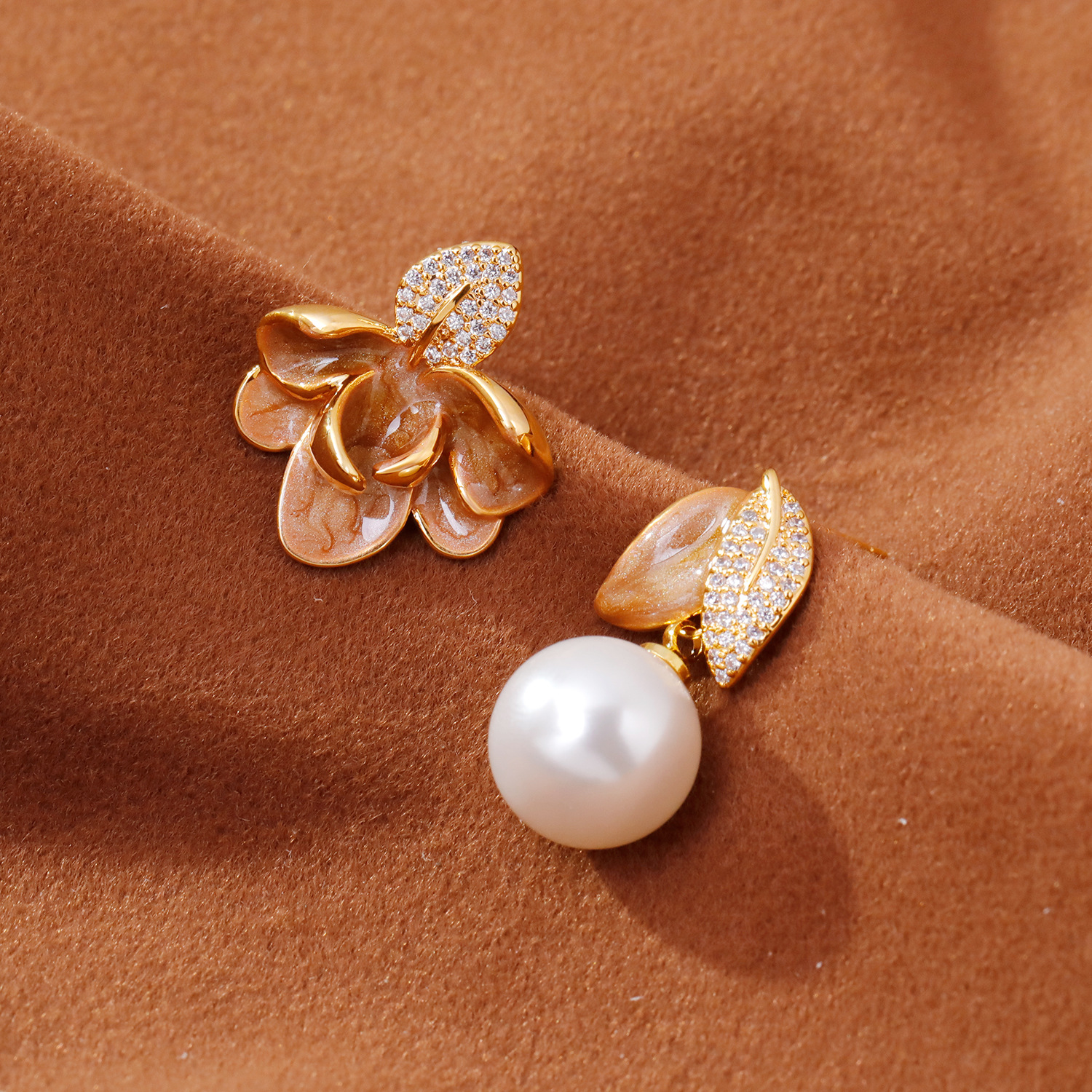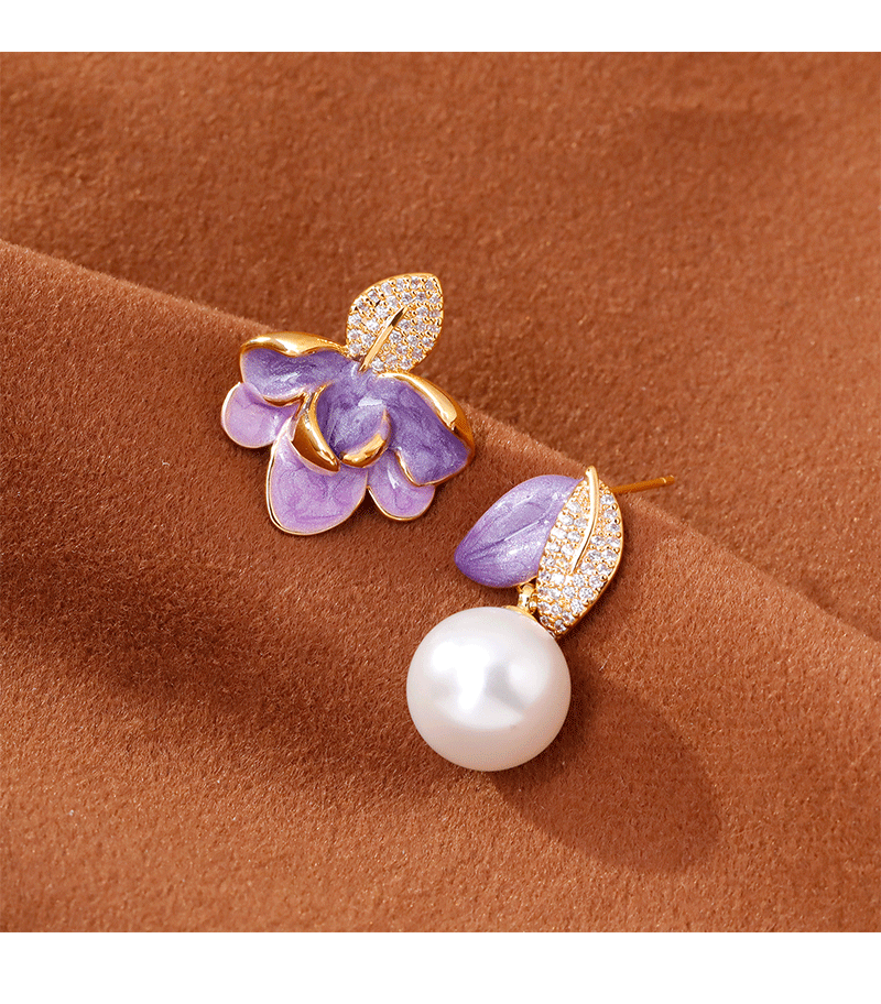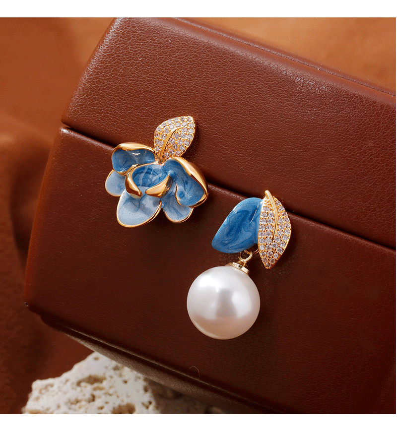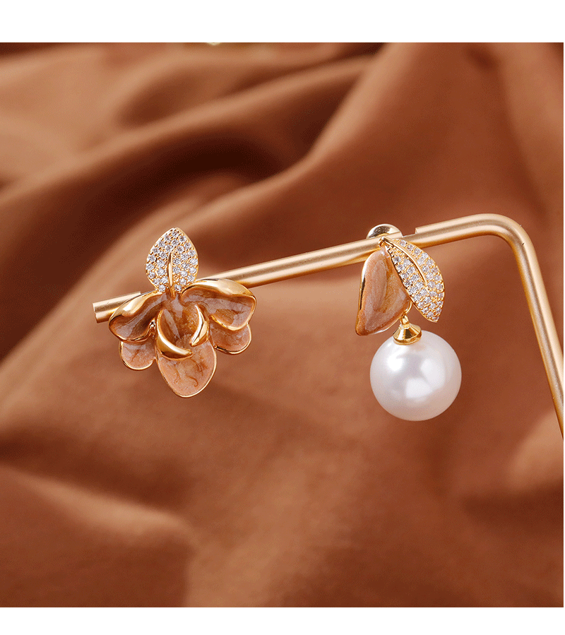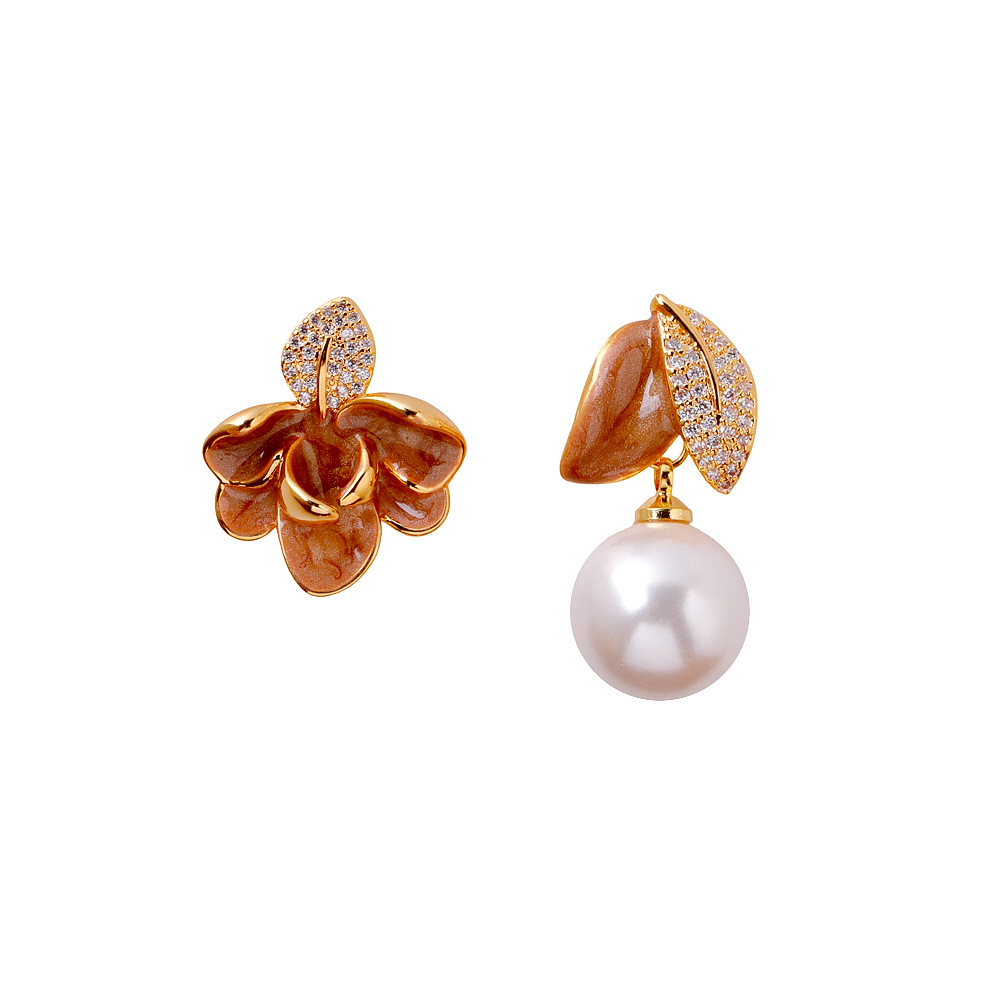 2025抖音爆款不对称滴釉珐琅耳环时尚轻奢气质高级感树叶珍珠耳坠