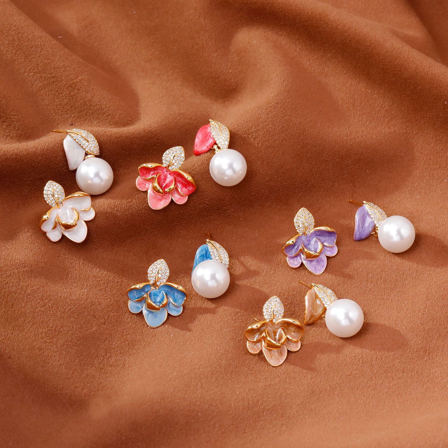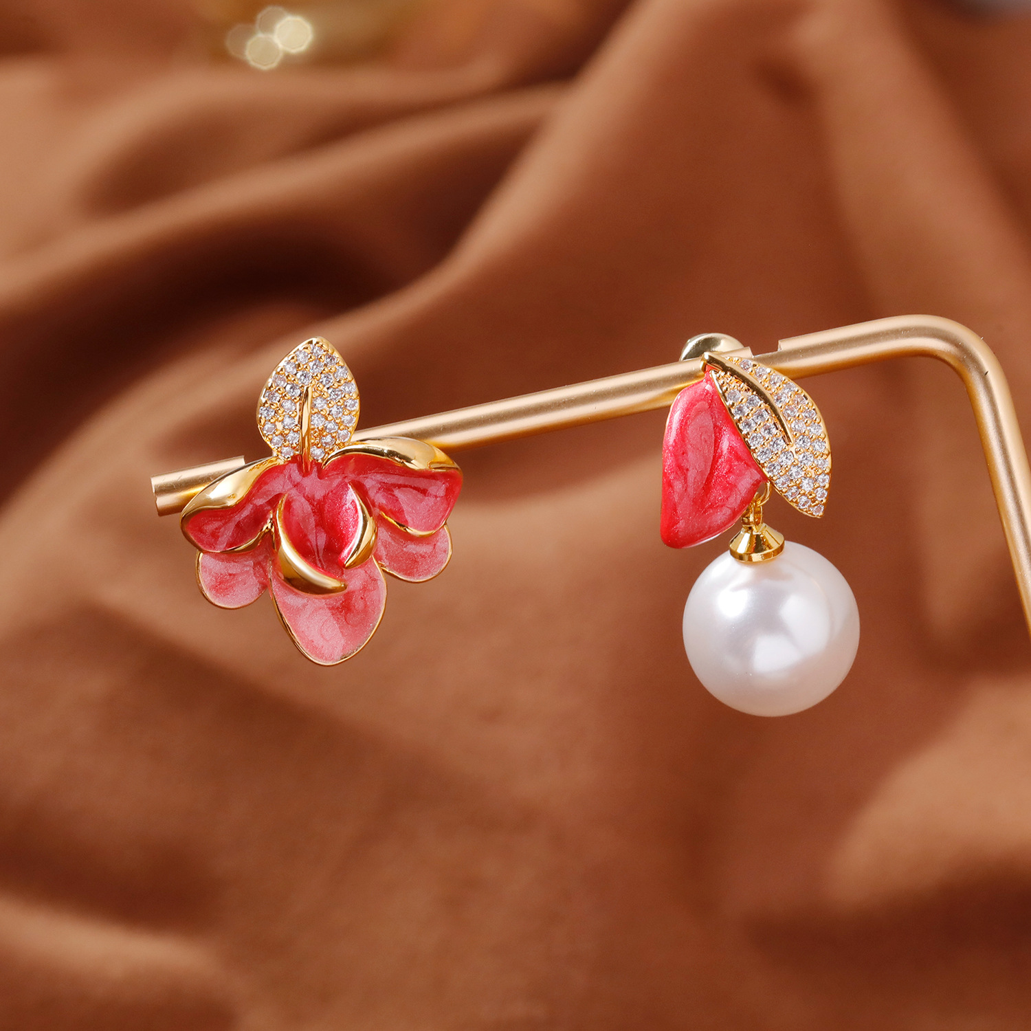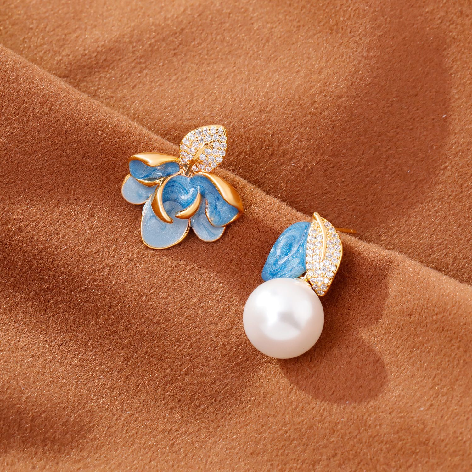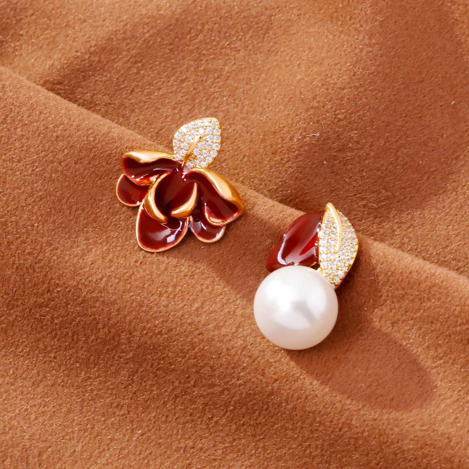2025抖音爆款不对称滴釉珐琅耳环时尚轻奢气质高级感树叶珍珠耳坠