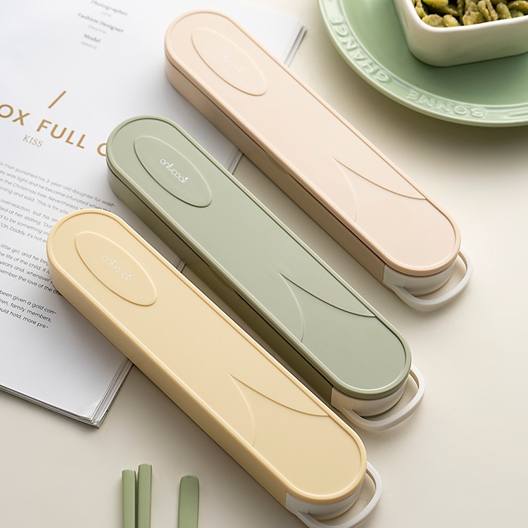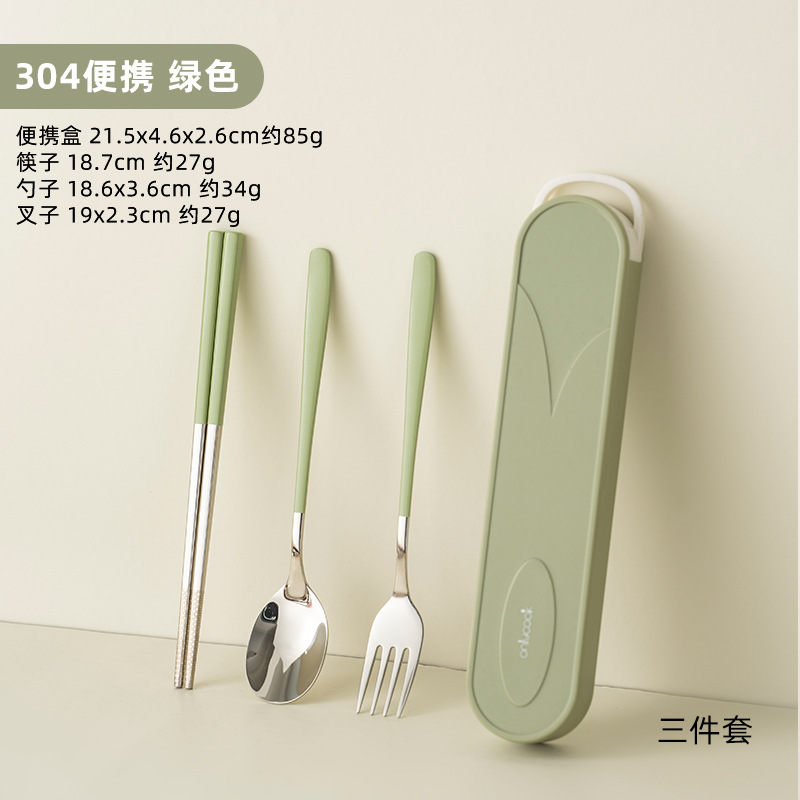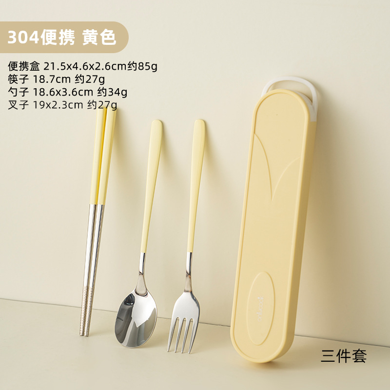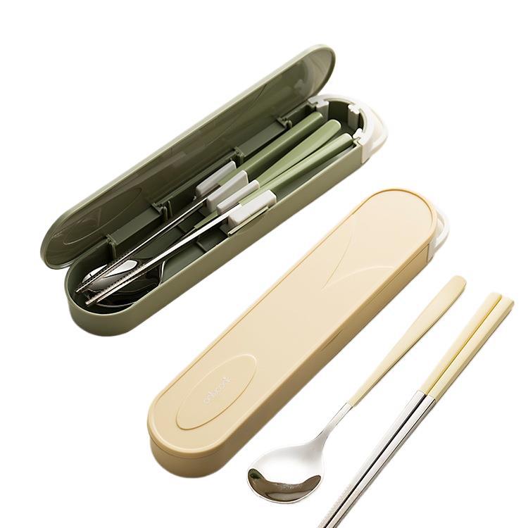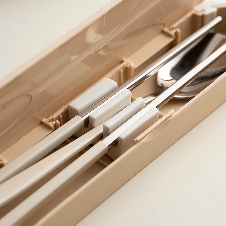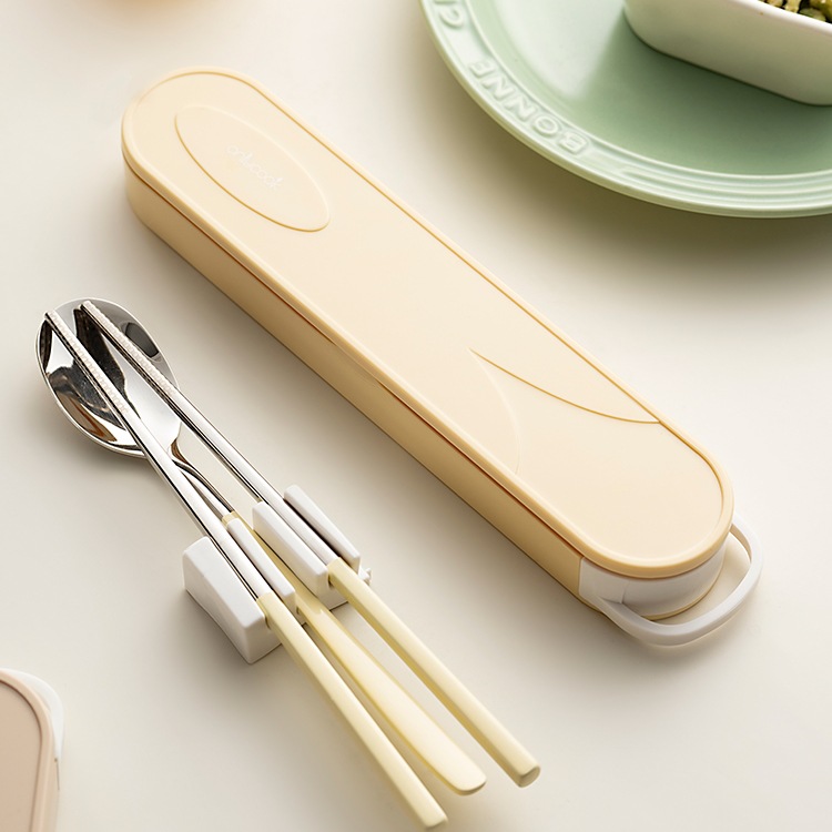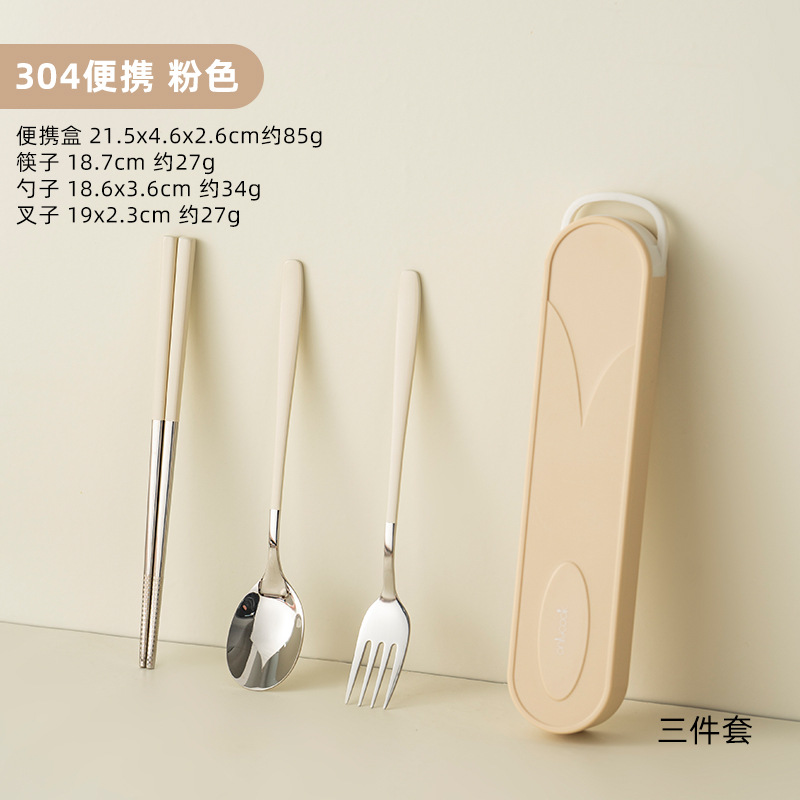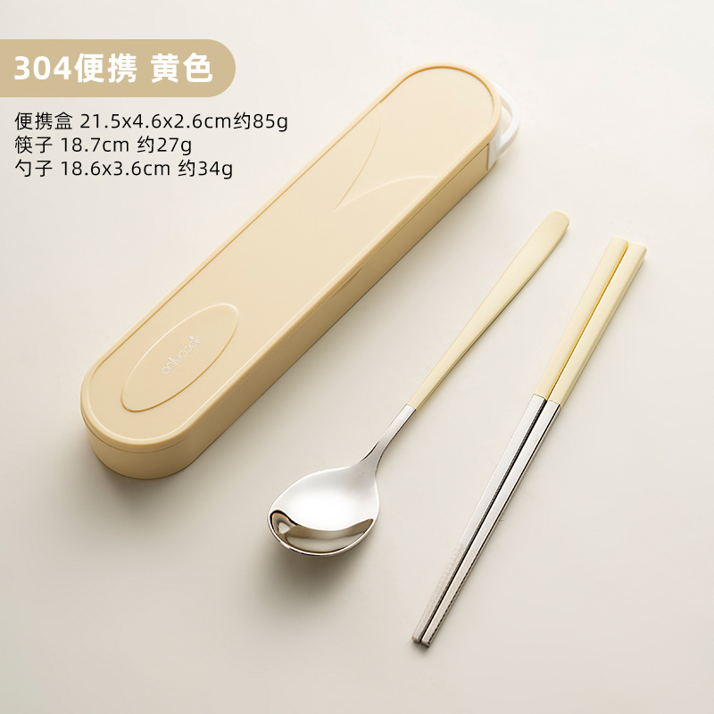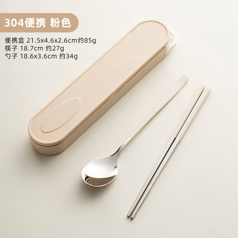 奶油色学生便携餐具 304不锈钢筷勺套装筷子勺子收纳盒