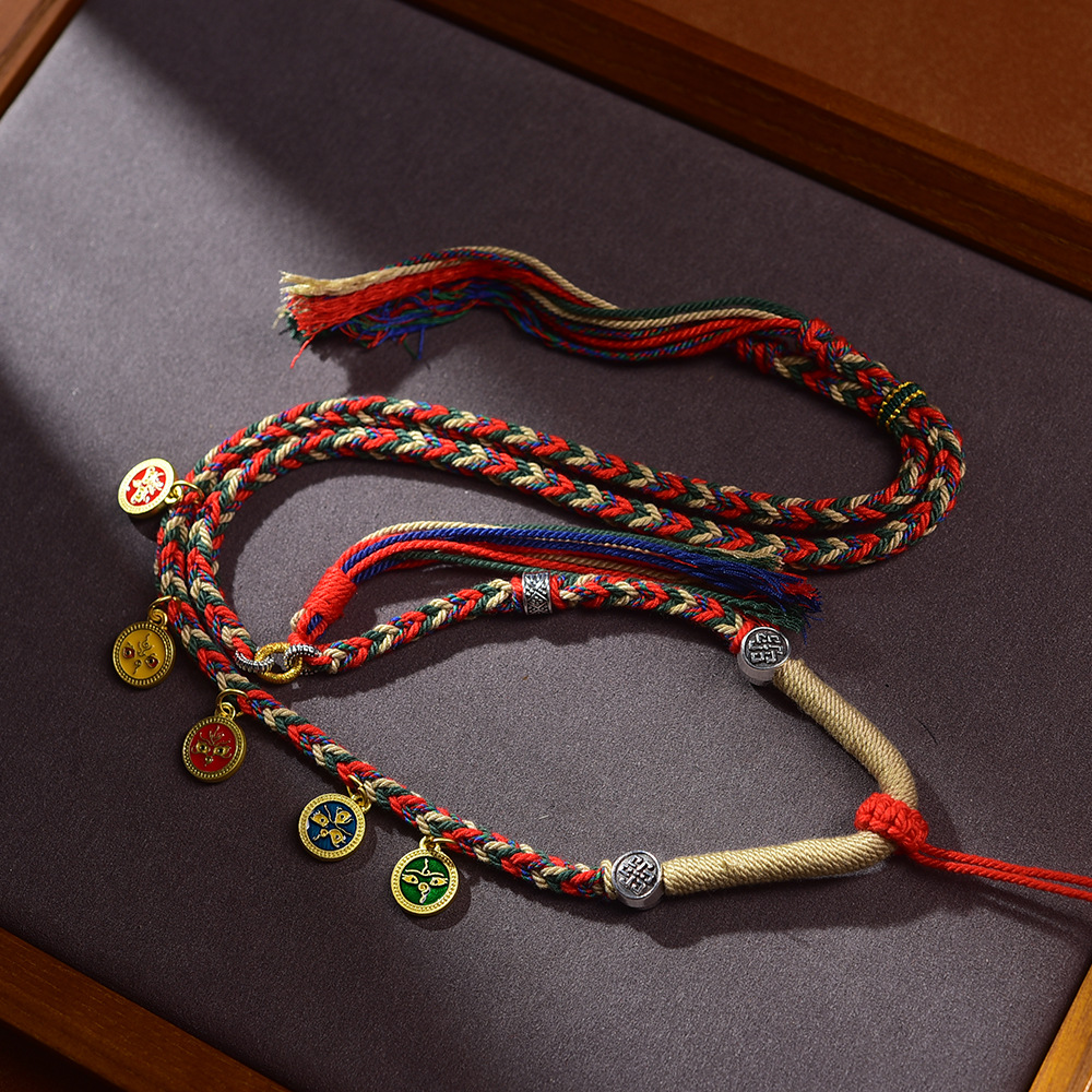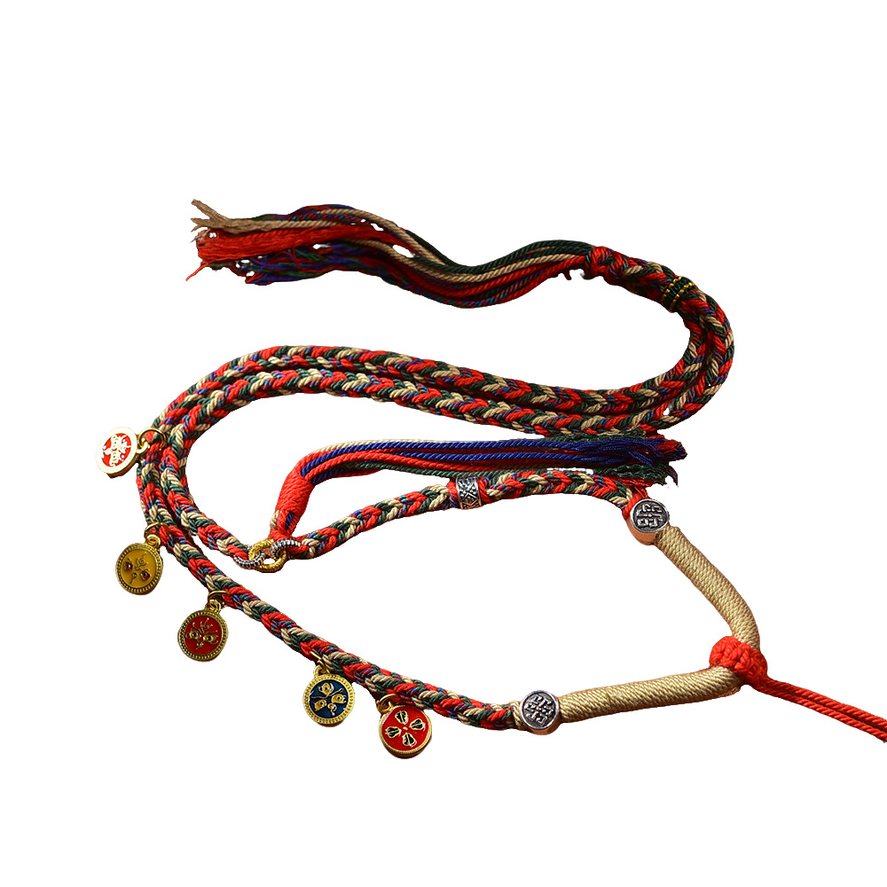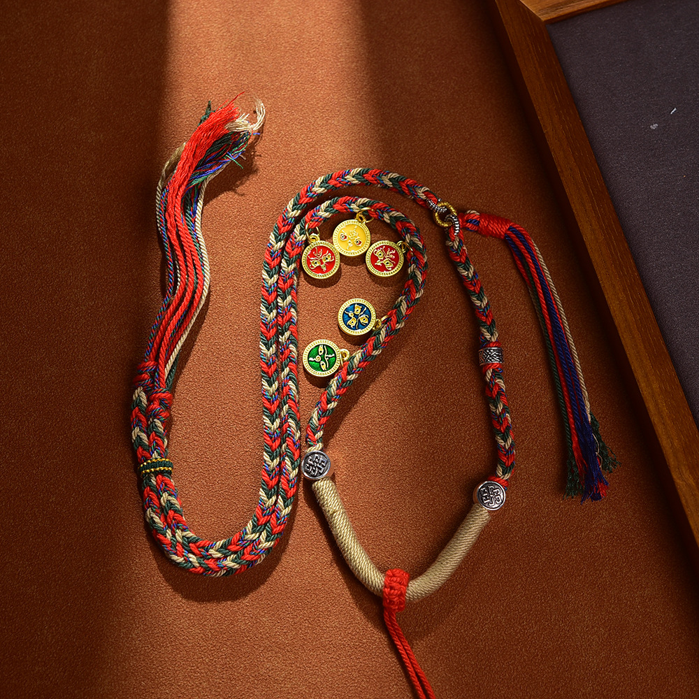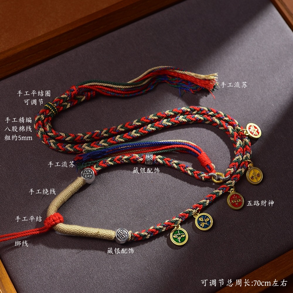 藏式五路财神吊坠绳唐卡项链绳佛牌配绳朱砂吊坠挂绳手工编五彩绳