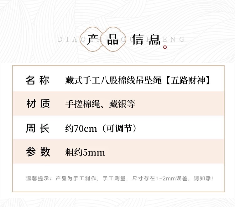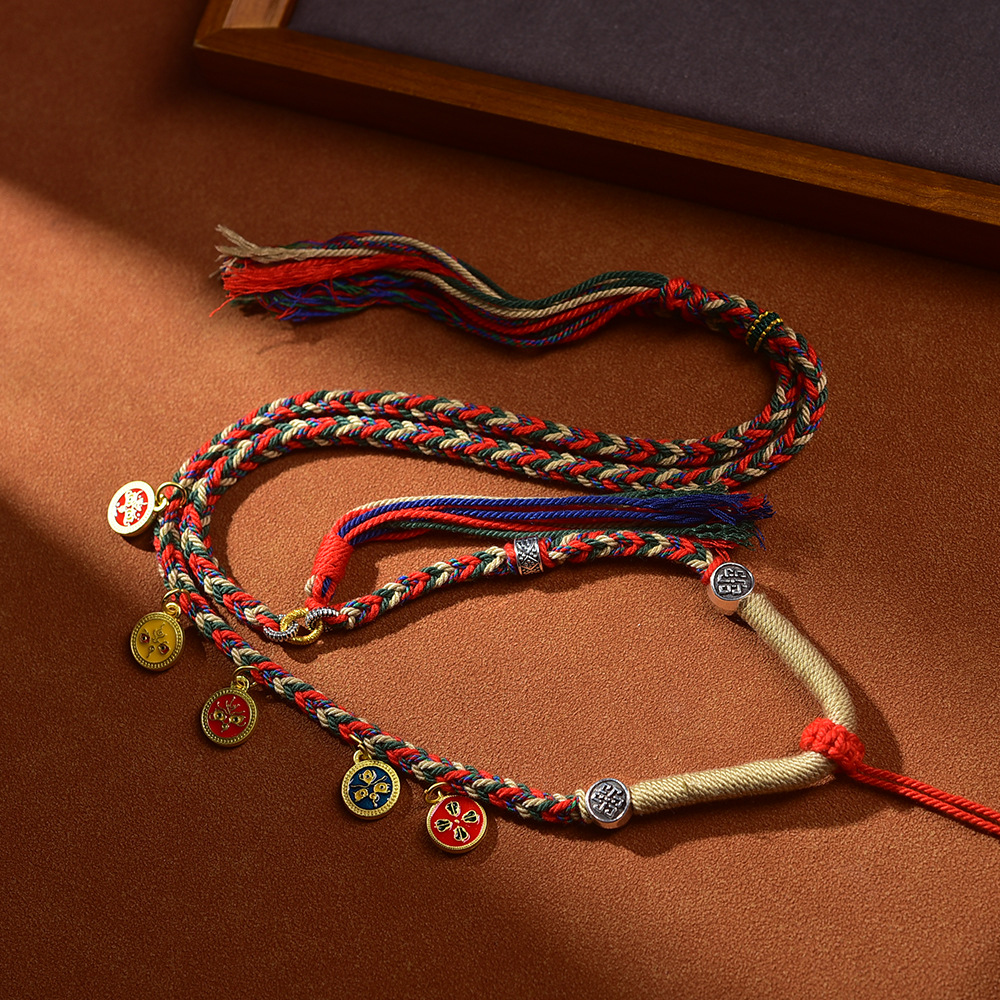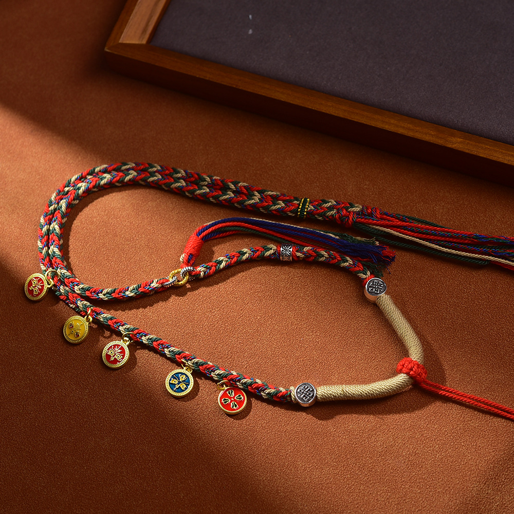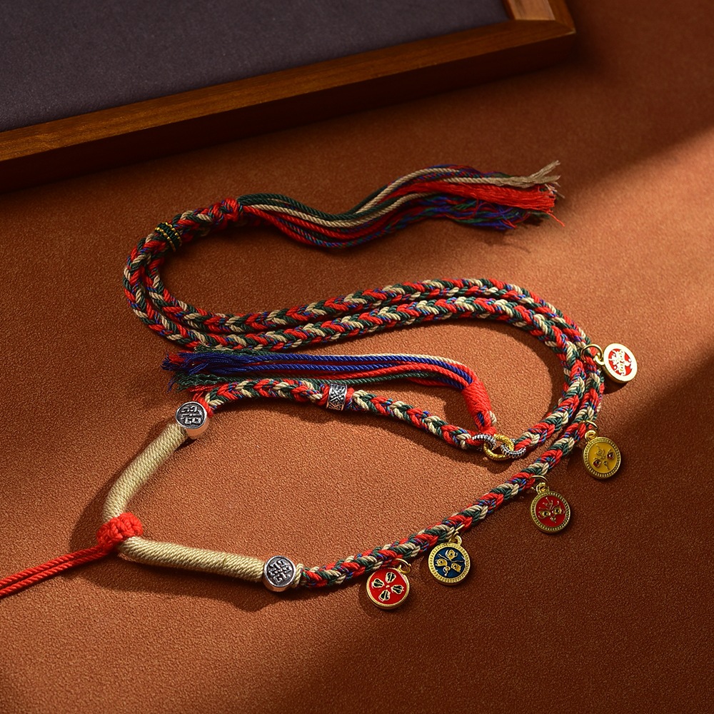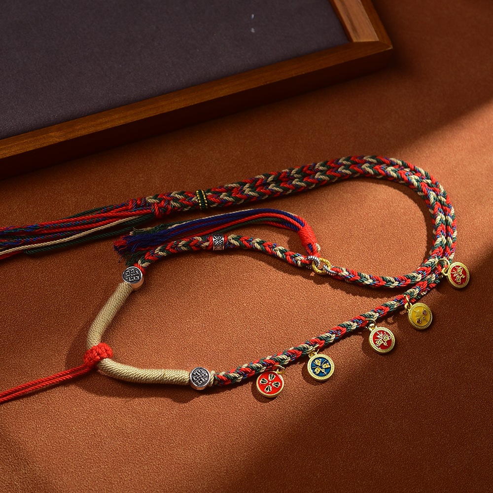 藏式五路财神吊坠绳唐卡项链绳佛牌配绳朱砂吊坠挂绳手工编五彩绳