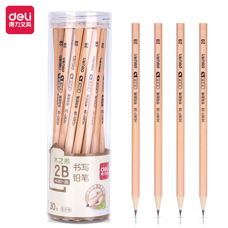 30支装得力HC907六角杆原木铅笔带橡皮擦2B/HB考试美术素描写字笔