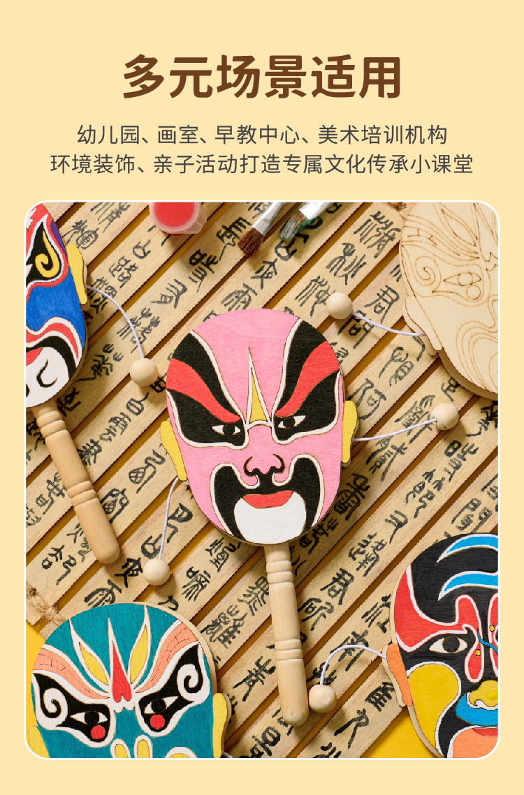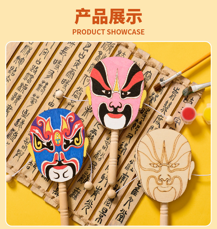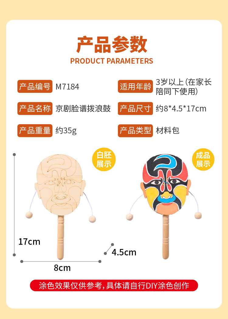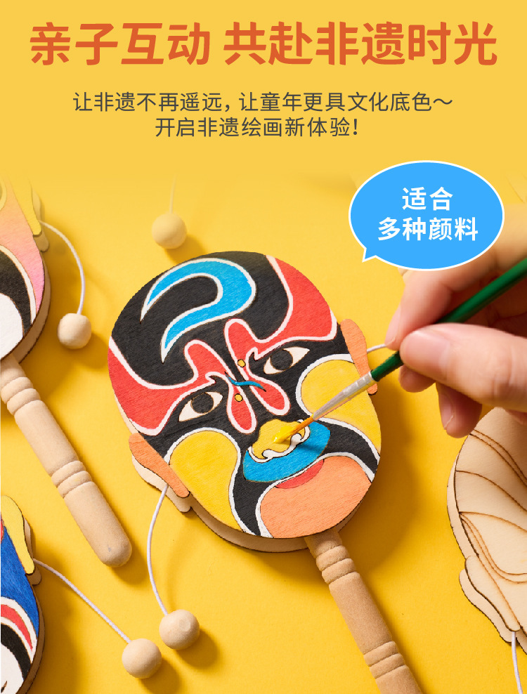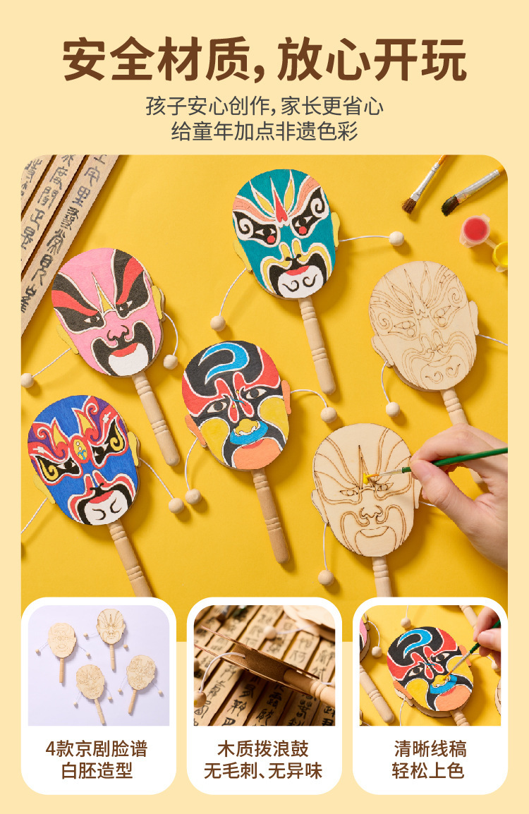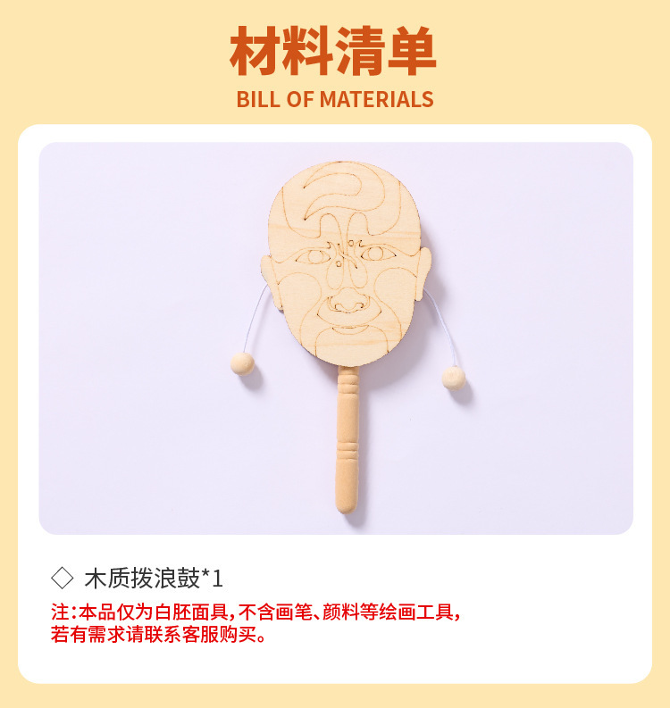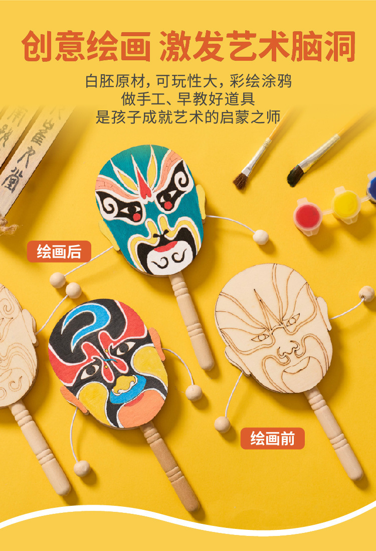 京剧脸谱拨浪鼓手工diy儿童制作材料幼儿园创意美术木质涂色玩具