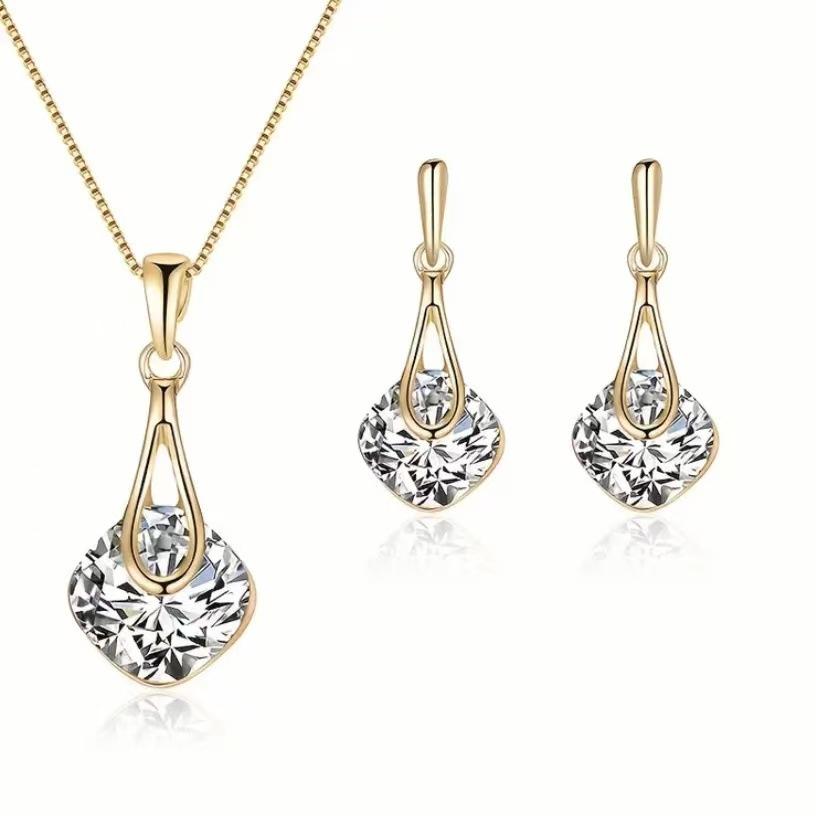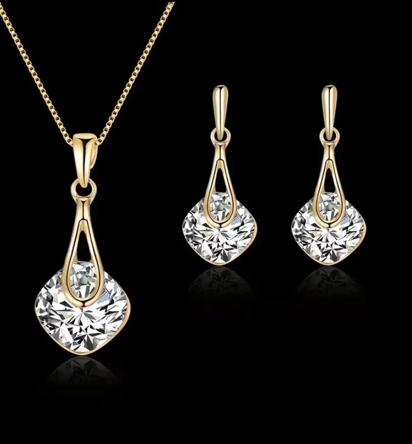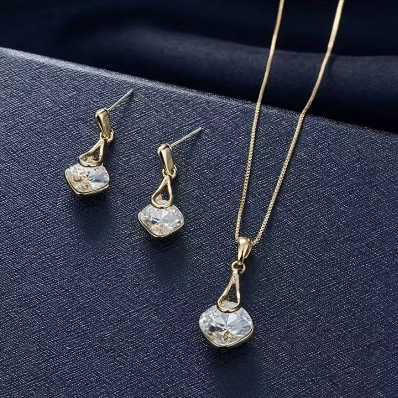 欧美时尚方形水晶项链耳环套装新娘配饰品批发宝石项饰品批发