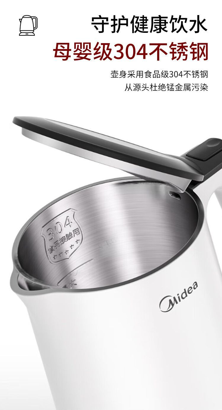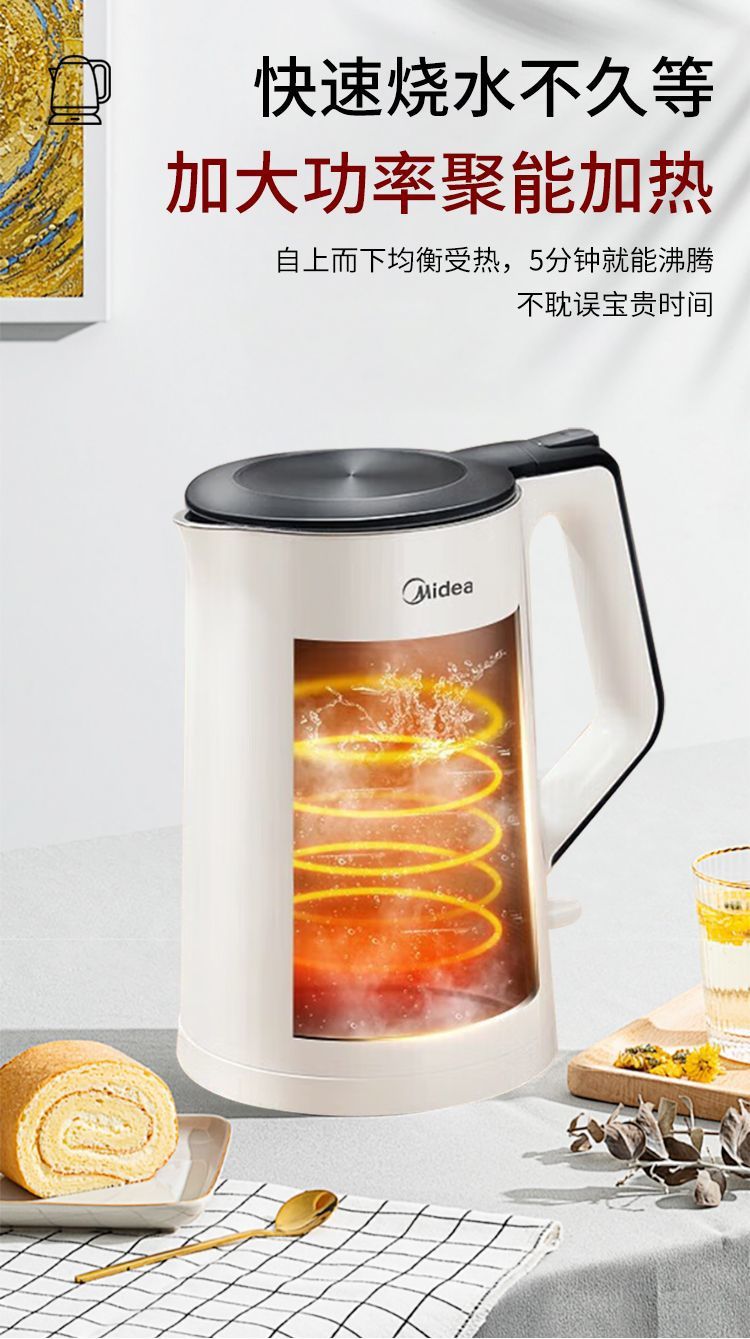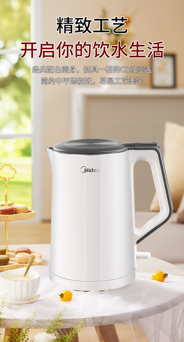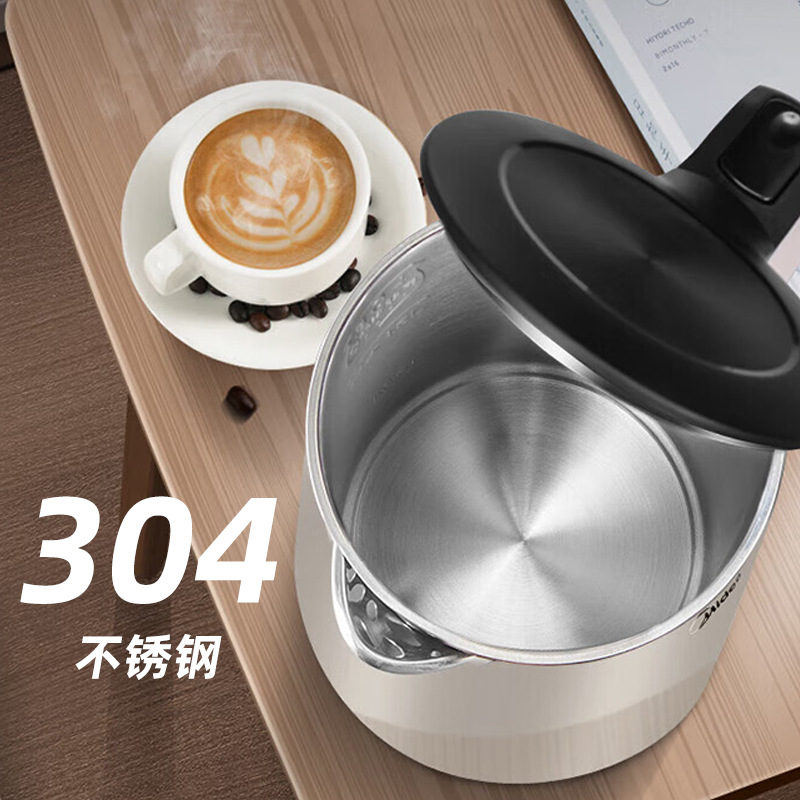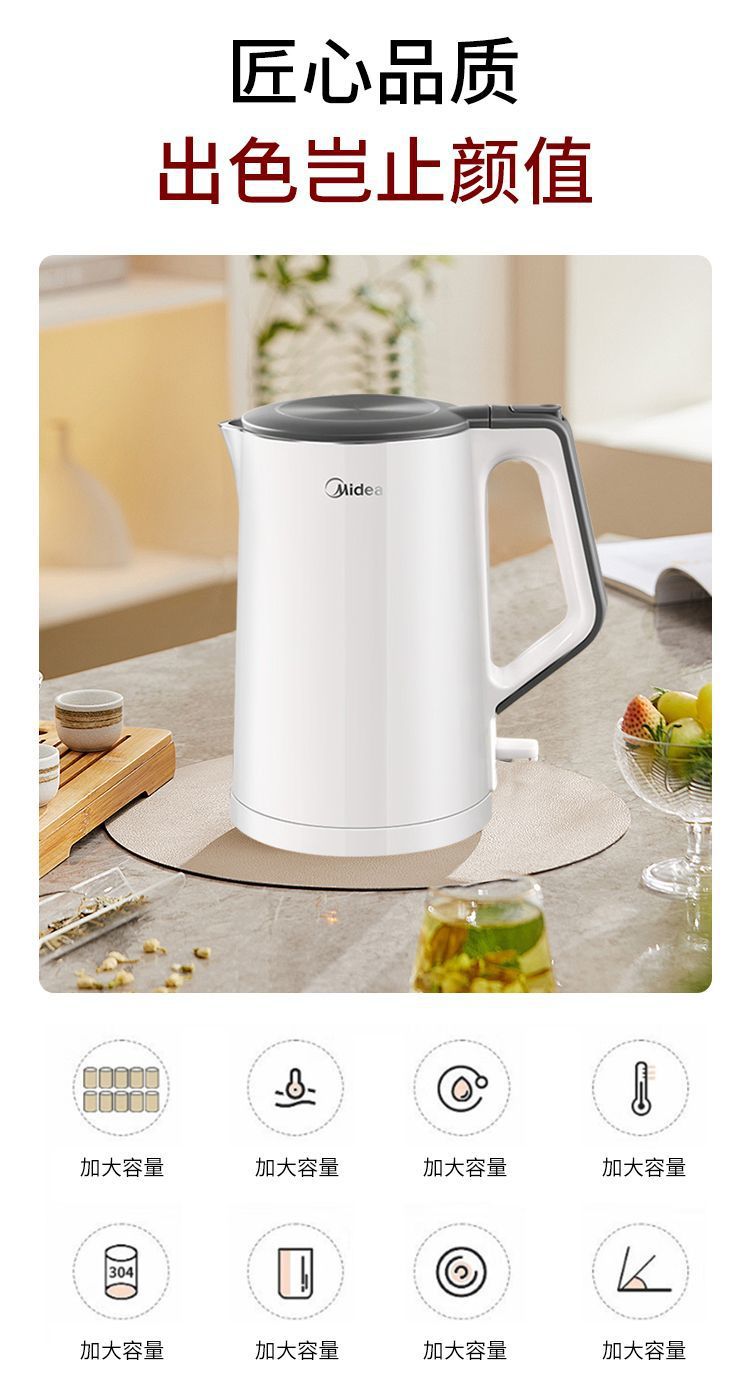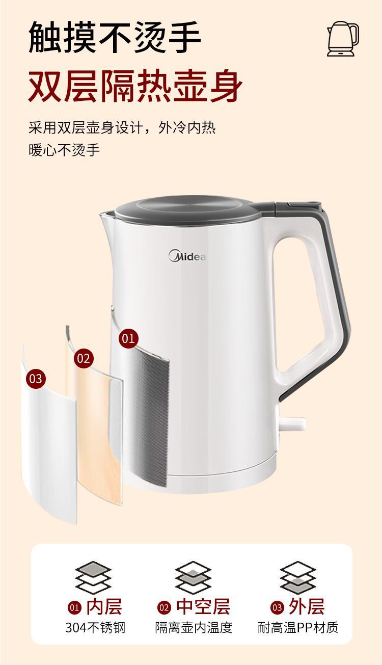 美的电热水壶家用烧水壶无缝一体内胆双层防烫烧水快速壶小型304