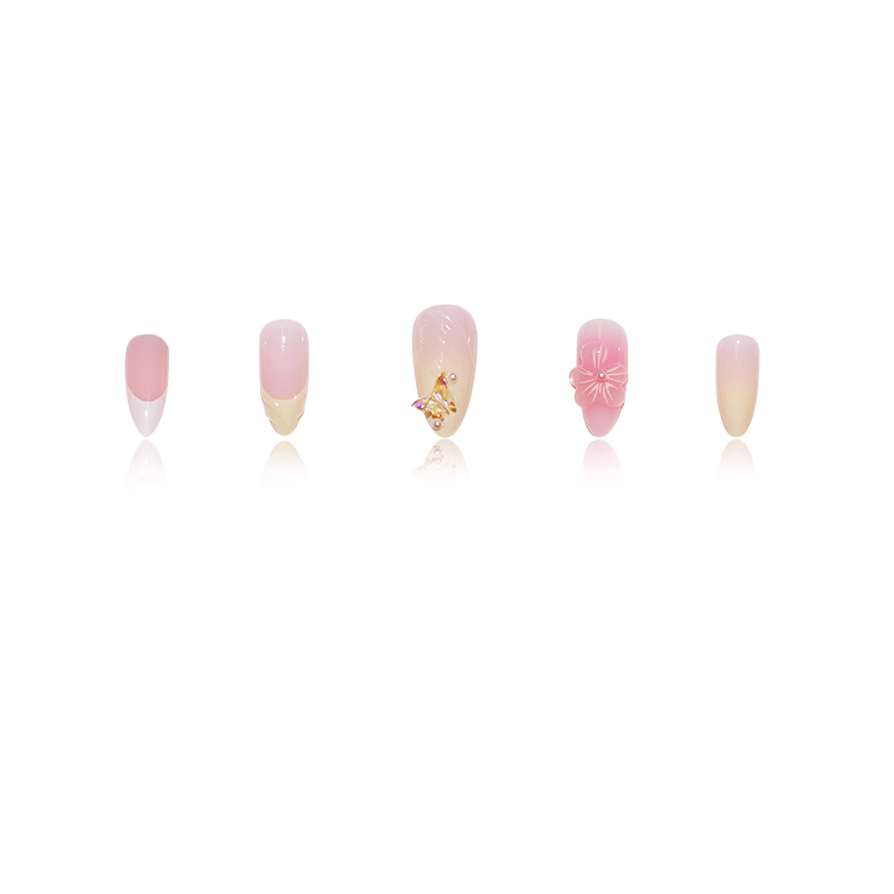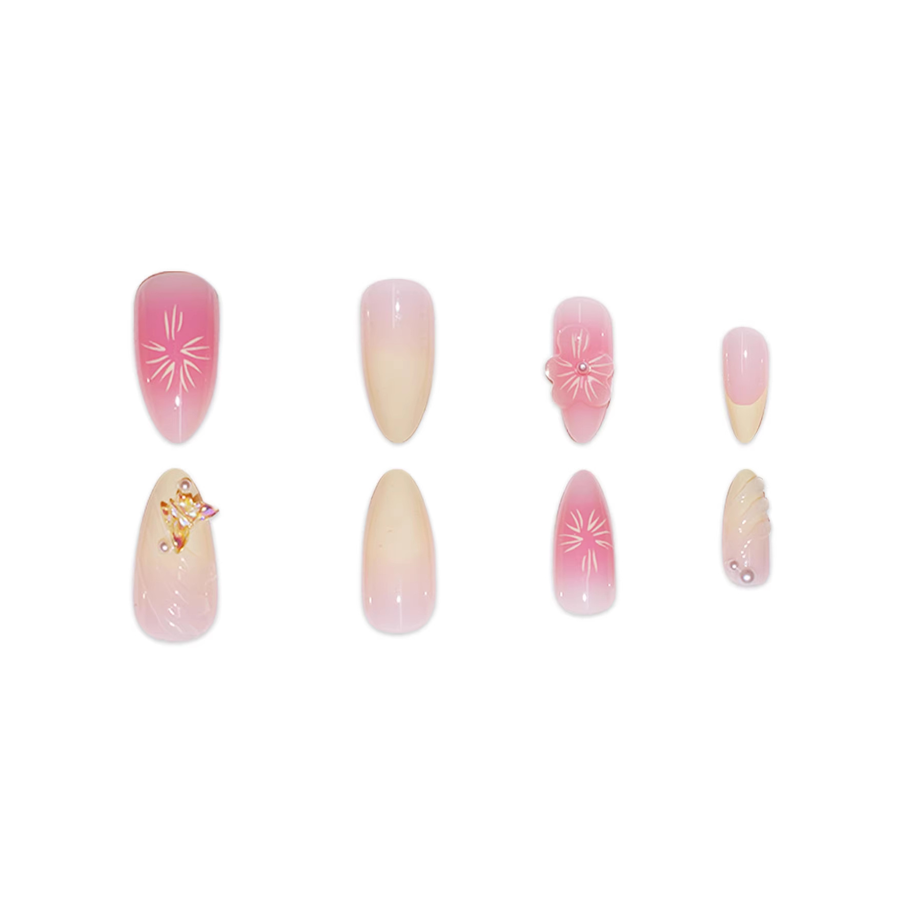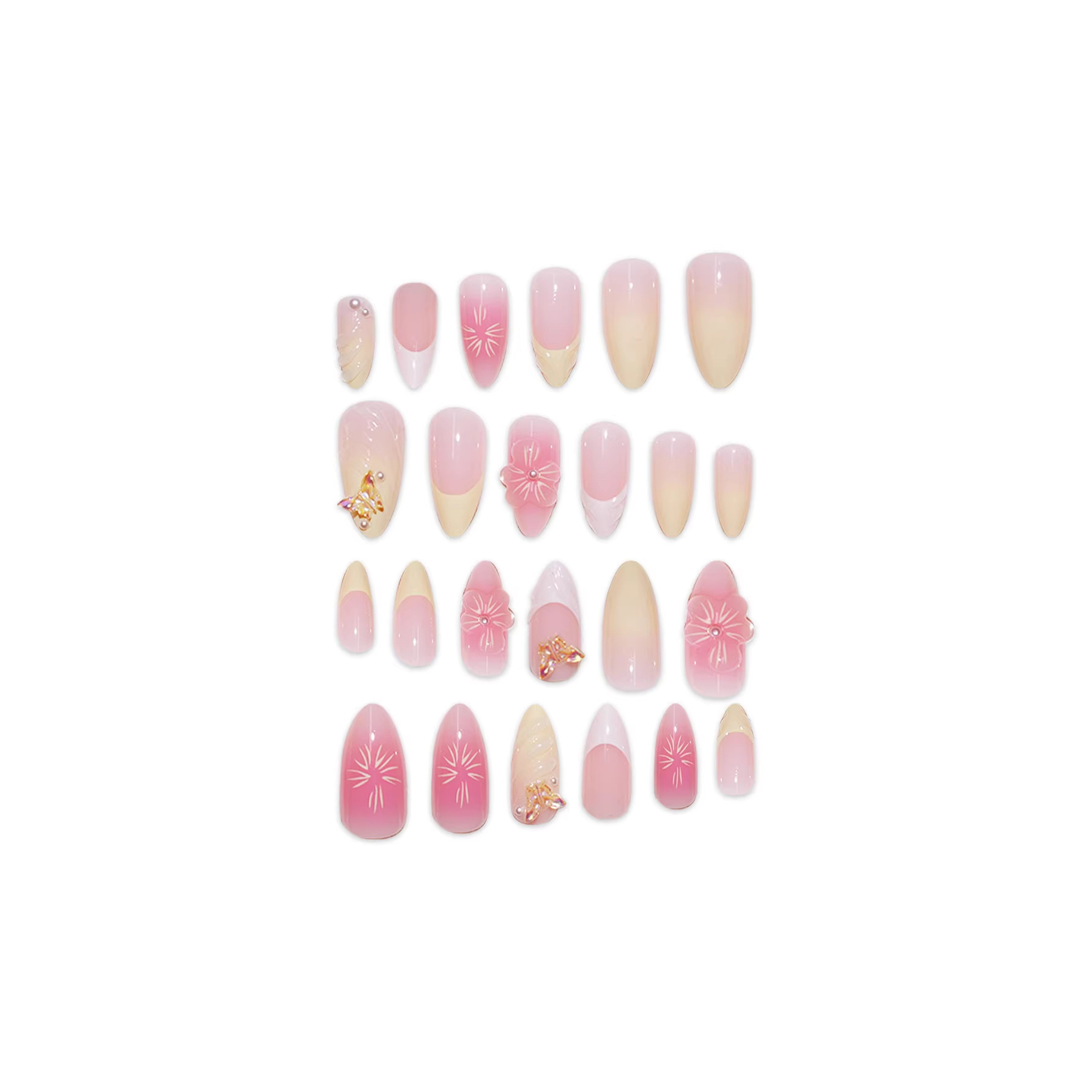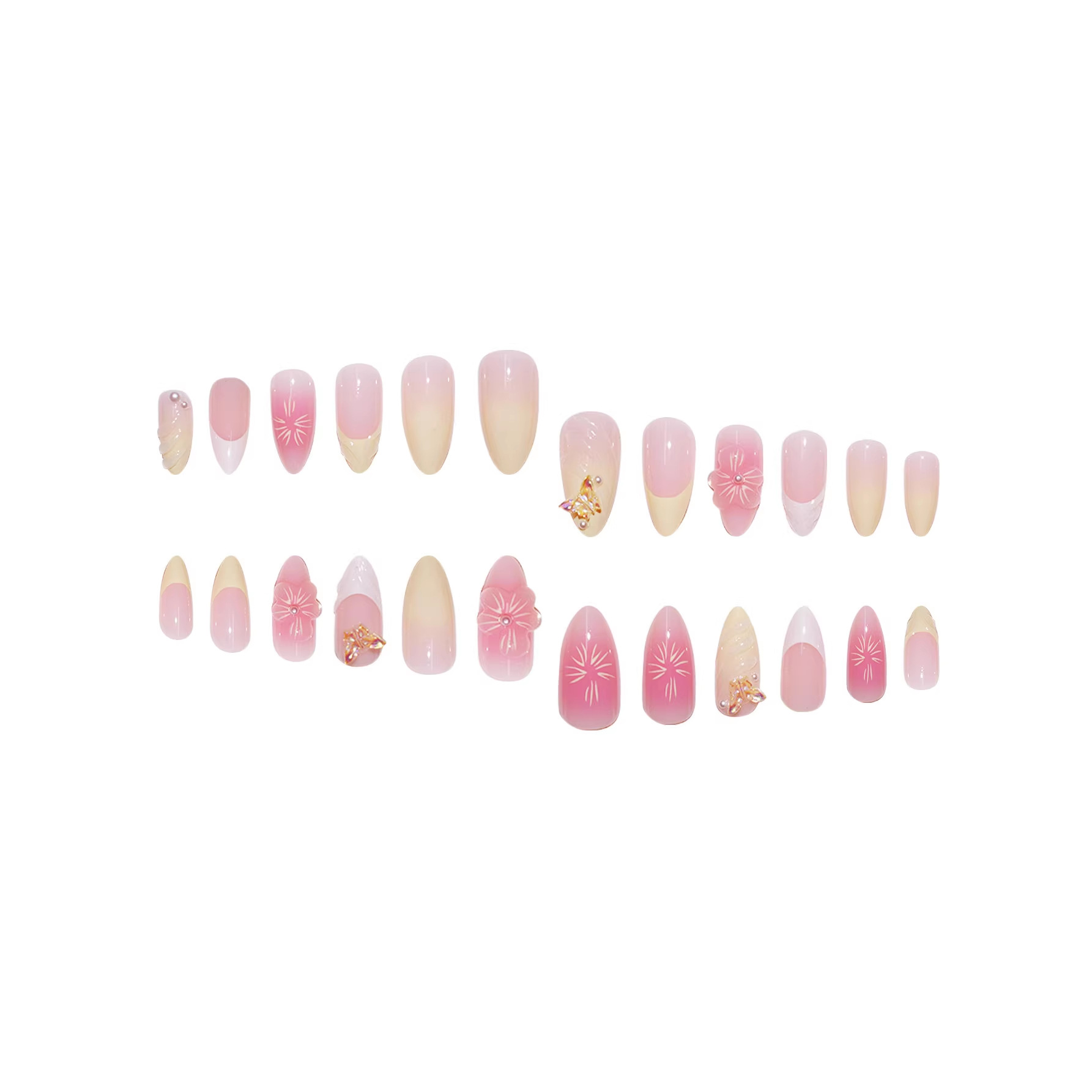 跨境热售杏仁型假指甲3D立体感甜美花朵蝴蝶穿戴甲可拆卸成品批发