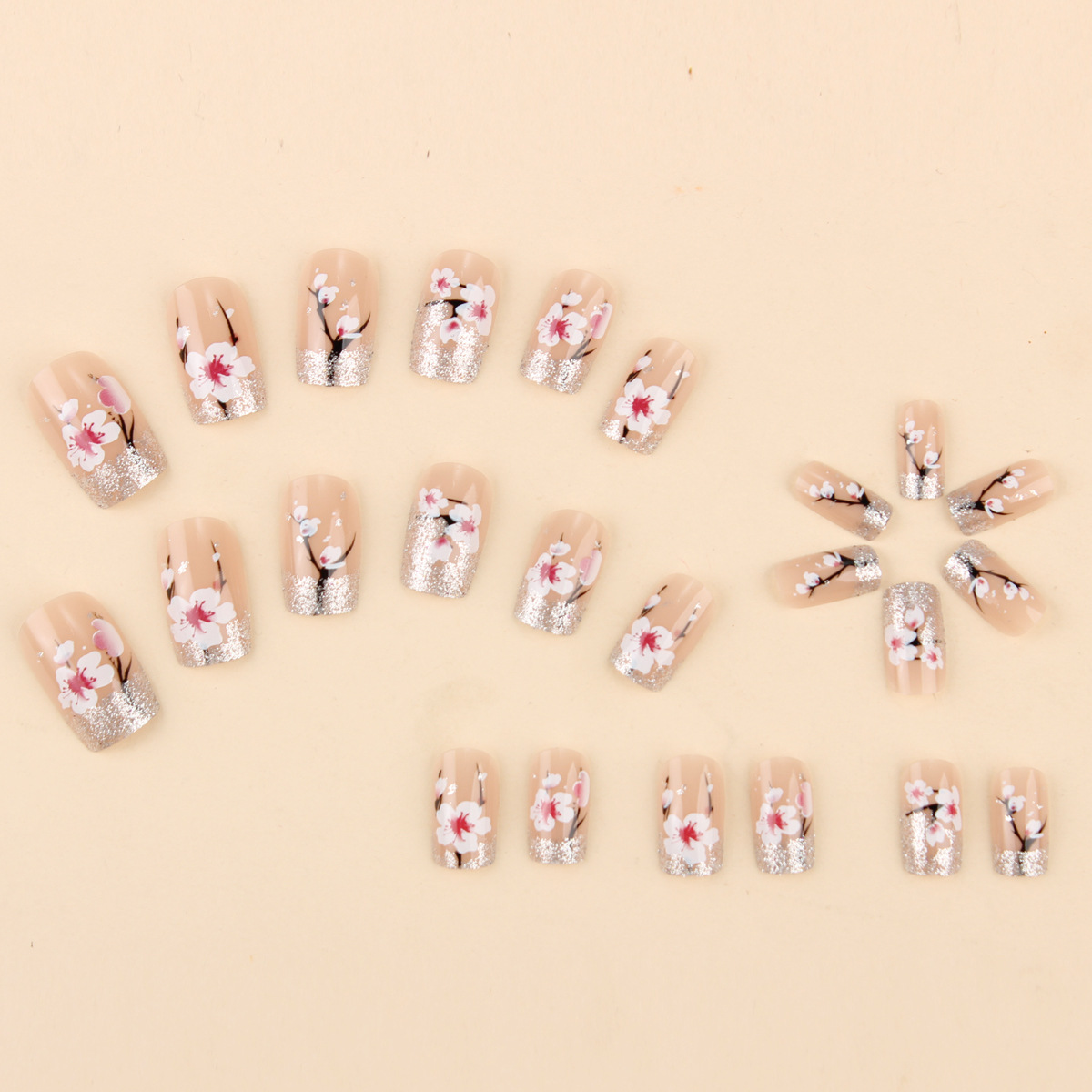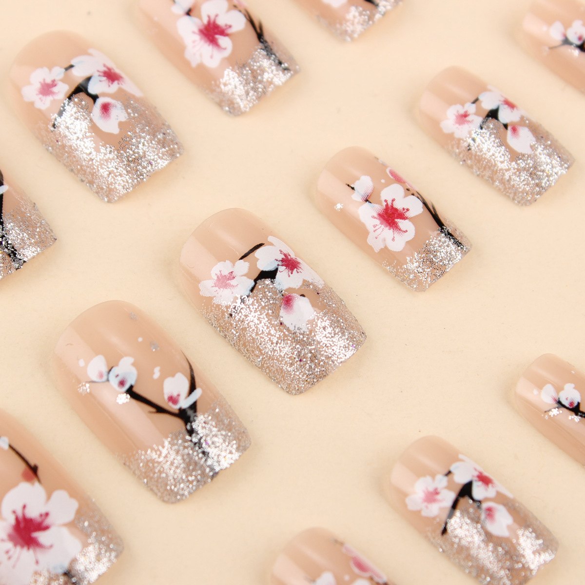 跨境穿戴甲裸粉色桃花美甲银色闪桃林假指甲中长方形甲片批发